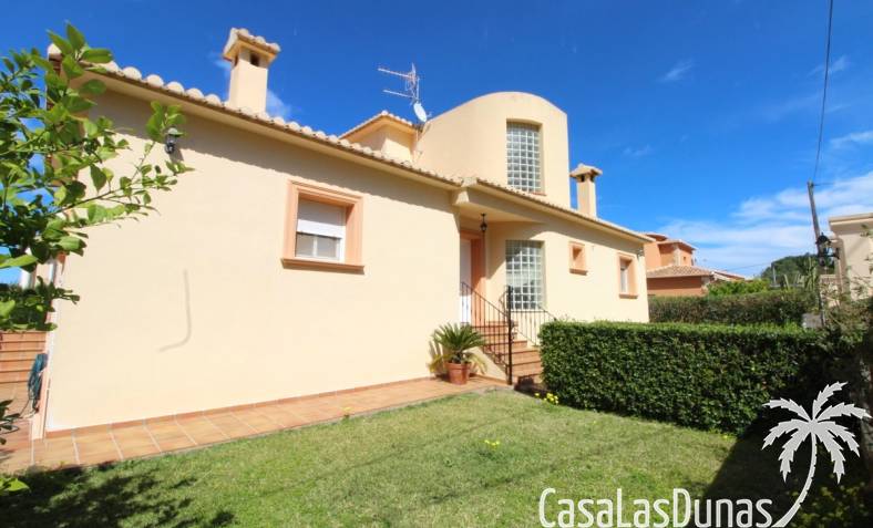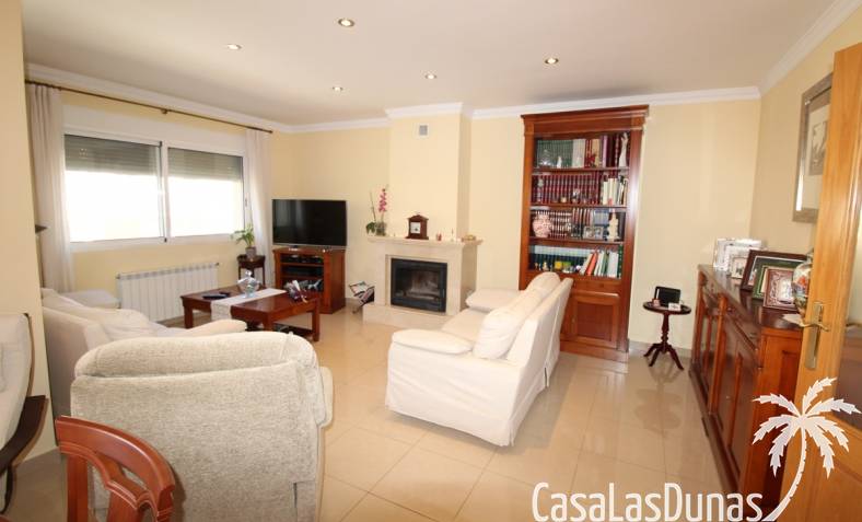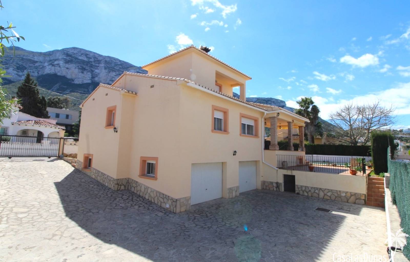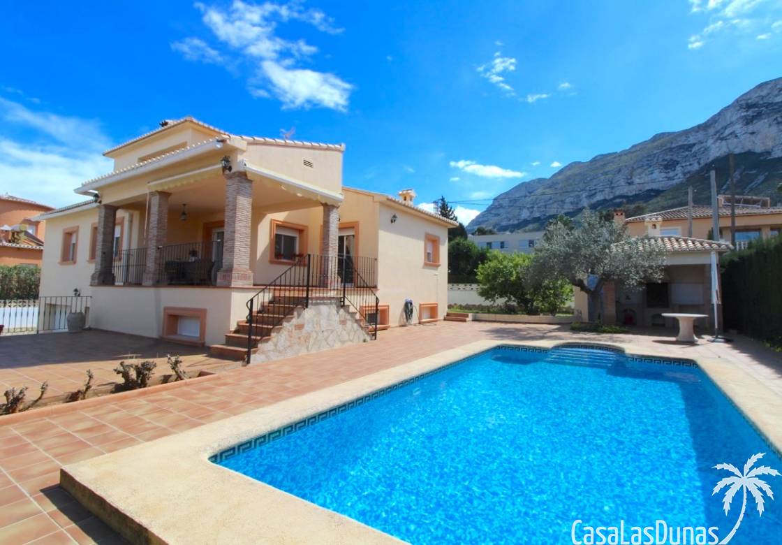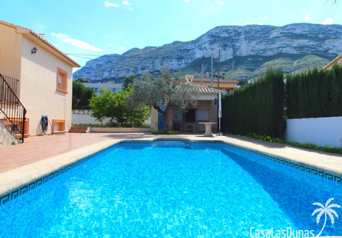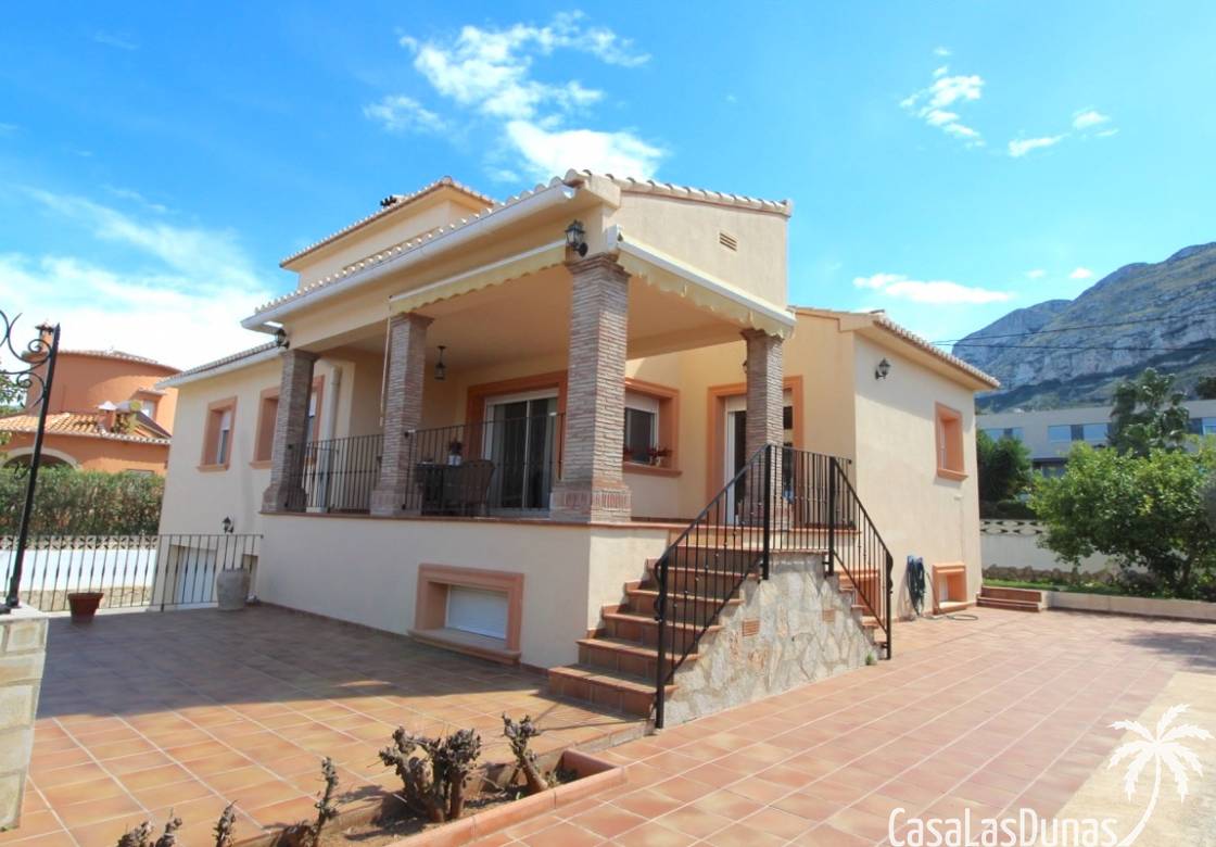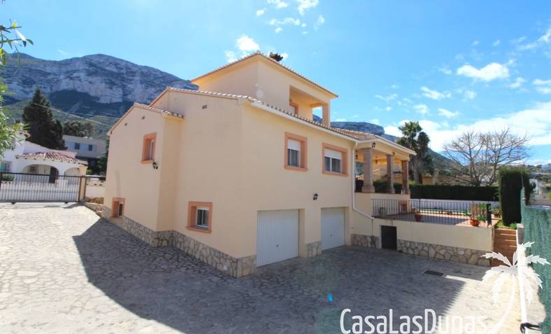 Vacker villa till salu i Dénia, byggd med högkvalitativa material och belägen i ett lugnt och populärt bostadsområde med utsikt över Montgó och gott om solsken året runt. Fastigheten har en lättskött trädgård med pool, grillplats, täckt terrass och ett dubbelgarage. Invändigt är villan fördelad på tre våningar, inklusive ett rymligt vardagsrum/matsal med öppen spis, ett fullt utrustat kök och flera sovrum och badrum. Övre våningen erbjuder ett sovrum med klädkammare, badrum och en terrass med vacker utsikt, medan källaren består av ytterligare rum och garaget. Huset är utrustat med centralvärme och luftkonditionering och är inflyttningsklart.