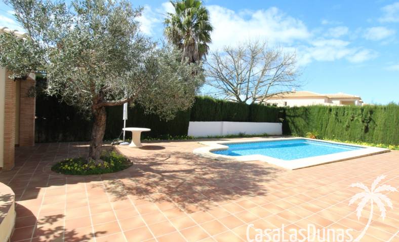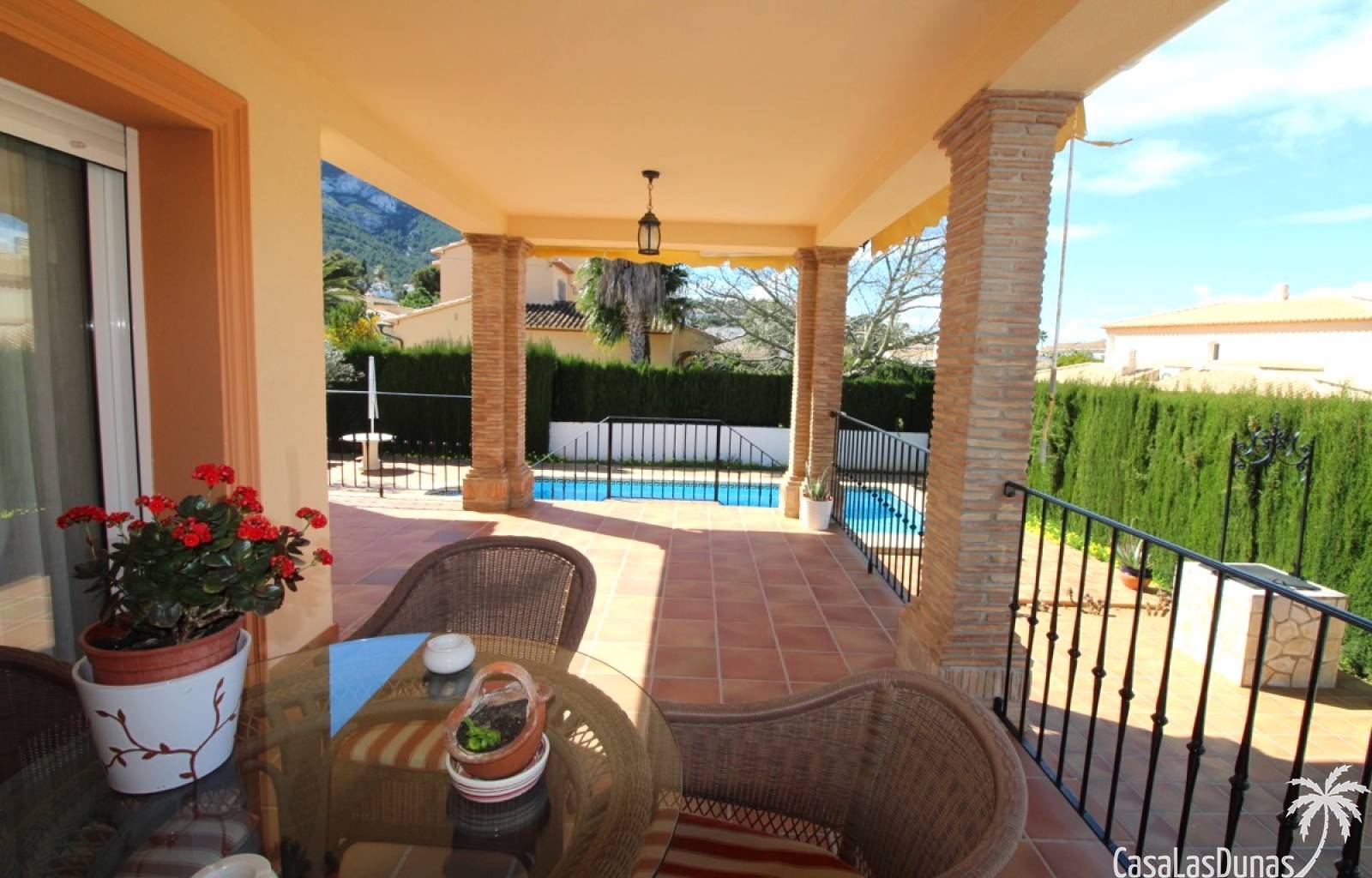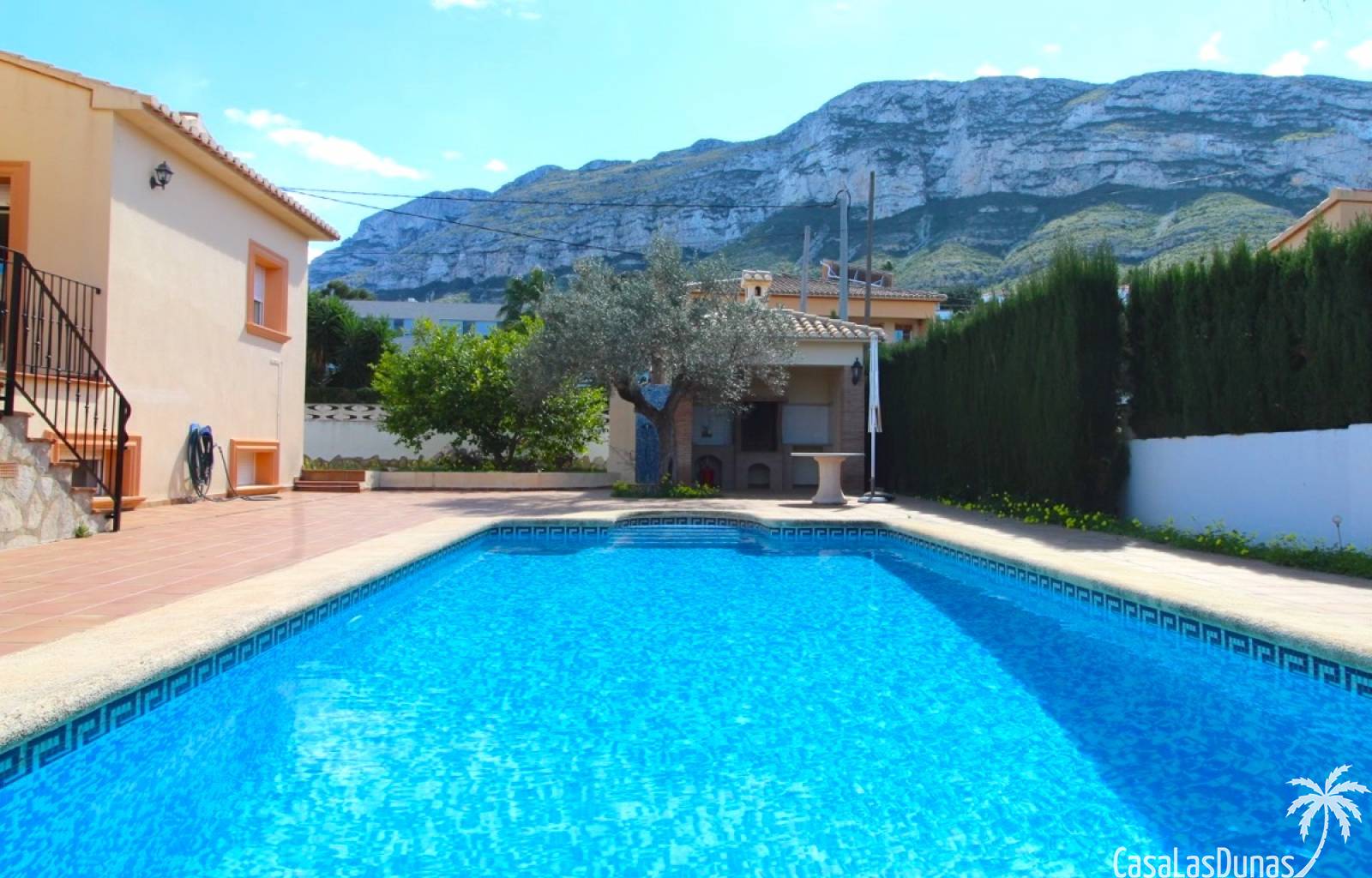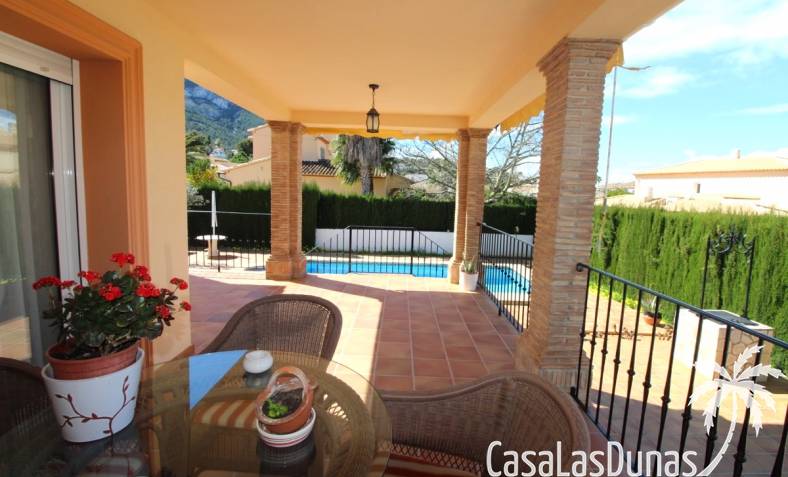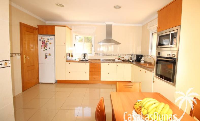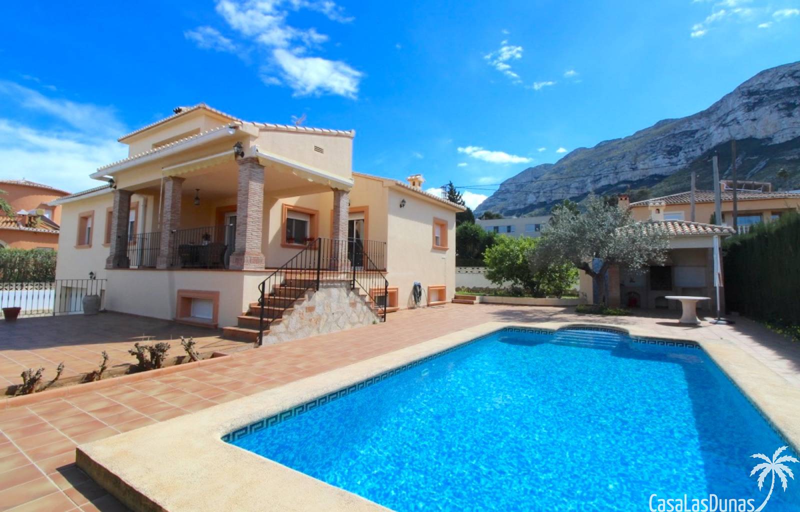 Vacker villa till salu i Dénia, byggd med högkvalitativa material och belägen i ett lugnt och populärt bostadsområde med utsikt över Montgó och gott om solsken året runt. Fastigheten har en lättskött trädgård med pool, grillplats, täckt terrass och ett dubbelgarage. Invändigt är villan fördelad på tre våningar, inklusive ett rymligt vardagsrum/matsal med öppen spis, ett fullt utrustat kök och flera sovrum och badrum. Övre våningen erbjuder ett sovrum med klädkammare, badrum och en terrass med vacker utsikt, medan källaren består av ytterligare rum och garaget. Huset är utrustat med centralvärme och luftkonditionering och är inflyttningsklart.