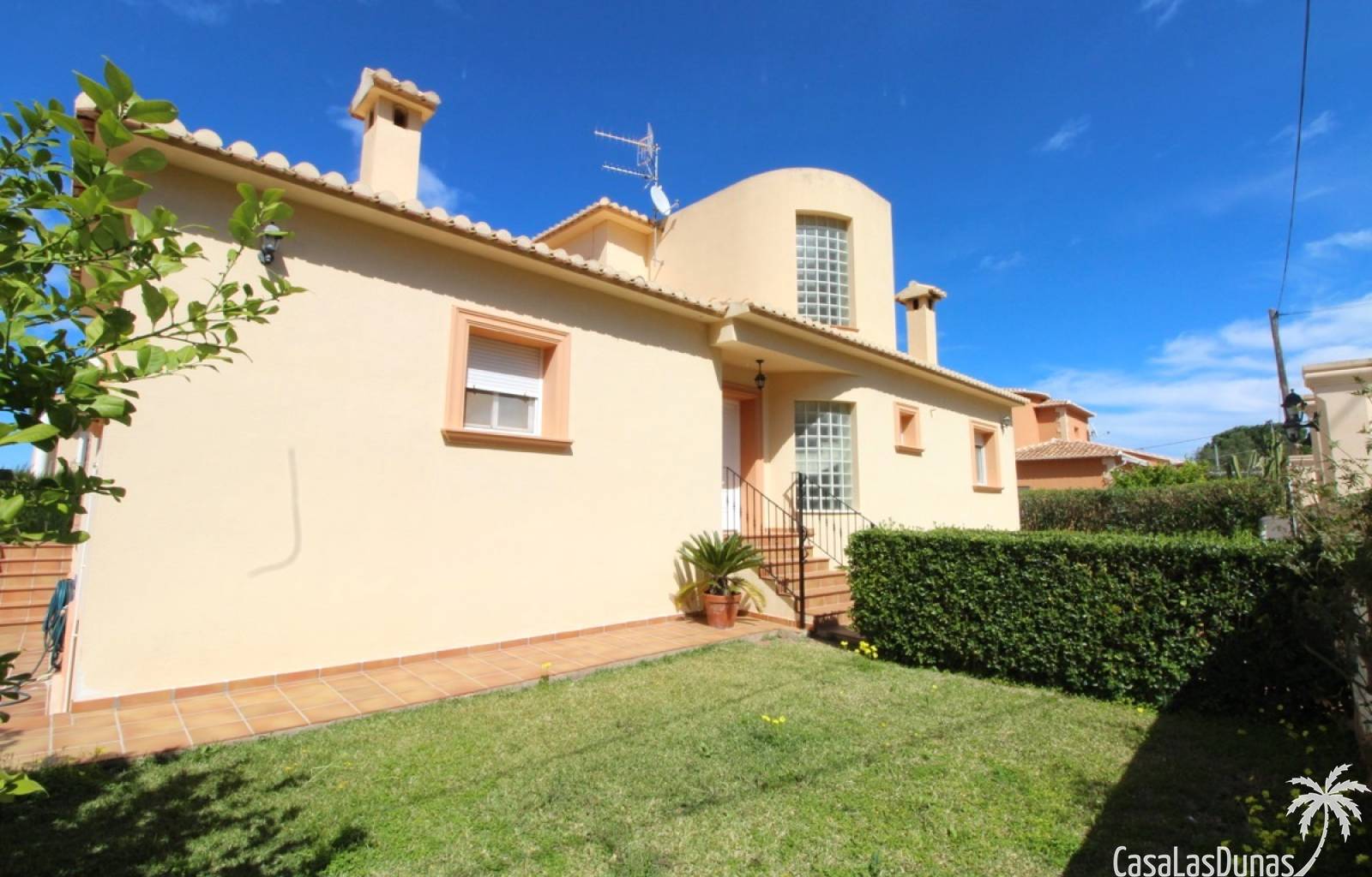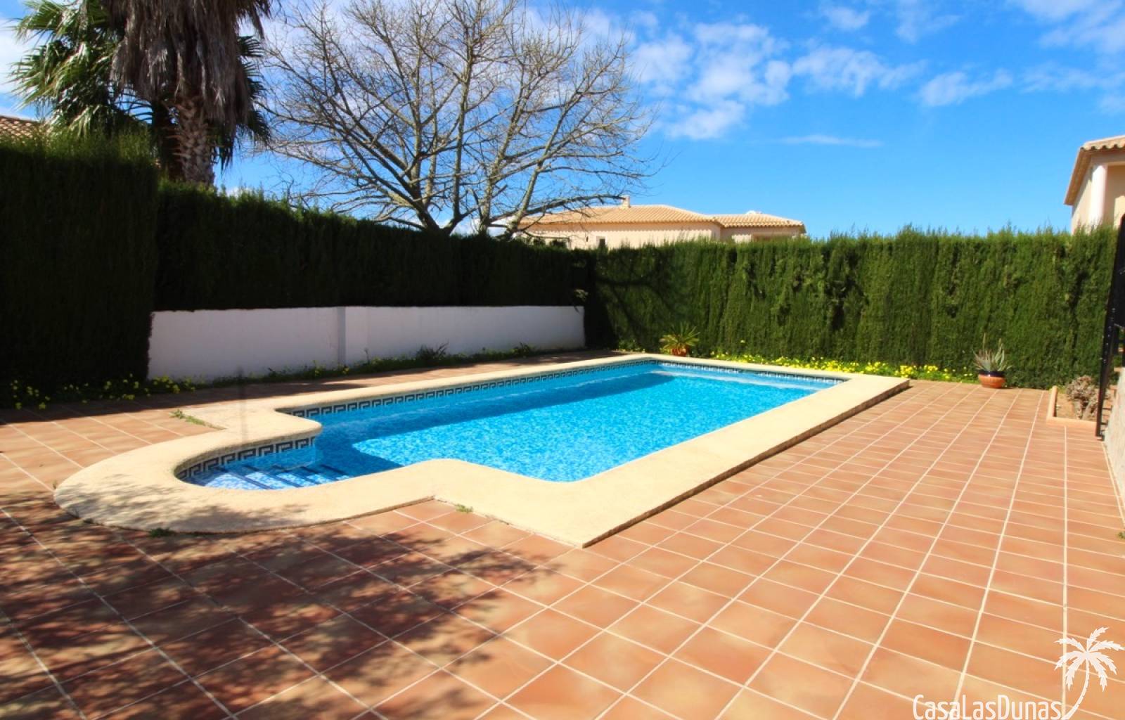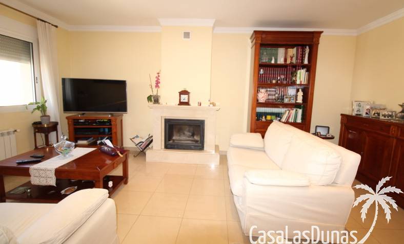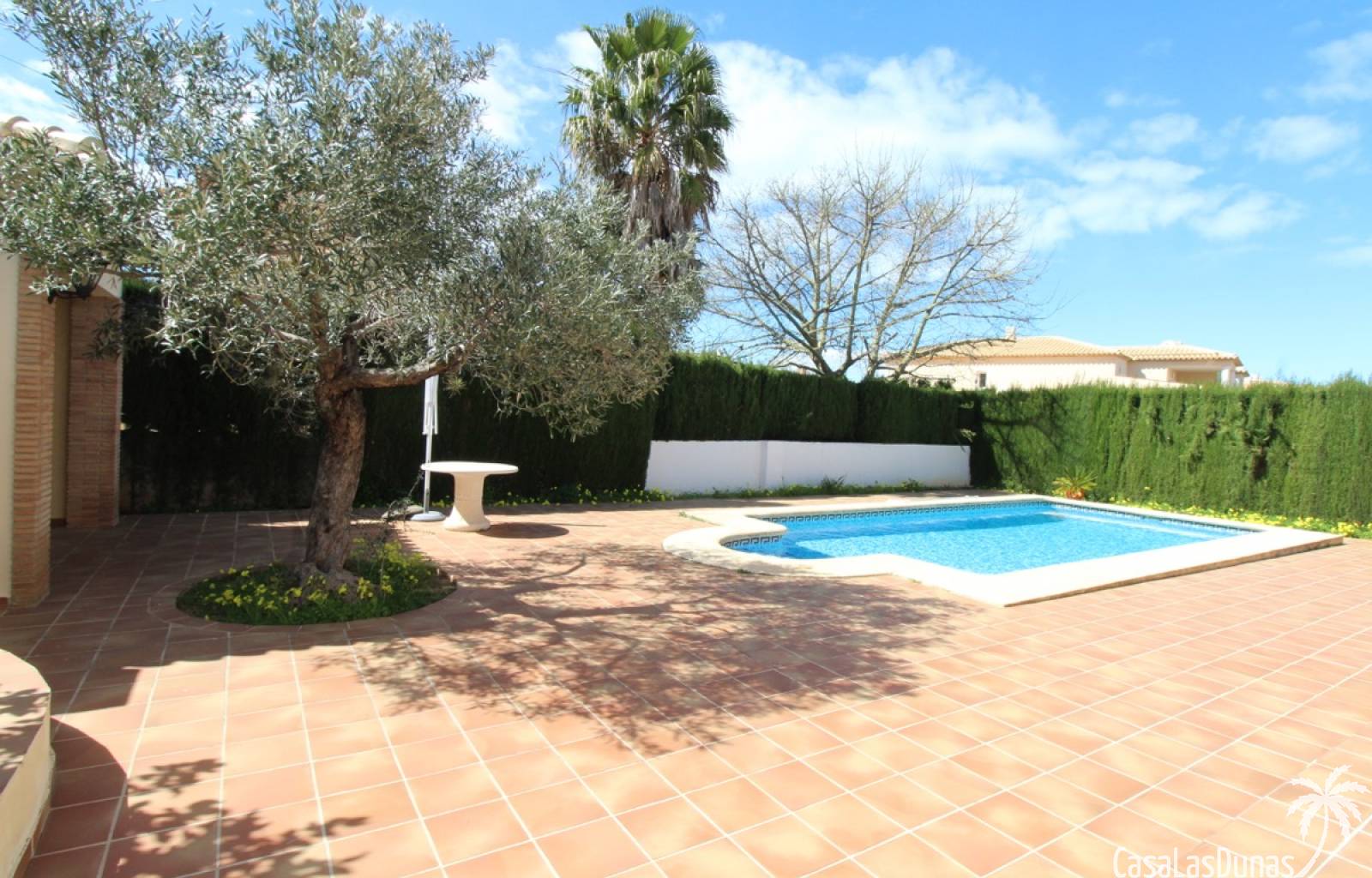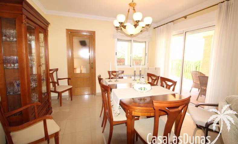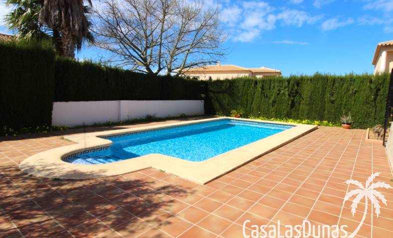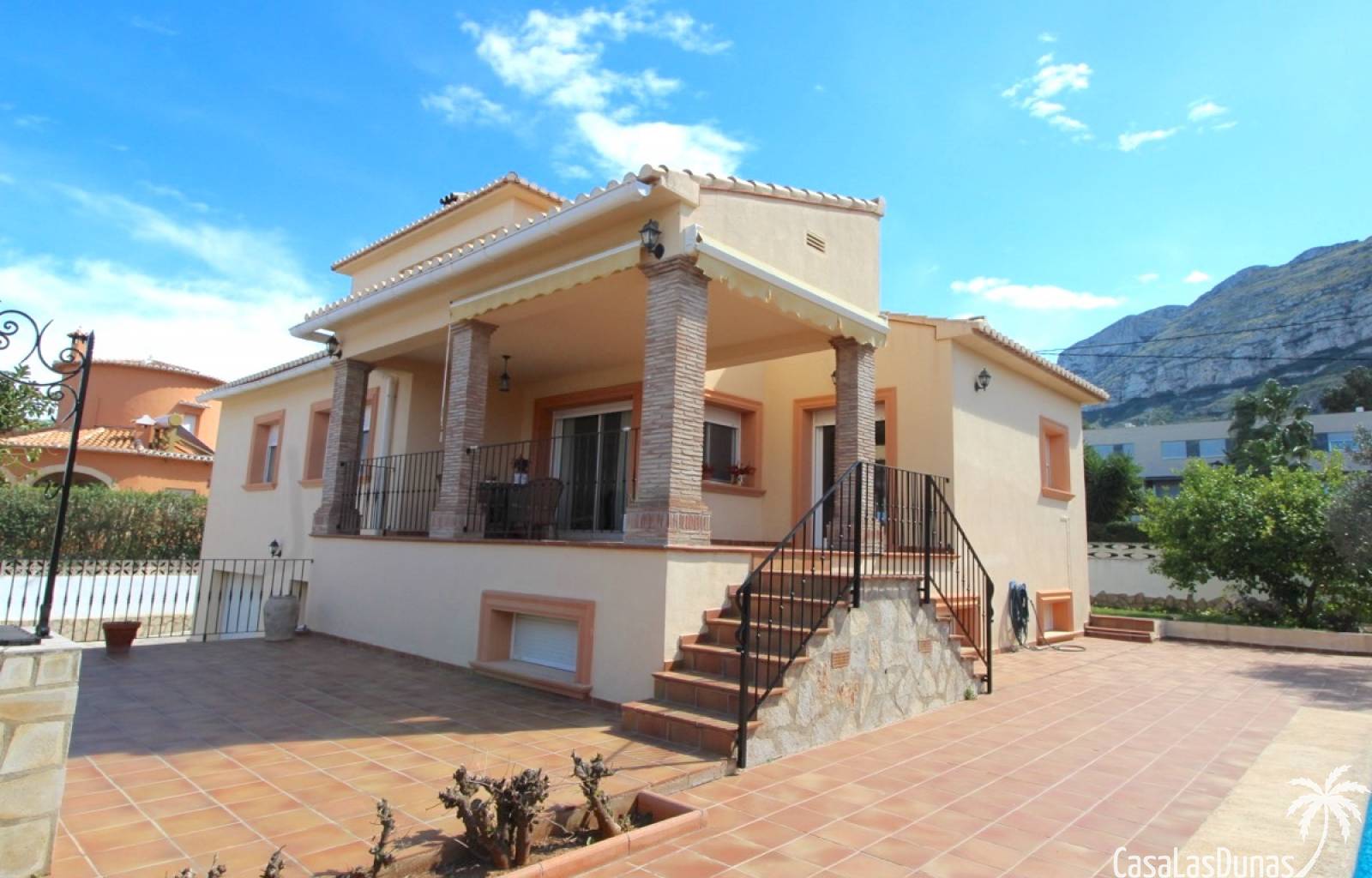 Vacker villa till salu i Dénia, byggd med högkvalitativa material och belägen i ett lugnt och populärt bostadsområde med utsikt över Montgó och gott om solsken året runt. Fastigheten har en lättskött trädgård med pool, grillplats, täckt terrass och ett dubbelgarage. Invändigt är villan fördelad på tre våningar, inklusive ett rymligt vardagsrum/matsal med öppen spis, ett fullt utrustat kök och flera sovrum och badrum. Övre våningen erbjuder ett sovrum med klädkammare, badrum och en terrass med vacker utsikt, medan källaren består av ytterligare rum och garaget. Huset är utrustat med centralvärme och luftkonditionering och är inflyttningsklart.