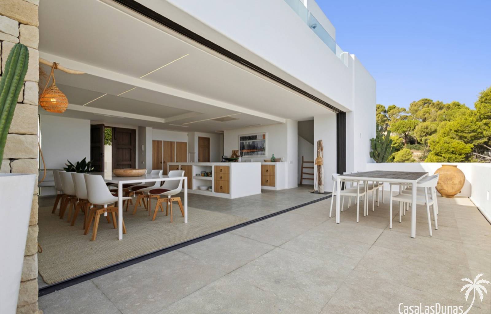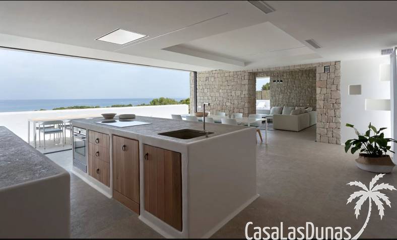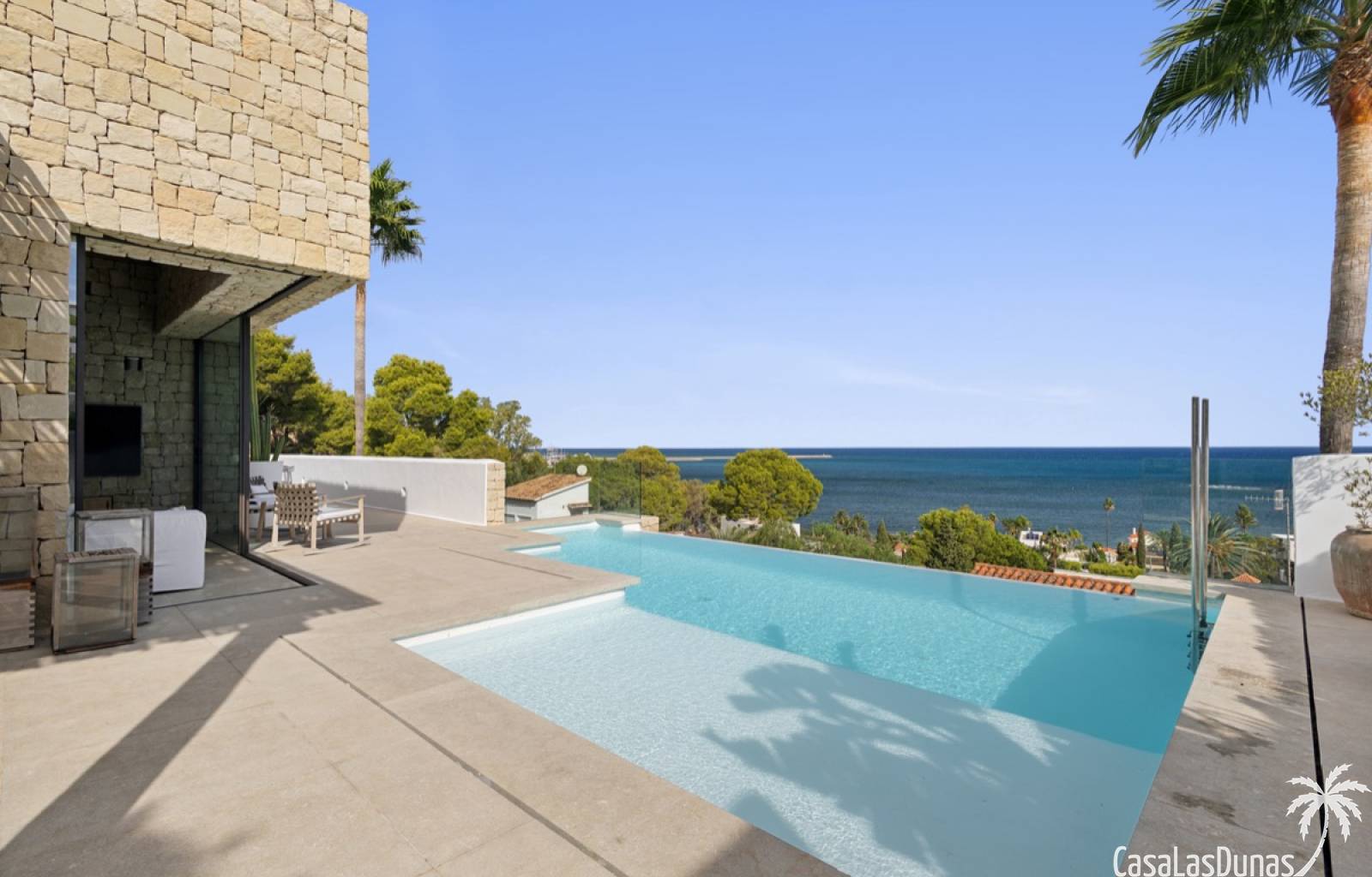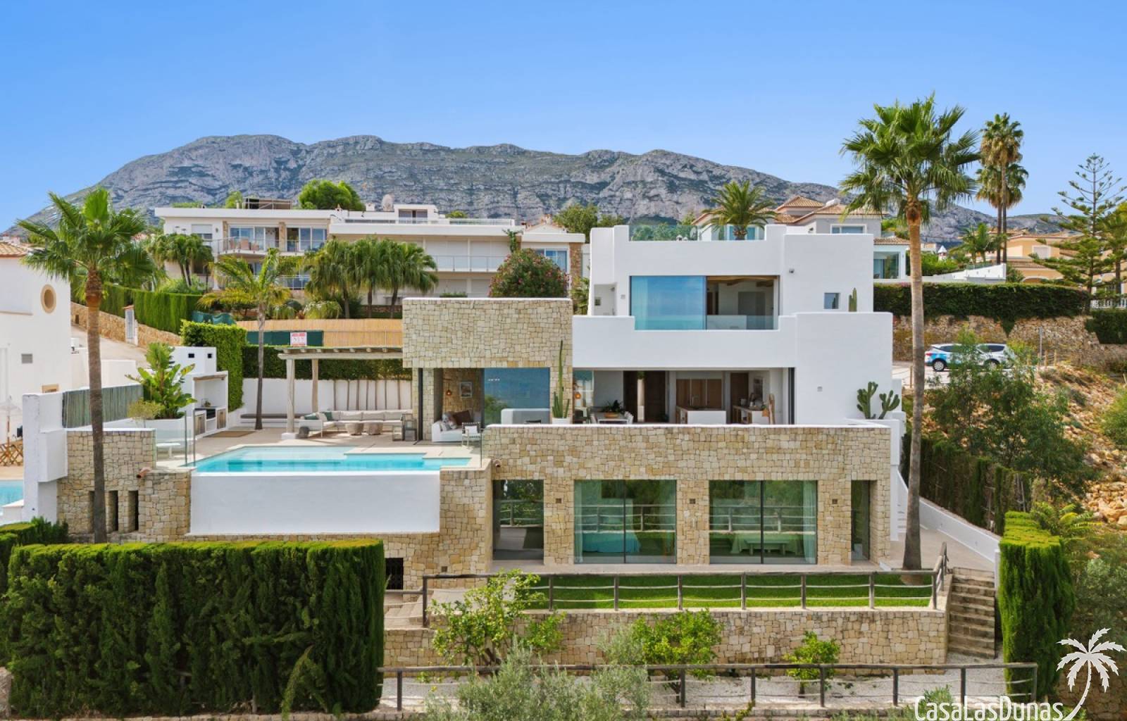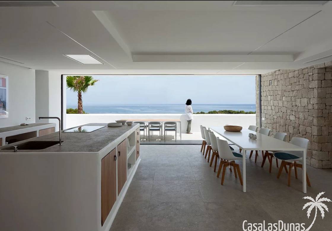 Prachtige villa in Ibiza stijl met panoramisch uitzicht op zee gelegen in de populaire woonwijk van San Nicolas op steenworp afstand van de zee, de jachthaven en het centrum van Denia. Het pand is ontworpen door een gerenommeerde architect en combineert strakke witte lijnen met hout en natuursteen wat voor veel warmte zorgt. Vrijwel alle vertrekken en kamers van het huis bieden prachtig zeezicht en beschikken over indrukwekkende raampartijen die grotendeels in de muur verdwijnen. Op woonniveau is een open keuken met eetgedeelte, woonkamer met open haard en gastentoilet. Het interieur vloeit naadloos over in de ruime terrassen met privé zwembad en buitenkeuken, allemaal op gelijke hoogte van het woongedeelte. Op de bovenste etage bevindt zich de elegante hoofdslaapkamer met en suite badkamer en terras. Een verdieping beneden het woongedeelte bevinden zich nog 3 slaapkamers meer met eigen badkamers en een extra woonkamer (of 5e slaapkamer) met raam naar het zwembad. Op dit niveau is tevens een wasruimte, technische ruimte en berging. Tot slot is er een mooi dakterras met chill out.