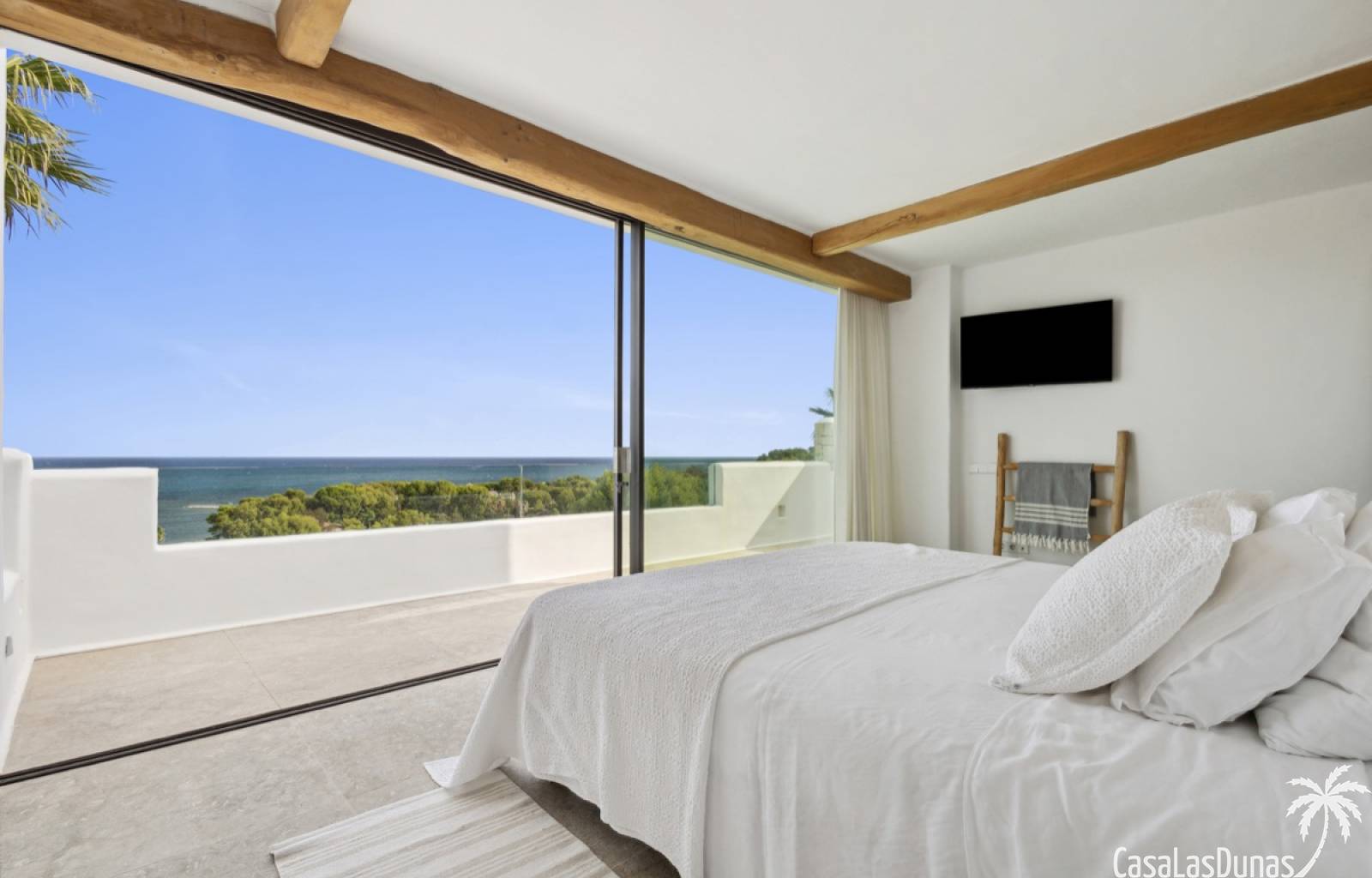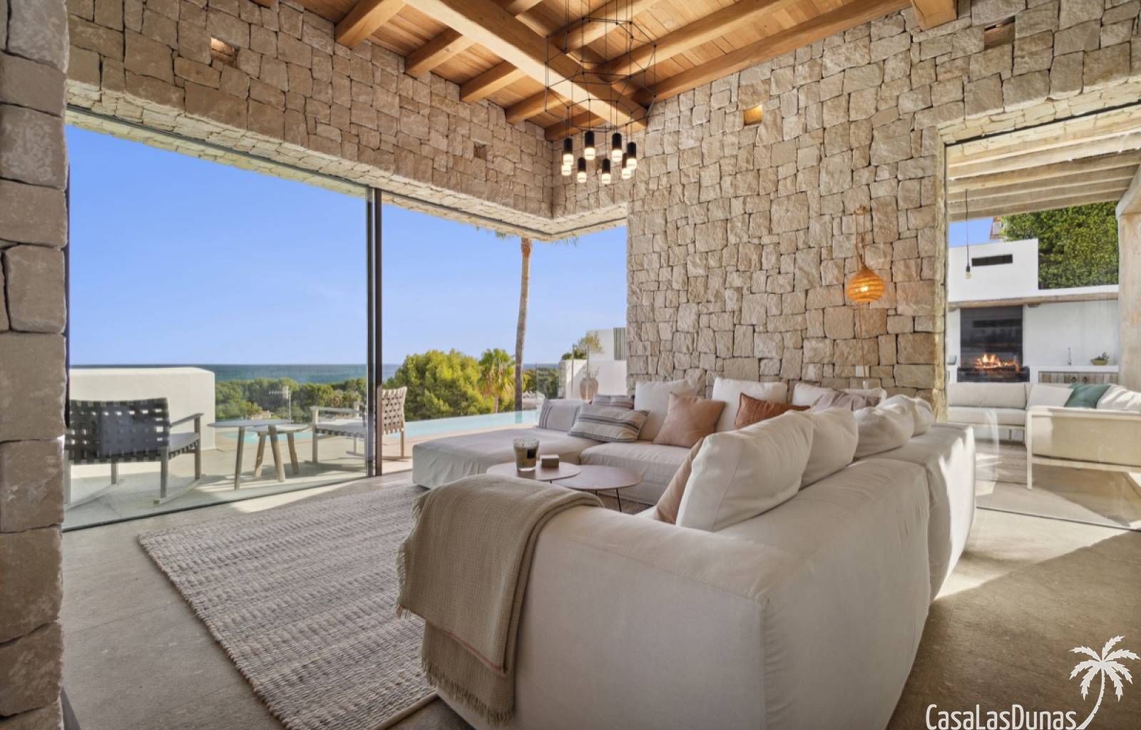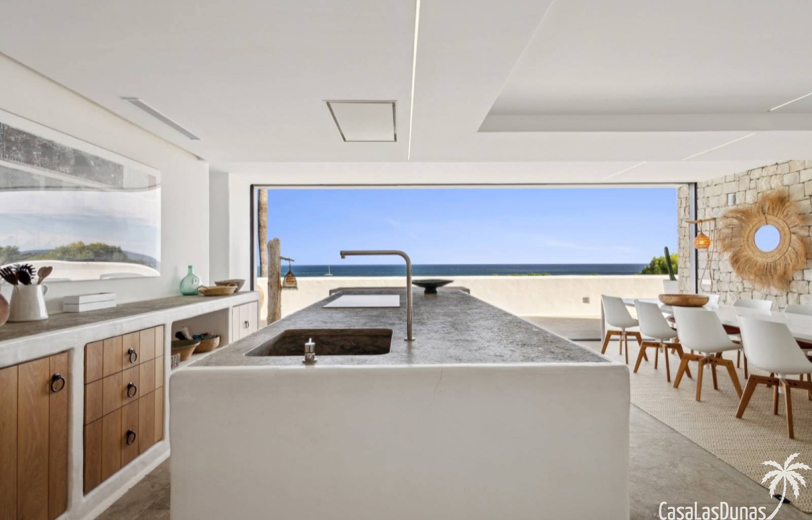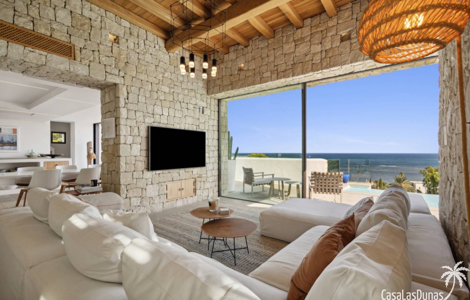 Prachtige villa in Ibiza stijl met panoramisch uitzicht op zee gelegen in de populaire woonwijk van San Nicolas op steenworp afstand van de zee, de jachthaven en het centrum van Denia. Het pand is ontworpen door een gerenommeerde architect en combineert strakke witte lijnen met hout en natuursteen wat voor veel warmte zorgt. Vrijwel alle vertrekken en kamers van het huis bieden prachtig zeezicht en beschikken over indrukwekkende raampartijen die grotendeels in de muur verdwijnen. Op woonniveau is een open keuken met eetgedeelte, woonkamer met open haard en gastentoilet. Het interieur vloeit naadloos over in de ruime terrassen met privé zwembad en buitenkeuken, allemaal op gelijke hoogte van het woongedeelte. Op de bovenste etage bevindt zich de elegante hoofdslaapkamer met en suite badkamer en terras. Een verdieping beneden het woongedeelte bevinden zich nog 3 slaapkamers meer met eigen badkamers en een extra woonkamer (of 5e slaapkamer) met raam naar het zwembad. Op dit niveau is tevens een wasruimte, technische ruimte en berging. Tot slot is er een mooi dakterras met chill out.
