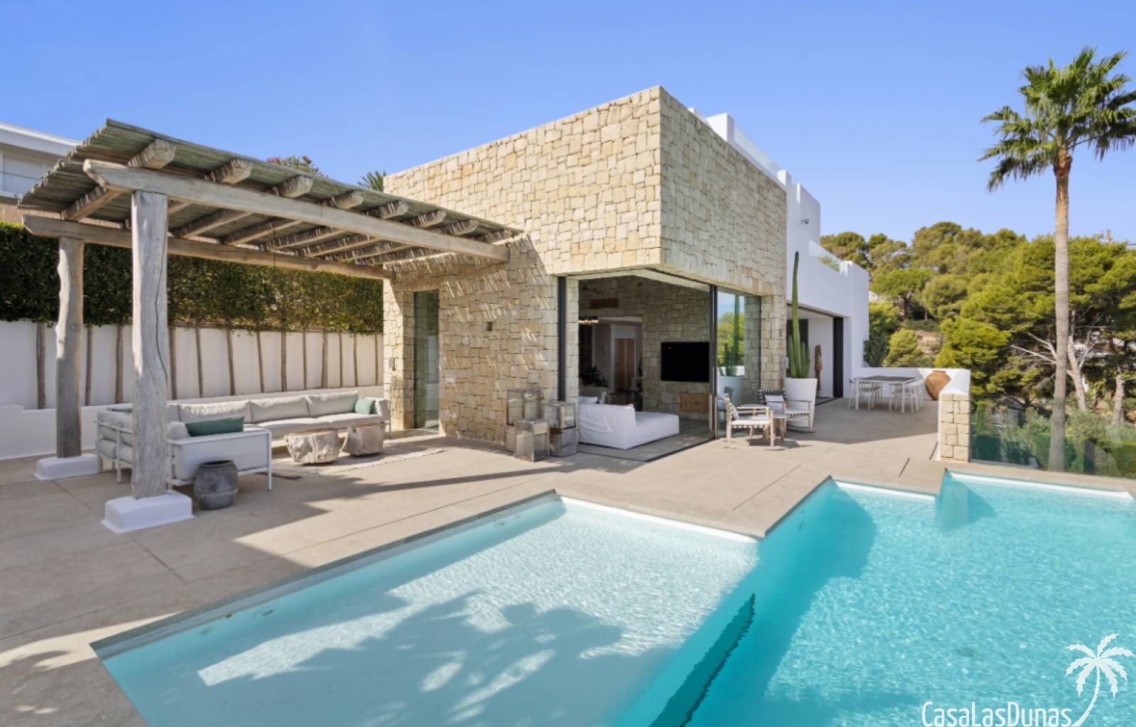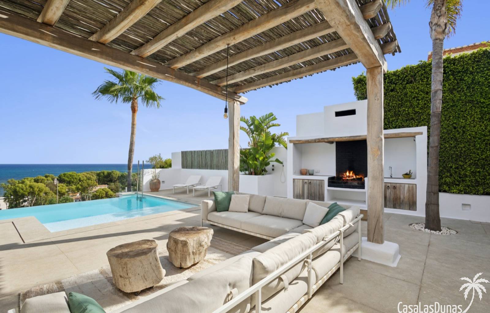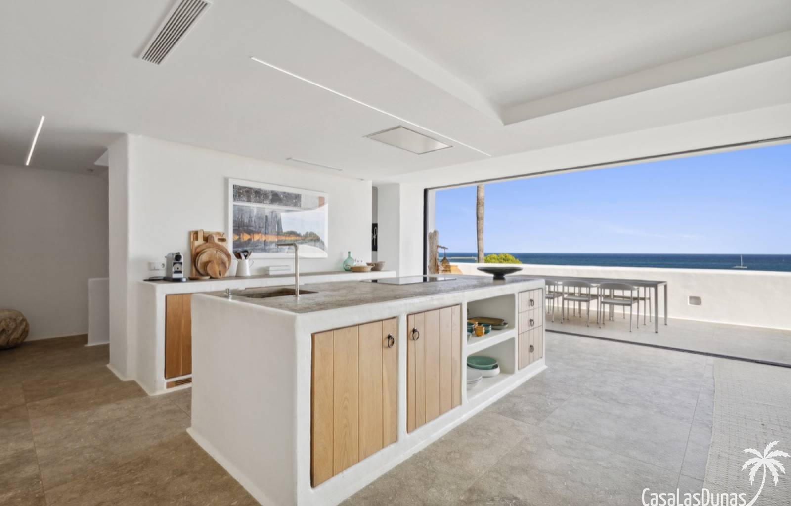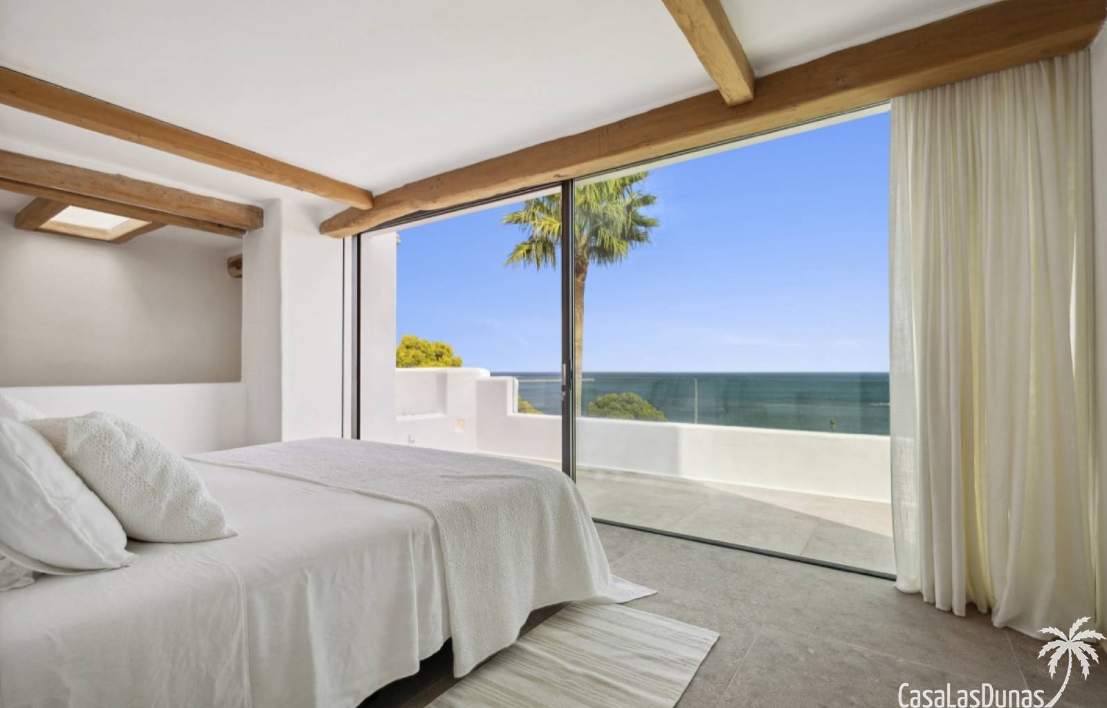 Prachtige villa in Ibiza stijl met panoramisch uitzicht op zee gelegen in de populaire woonwijk van San Nicolas op steenworp afstand van de zee, de jachthaven en het centrum van Denia. Het pand is ontworpen door een gerenommeerde architect en combineert strakke witte lijnen met hout en natuursteen wat voor veel warmte zorgt. Vrijwel alle vertrekken en kamers van het huis bieden prachtig zeezicht en beschikken over indrukwekkende raampartijen die grotendeels in de muur verdwijnen. Op woonniveau is een open keuken met eetgedeelte, woonkamer met open haard en gastentoilet. Het interieur vloeit naadloos over in de ruime terrassen met privé zwembad en buitenkeuken, allemaal op gelijke hoogte van het woongedeelte. Op de bovenste etage bevindt zich de elegante hoofdslaapkamer met en suite badkamer en terras. Een verdieping beneden het woongedeelte bevinden zich nog 3 slaapkamers meer met eigen badkamers en een extra woonkamer (of 5e slaapkamer) met raam naar het zwembad. Op dit niveau is tevens een wasruimte, technische ruimte en berging. Tot slot is er een mooi dakterras met chill out.