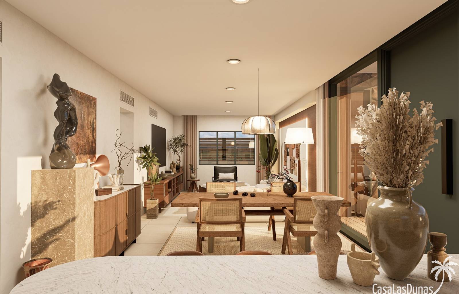 De woning bestaat uit een lichtrijke woon-/eetkamer, een modern ingerichte open keuken, twee slaapkamers met inbouwkasten, twee badkamers, een solarium (44 m²), een ruim terras met tuin, een privé zwembad en een privé parking.