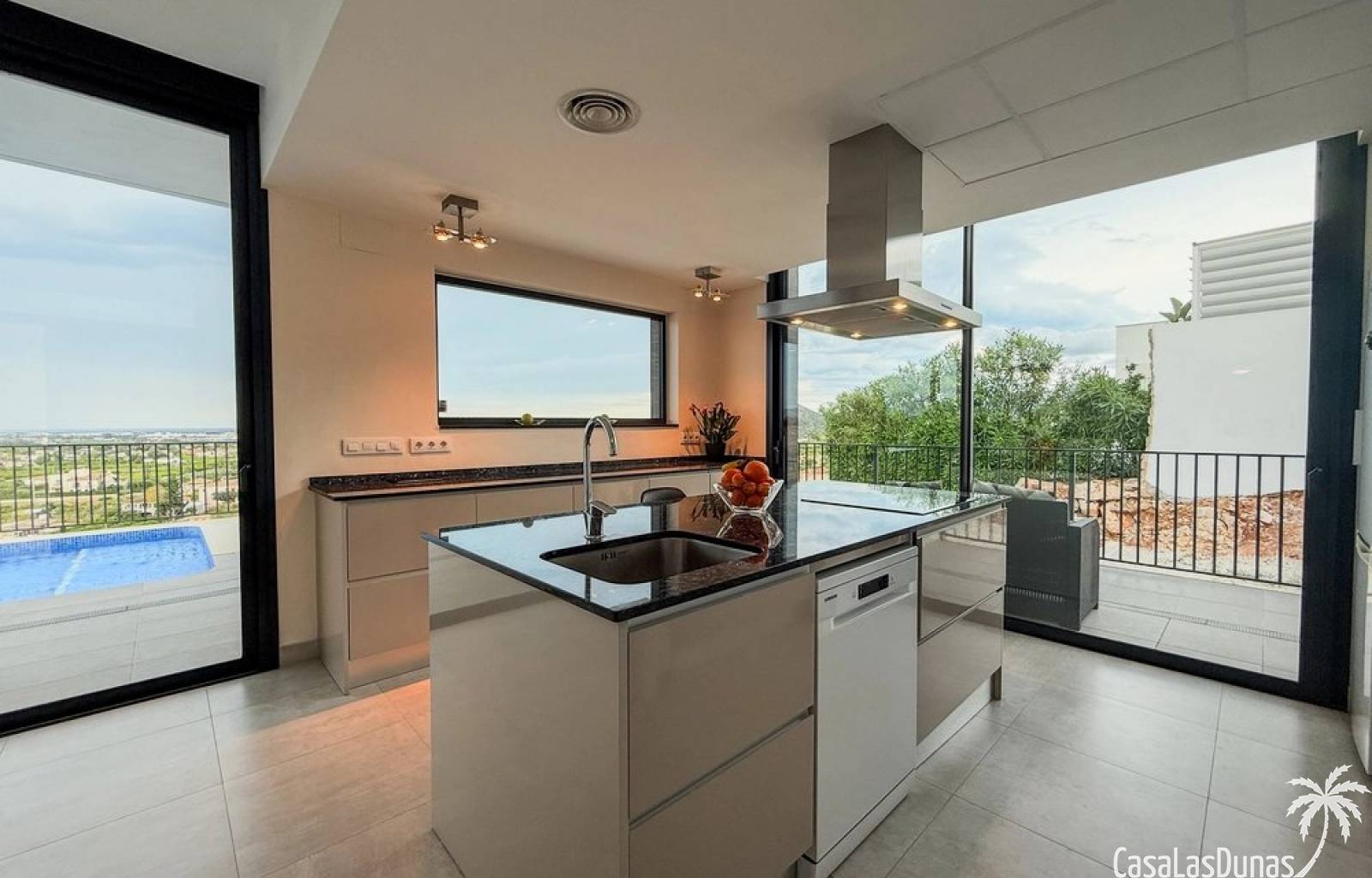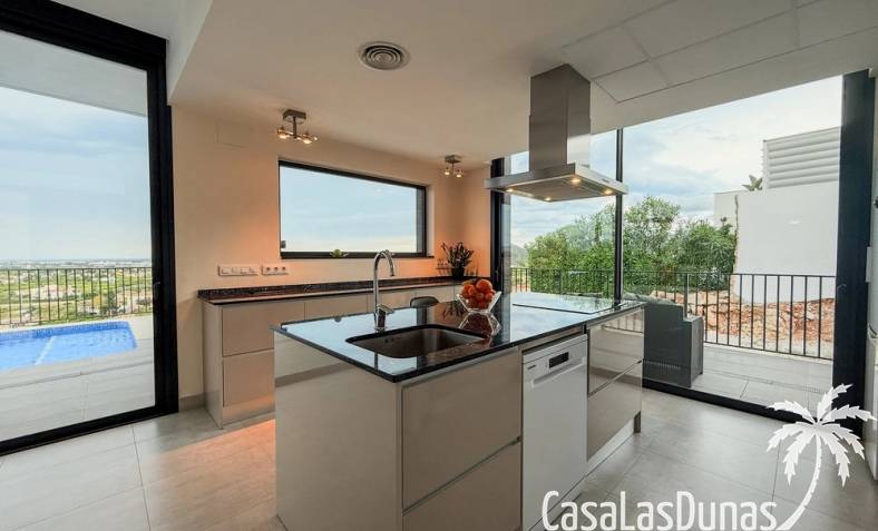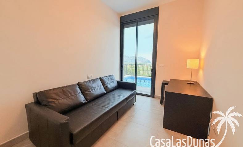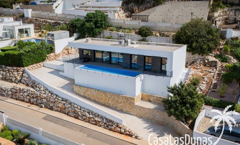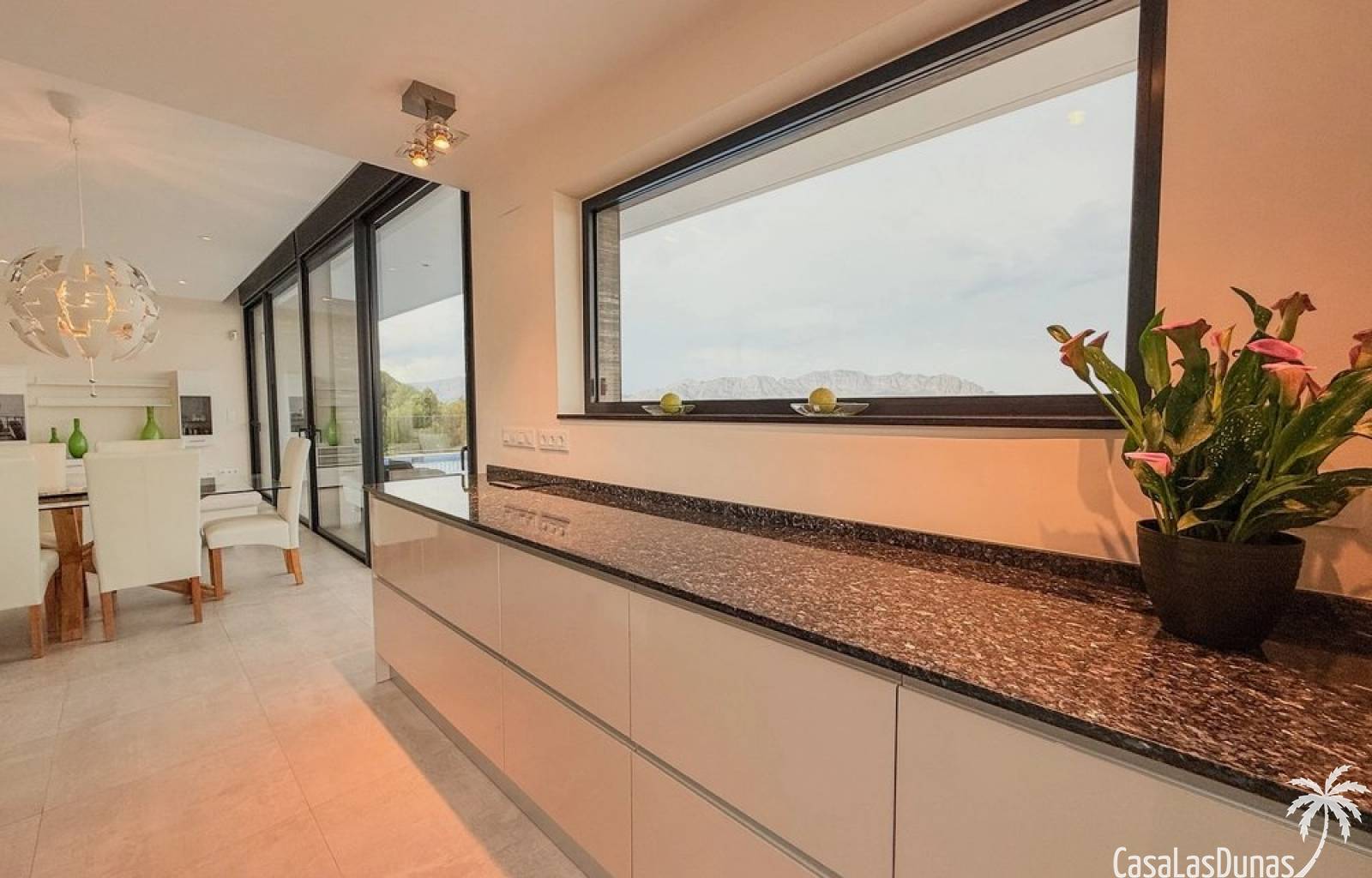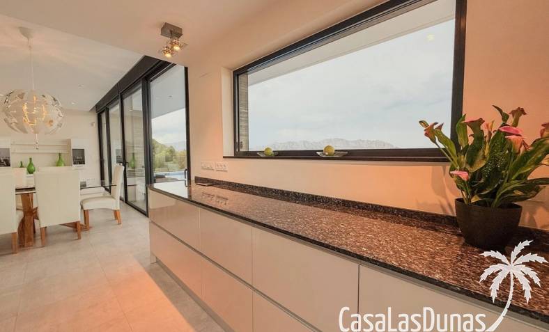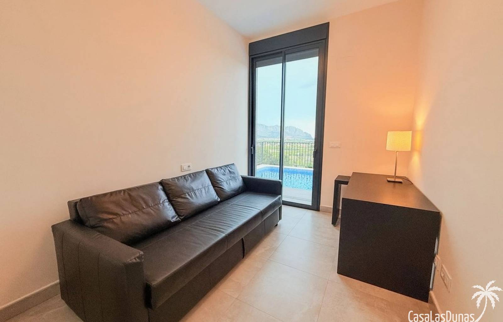 Deze moderne gelijkvloerse 3 slaapkamer villa met prachtig uitzicht op zee is gebouwd in 2023 in een populaire woonwijk van Pedreguer op 15 autominuten van de badplaatsen Denia en Javea. Er is een oprit met voldoende parkeergelegenheid en de villa zelf beschikt over een ruime woon/eetkamer open keuken en glazen deuren van vloer tot plafond die toegang bieden tot het zwembadterras met prachtig uitzicht over de vallei richting de kustlijn van Denia. De hoogwaardige luxe keuken in zachte, natuurlijke tinten integreert naadloos in de woonkamer. Elke slaapkamer is voorzien van royale inbouwkasten, terwijl de master suite een en-suite badkamer heeft. Comfort staat voorop: vloerverwarming, airconditioning (warm en koud) en individuele thermostaten in elke kamer zorgen voor een nauwkeurige klimaatregeling. De tuin is onderhoudsarm en beschikt over een prachtig zwembad van 3x11m. De woning profiteert ook van ledverlichting met dimmers, veiligheidsdeuren, pre-installatie voor zonnepanelen en hoogwaardige materialen.