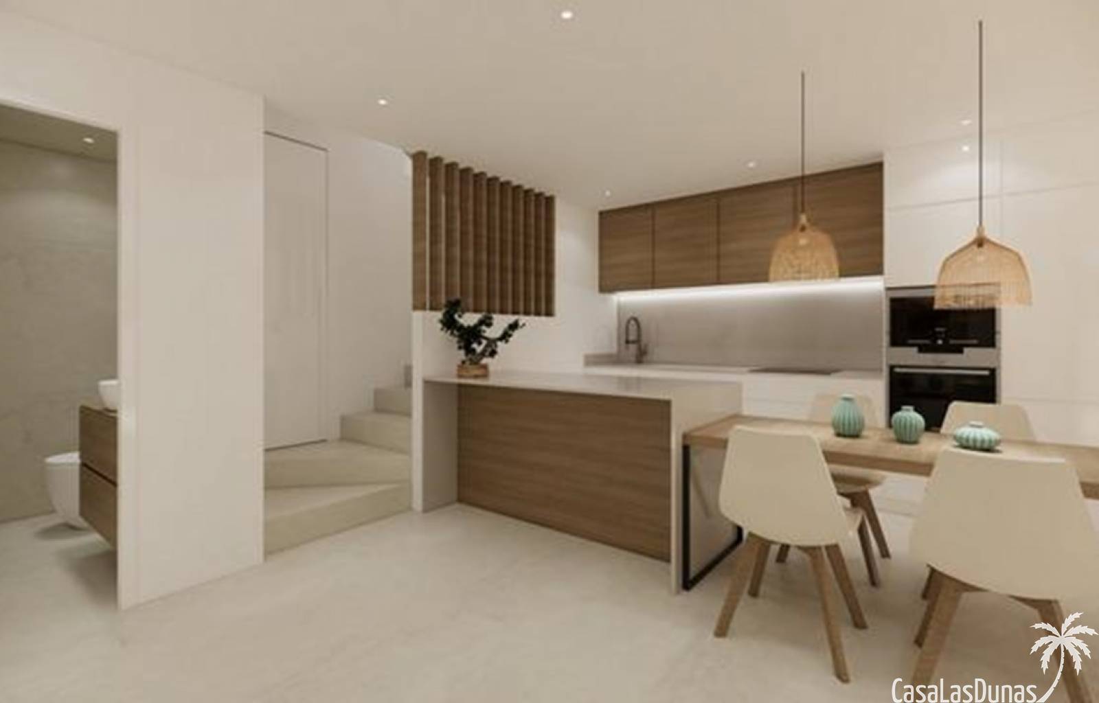 De open keuken wordt opgeleverd met inbouwapparatuur.