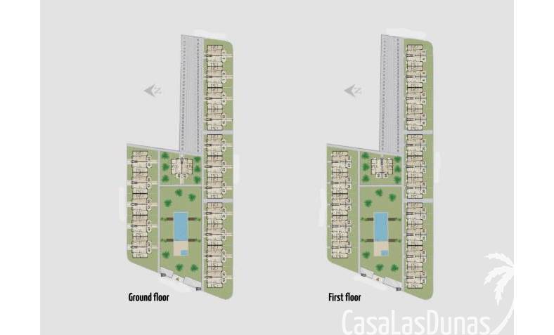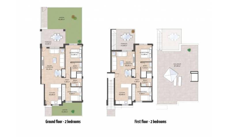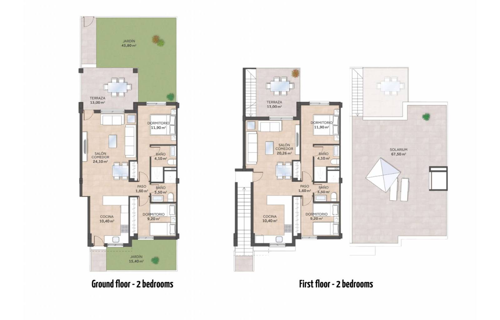 De appartementen zijn ruim en licht, met een open woonkamer, een moderne keuken, twee comfortabele slaapkamers met inbouwkasten en twee volledig uitgeruste badkamers. Elk appartement beschikt over een eigen tuin, met directe toegang tot de prachtig aangelegde gemeenschappelijke tuin met zwembad. Ideaal om het hele jaar door te genieten van het mediterrane klimaat.