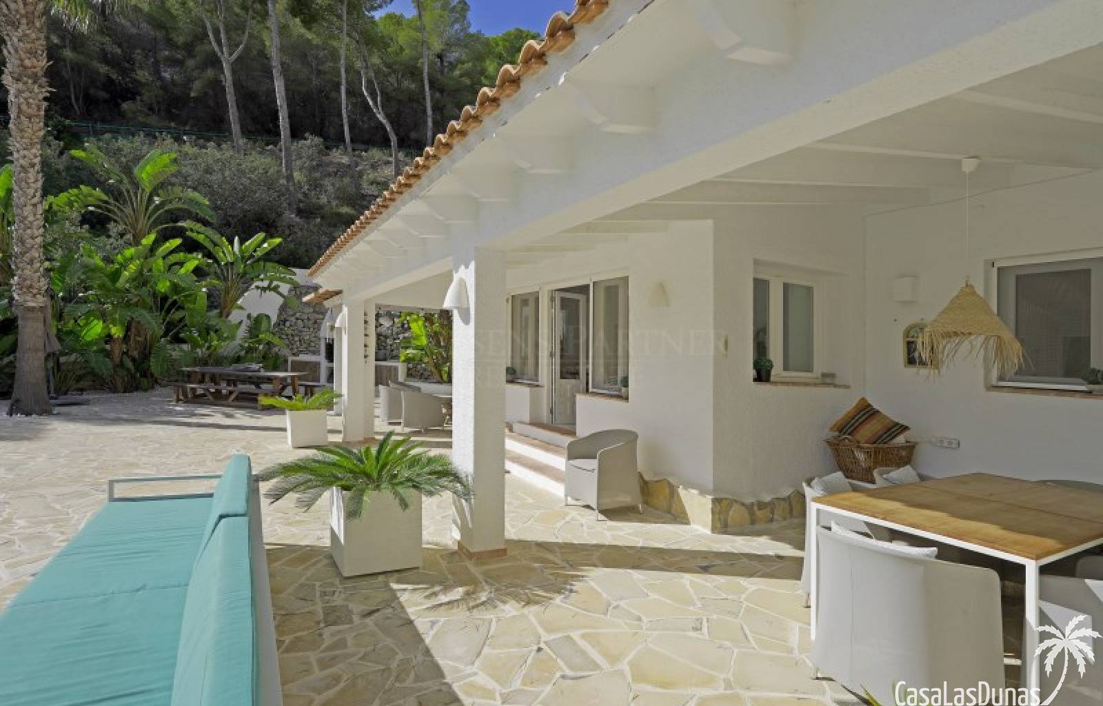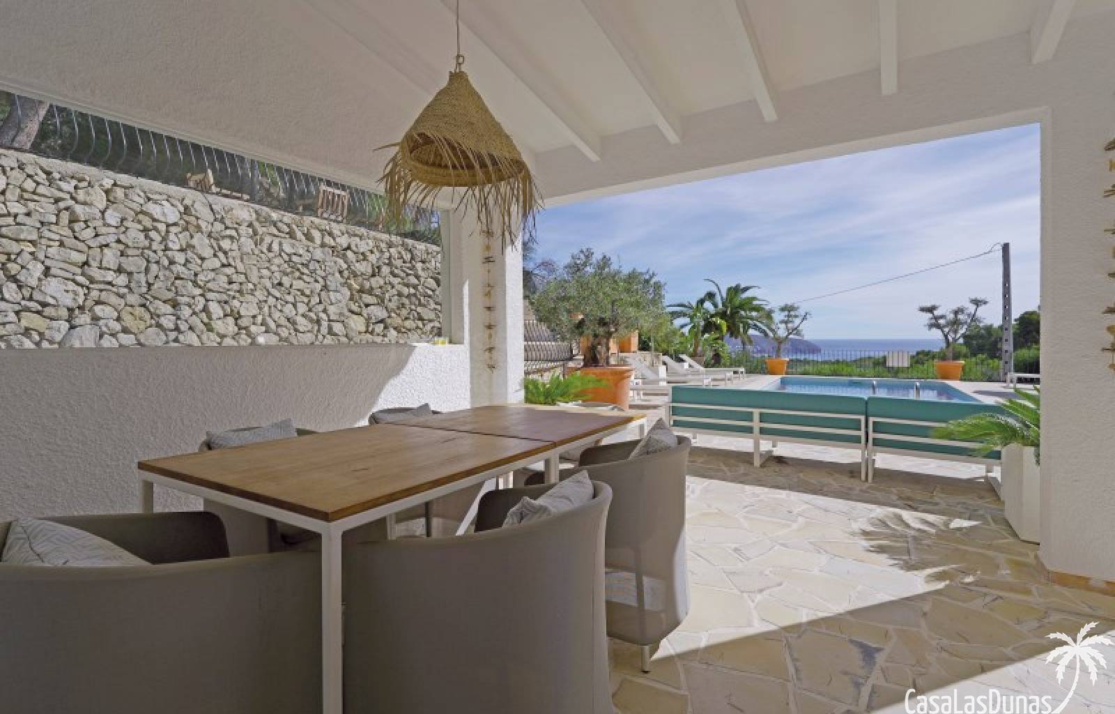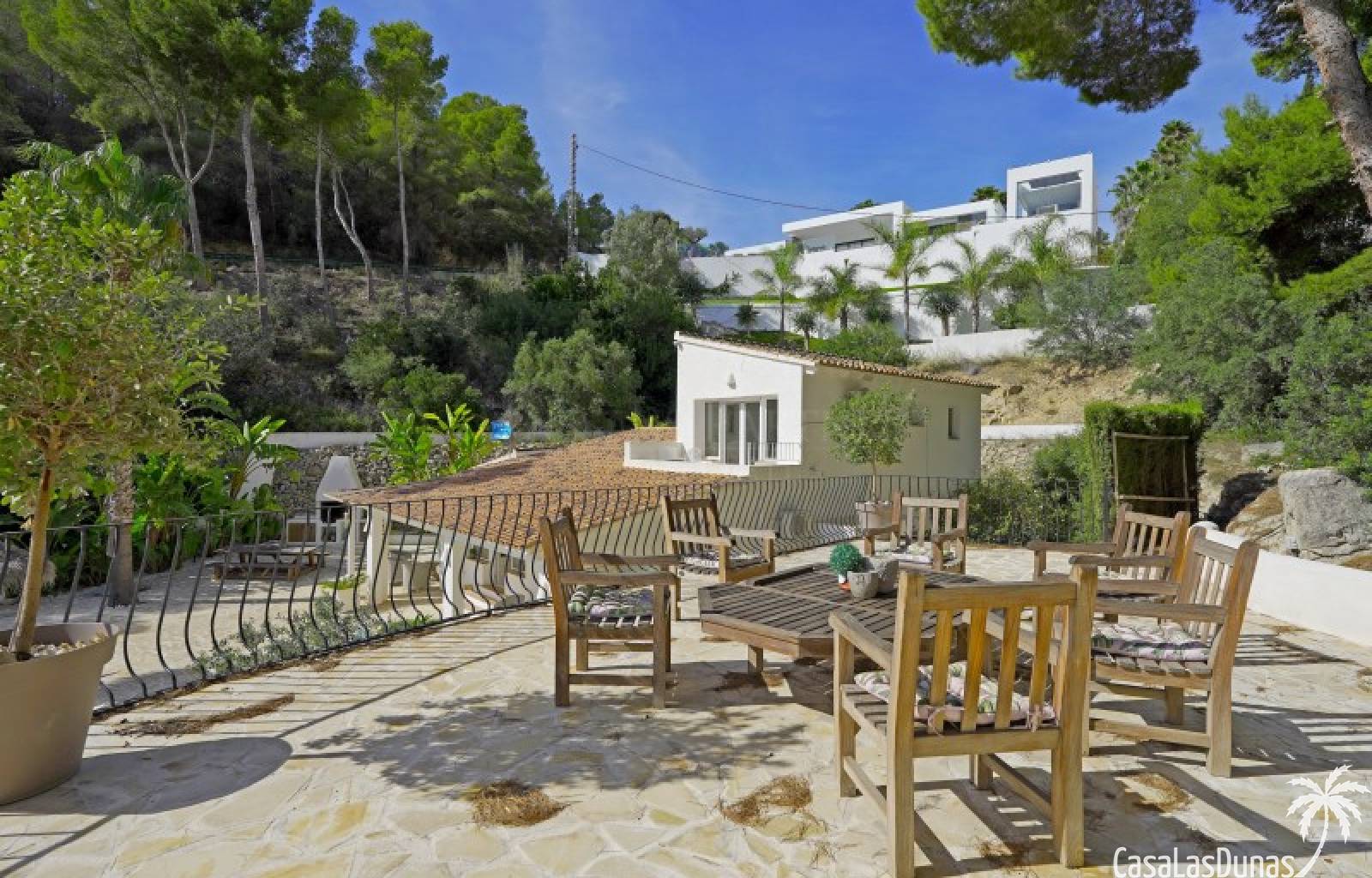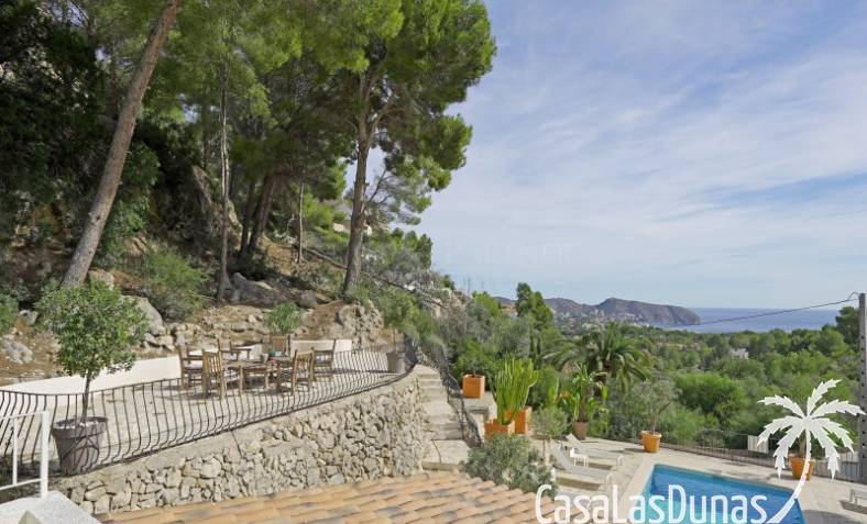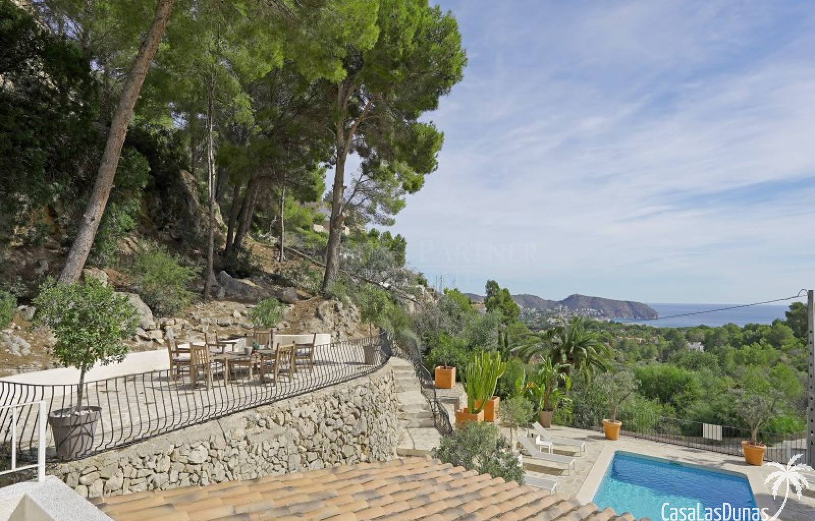 Gelegen in de heuvels van Moraira, tussen de zee en de bergen. Deze moderne woning biedt luxe en privacy, met een verwarmd privézwembad, een ruim terras en een adembenemend panoramisch uitzicht op zee. De villa beschikt over vier slaapkamers en twee badkamers, evenals een buitendouche. In 2025 is het terras volledig vernieuwd met flagstone natuurstenen, en er is een half-schaduw pergola aan het huis gebouwd, ideaal om buiten te ontspannen of te dineren in de zomer. Voor parkeermogelijkheden is er een carport beneden, waar twee auto's in de schaduw kunnen staan. De lichte woonkamer is voorzien van een open haard, een gezellige eethoek en een volledig uitgeruste moderne keuken. Het omheinde privéterrein biedt volop rust en veiligheid, met een zonneterras, een buitensalon en een barbecue voor sfeervol buiten dineren. De woning beschikt tevens over airconditioning. Villa Paulanni ligt in een rustige, groene heuvelachtige omgeving, waar u kunt genieten van de privacy en het panoramische uitzicht. Tegelijkertijd bent u slechts enkele minuten verwijderd van het centrum van Moraira, met zijn charmante winkels, restaurants en prachtige stranden. Villa Paulanni combineert modern comfort, stijl en een uitzonderlijke locatie, en is daarmee een ideale woning voor wie wil genieten van het mediterrane leven aan de Costa Blanca. De woning bedraagt 157m2 en bevindt zich op een plot van 1360m2. Tevens grenst het aan een tweede plot, wat 1610m2 bevat. #ref:1766