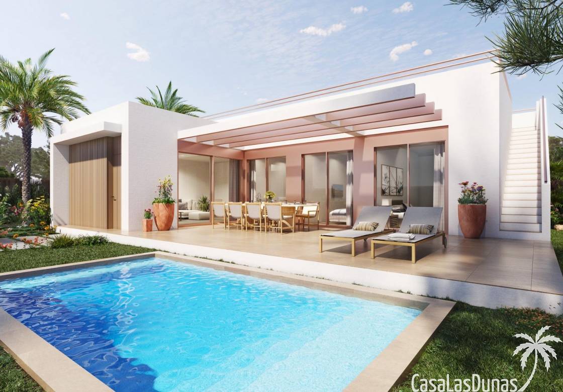 Gelijkvloerse villa's met 3 slaapkamers, 2 badkamers en een solarium op het dak.