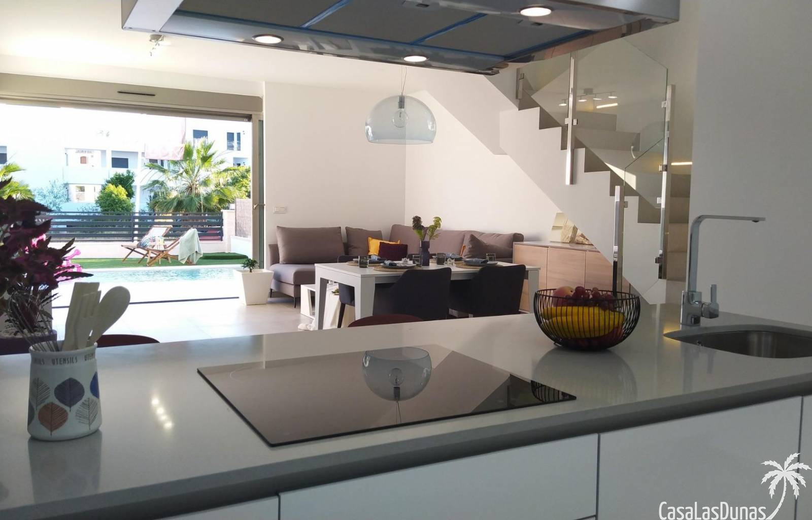 In de keuken vinden we meubels die zijn afgewerkt in wit en een kwartswerkblad in een kleur die overeenkomt met de vloer van het huis.