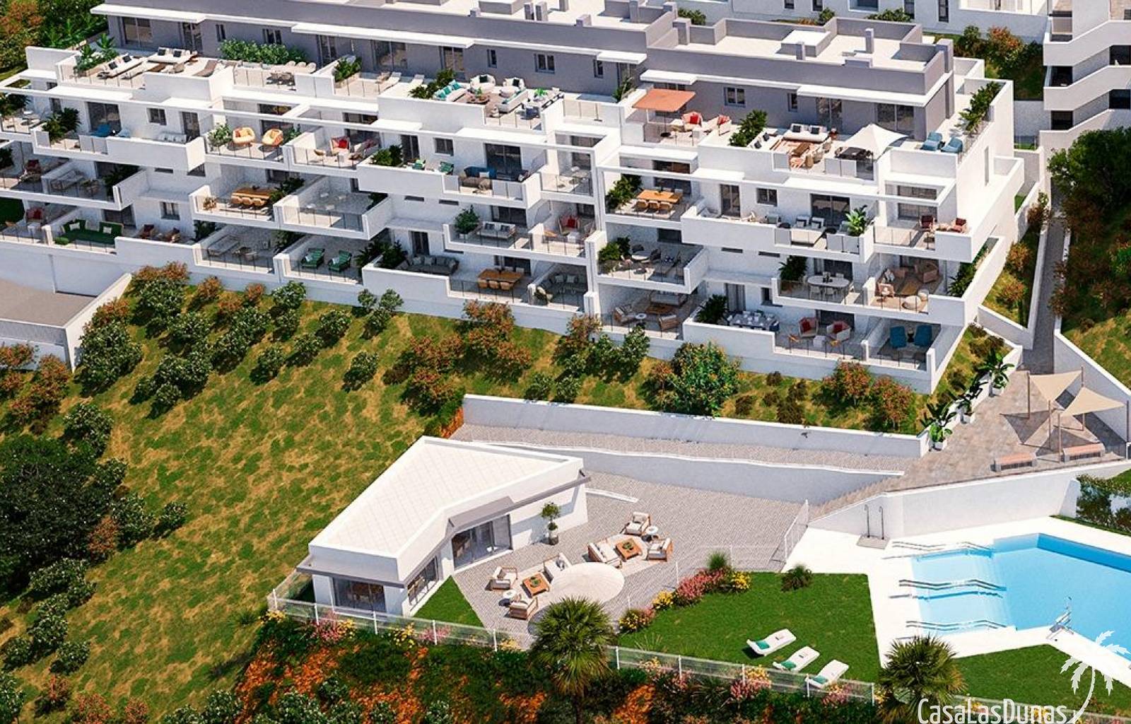 De gemeenschappelijke ruimten van het project zijn ontworpen om comfort en luxe te bieden, met aangelegde ruimten die je in contact brengen met de natuur, een zwembad met een ontspannend strand met ligstoelen en een gastroteca die de perfecte plek wordt om te socializen en te genieten van speciale momenten.