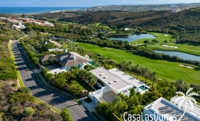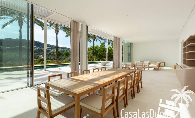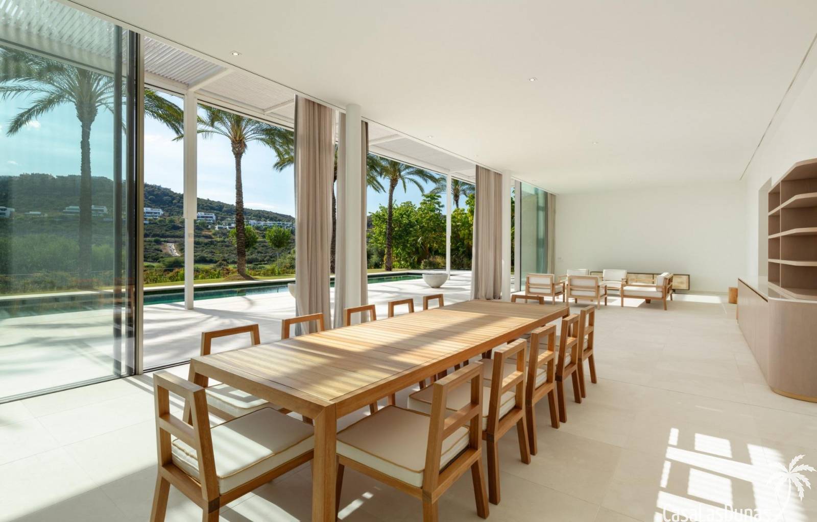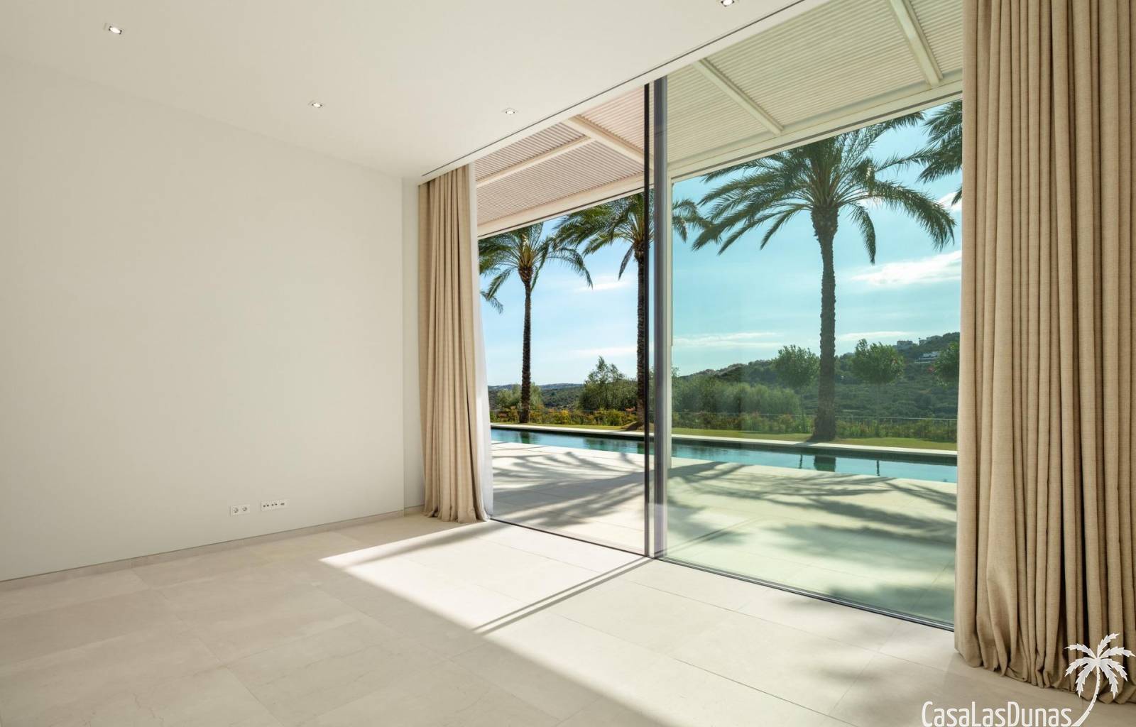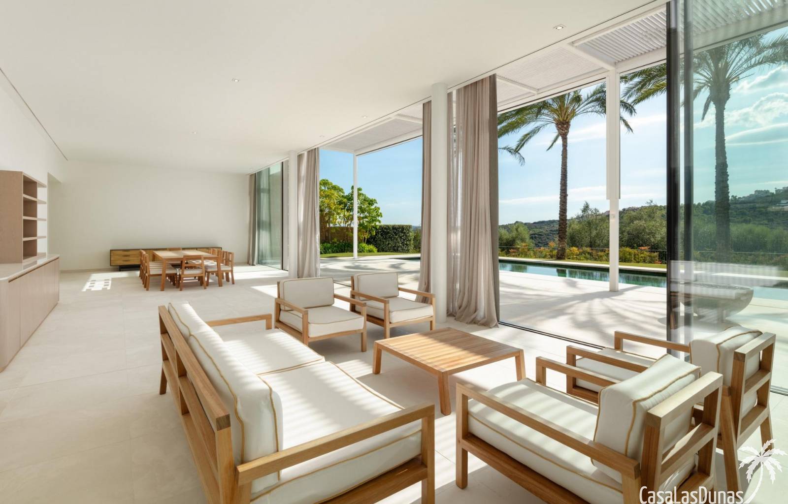 De villa is genesteld op een ruim perceel aan de voorkant van de golfbaan en heeft grote ramen van vloer tot plafond die het interieur overspoelen met een overvloed aan natuurlijk licht, waardoor je vanaf het verhoogde uitkijkpunt een adembenemend uitzicht hebt op de golfbaan van Finca Cortesin en de Middellandse Zee.