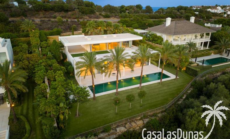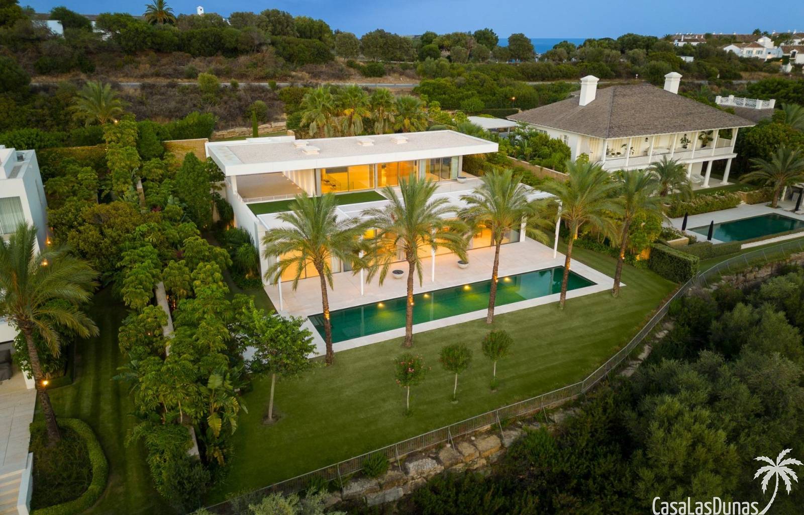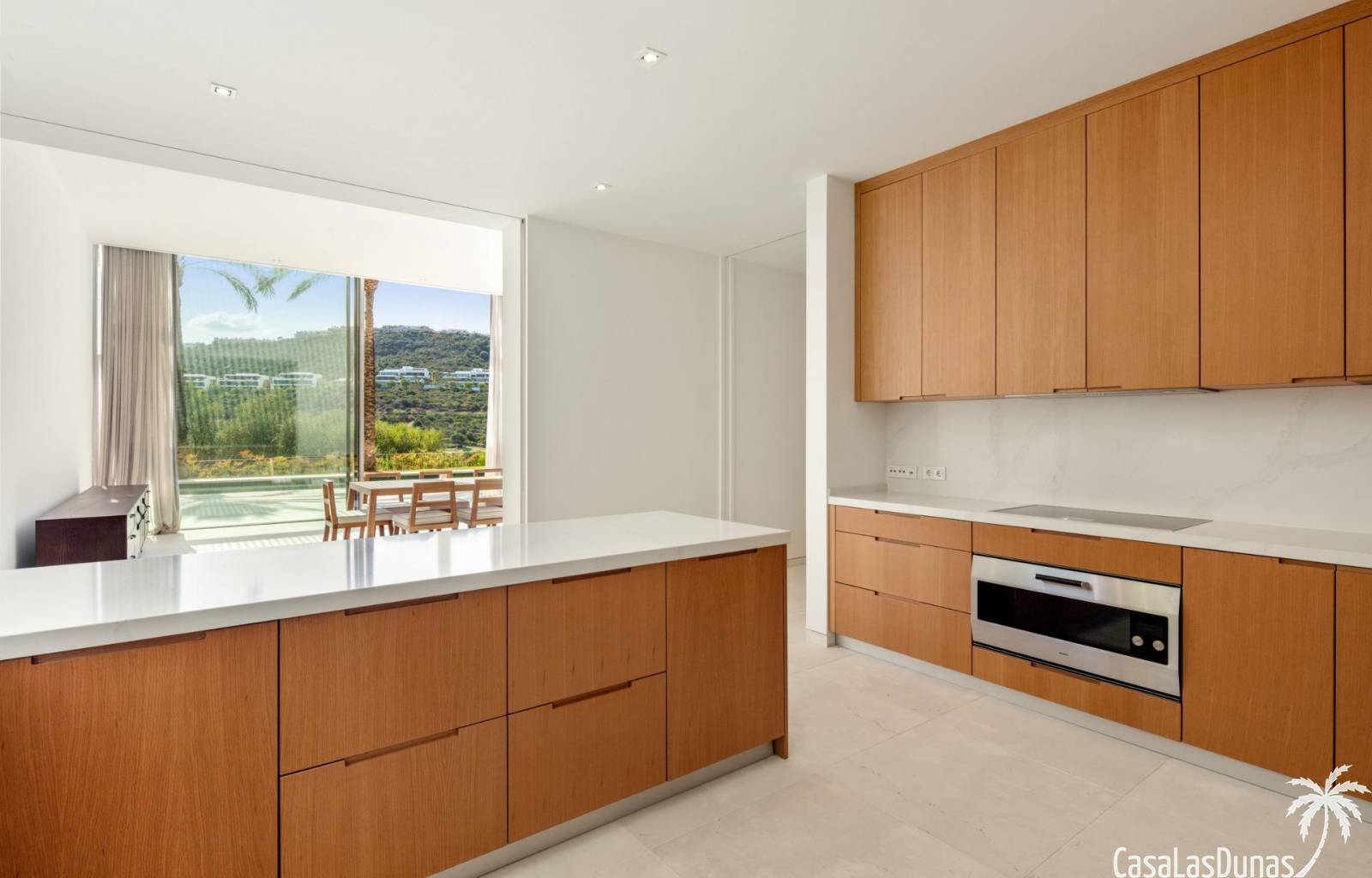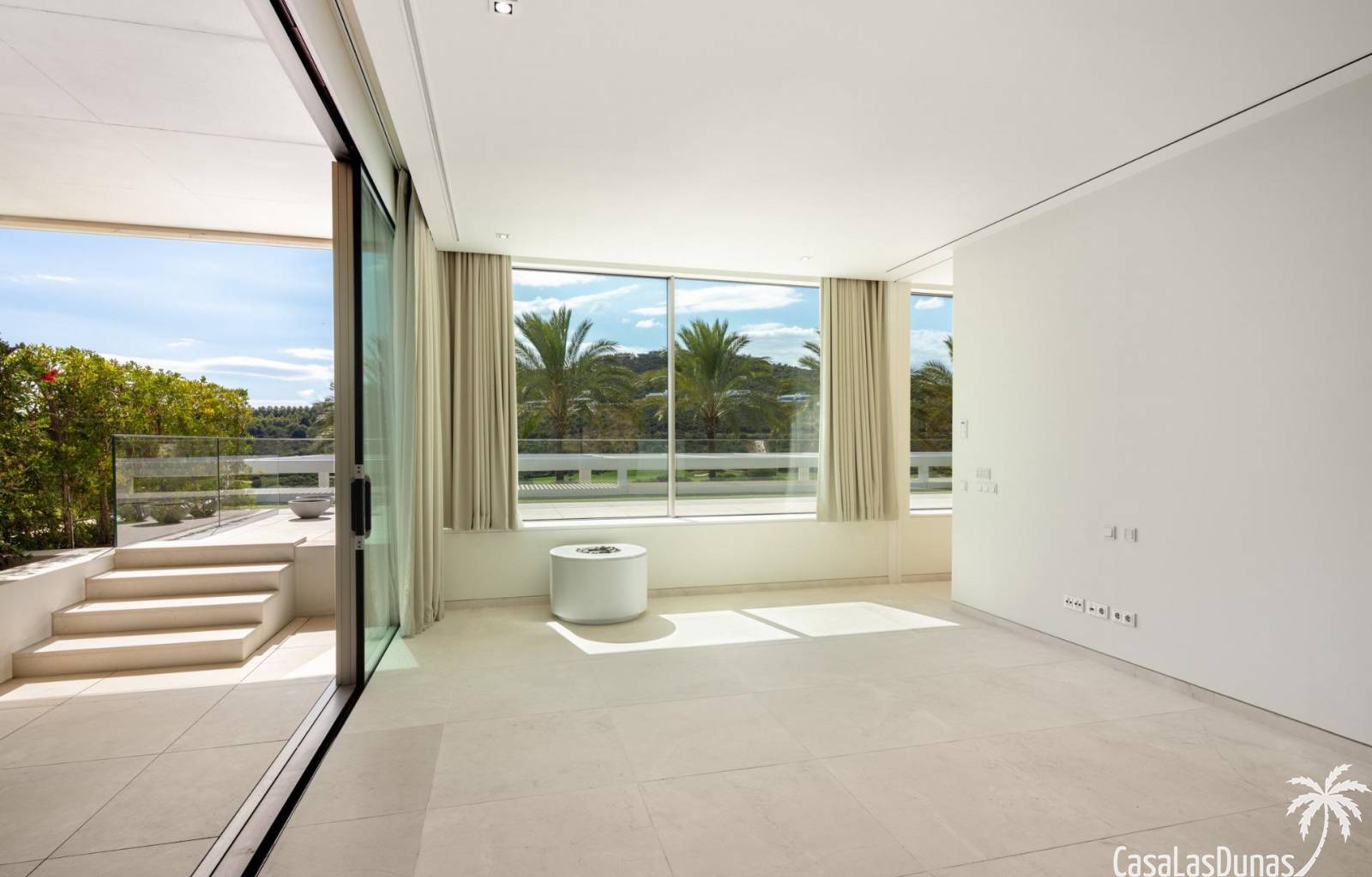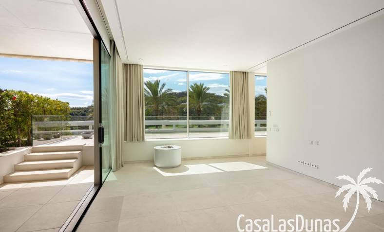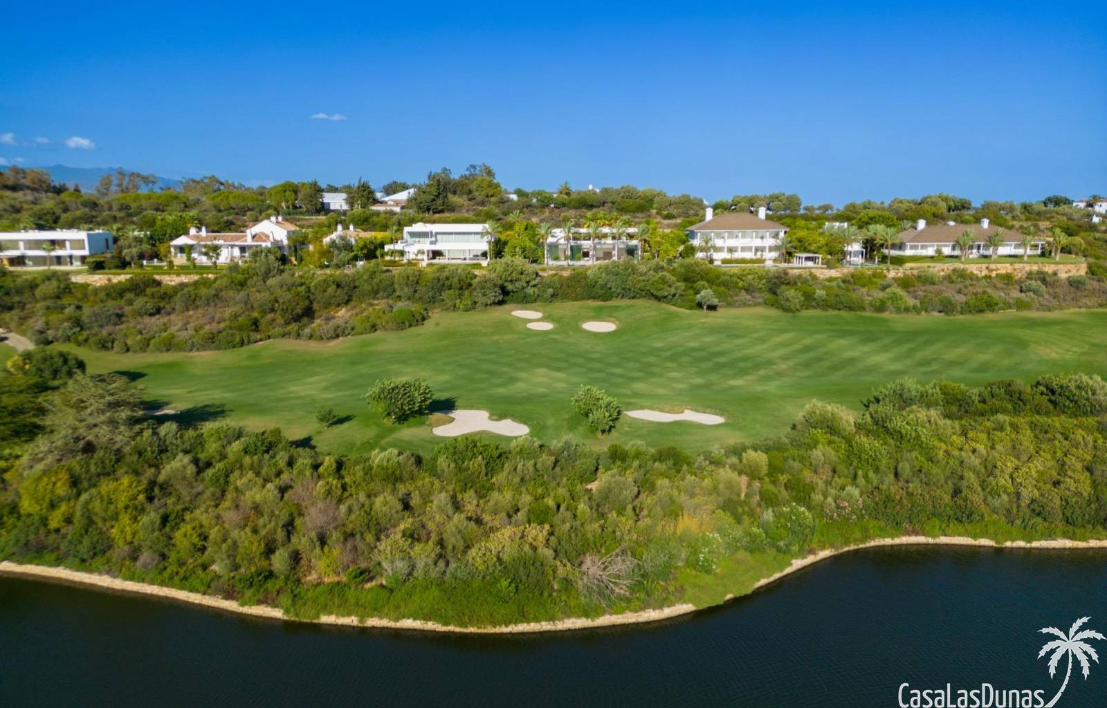 De villa is genesteld op een ruim perceel aan de voorkant van de golfbaan en heeft grote ramen van vloer tot plafond die het interieur overspoelen met een overvloed aan natuurlijk licht, waardoor je vanaf het verhoogde uitkijkpunt een adembenemend uitzicht hebt op de golfbaan van Finca Cortesin en de Middellandse Zee.