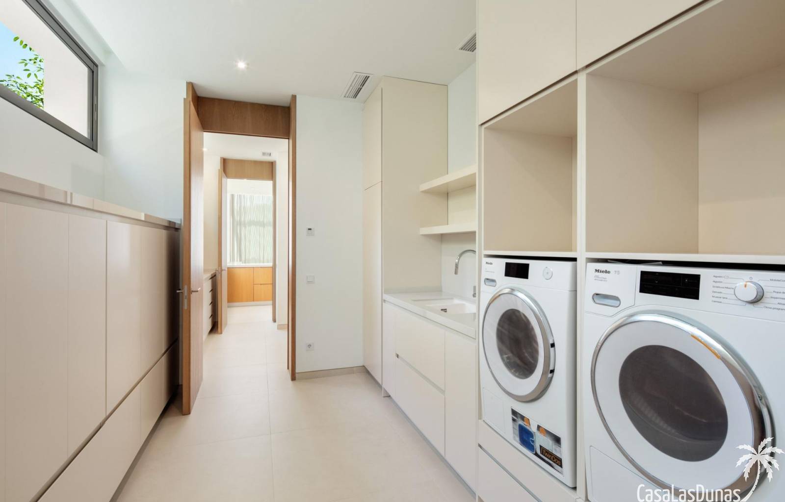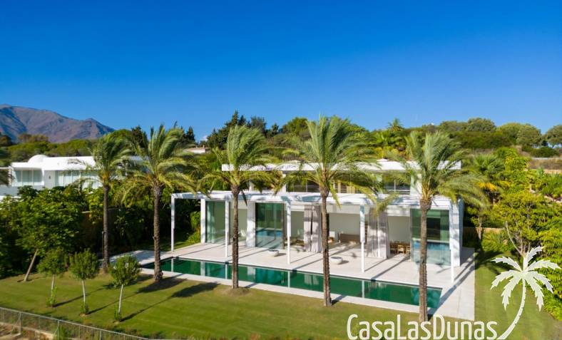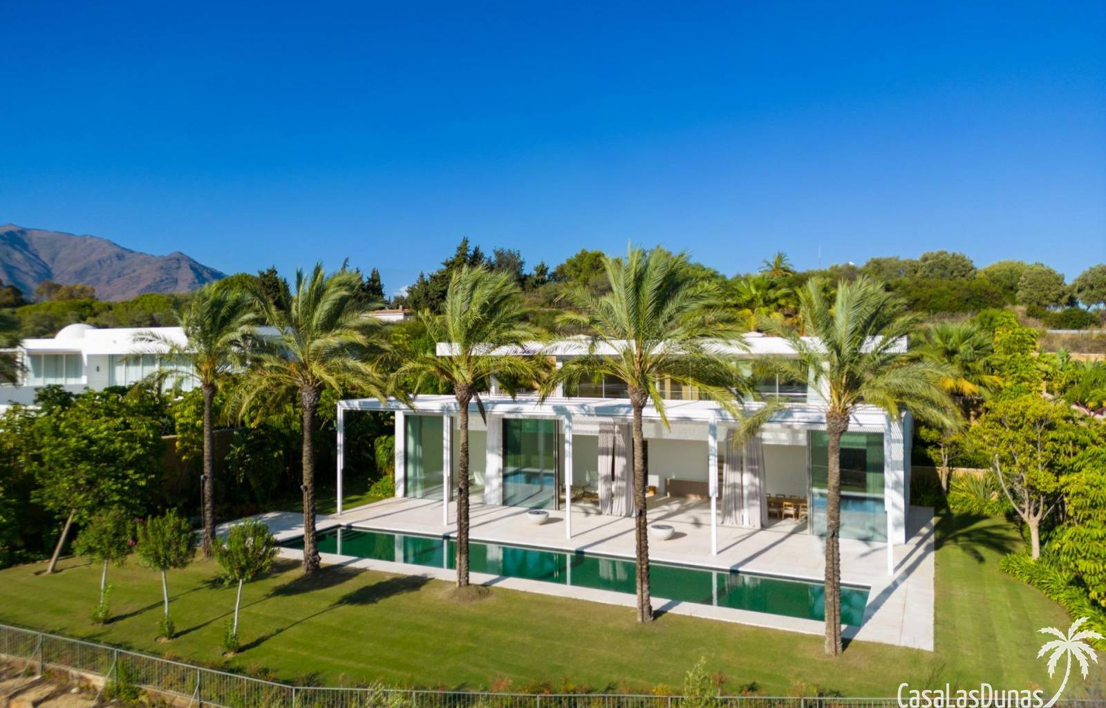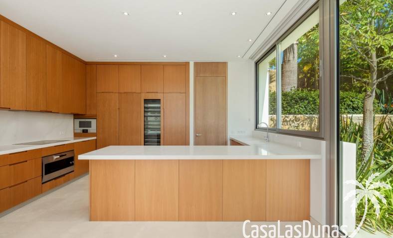 Het lange zwembad, versierd met prachtige aquamarijne tegels, nodigt iedereen uit om een duik te nemen, terwijl de weelderige palmbomen zorgen voor schaduw en een esthetische achtergrond voor ontspanning. Het interieur straalt verfijning uit, met elk detail zorgvuldig samengesteld met behulp van de beste materialen, wat zorgt voor een ongeëvenaard gevoel van luxe. De verbluffende keuken, uitgerust met ultramoderne apparatuur van Gaggenau, is een culinair toevluchtsoord dat praktisch en esthetisch naadloos combineert.
