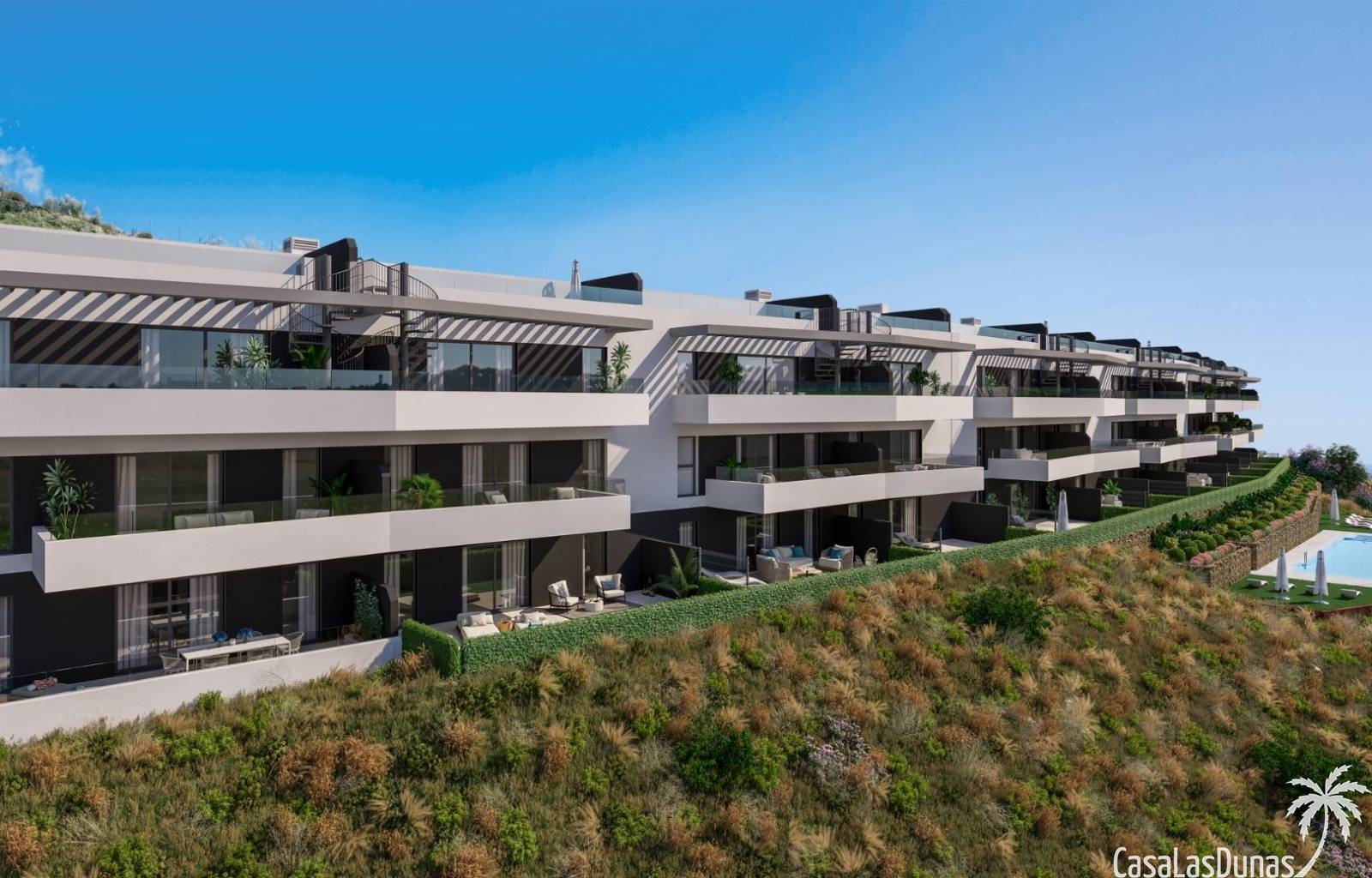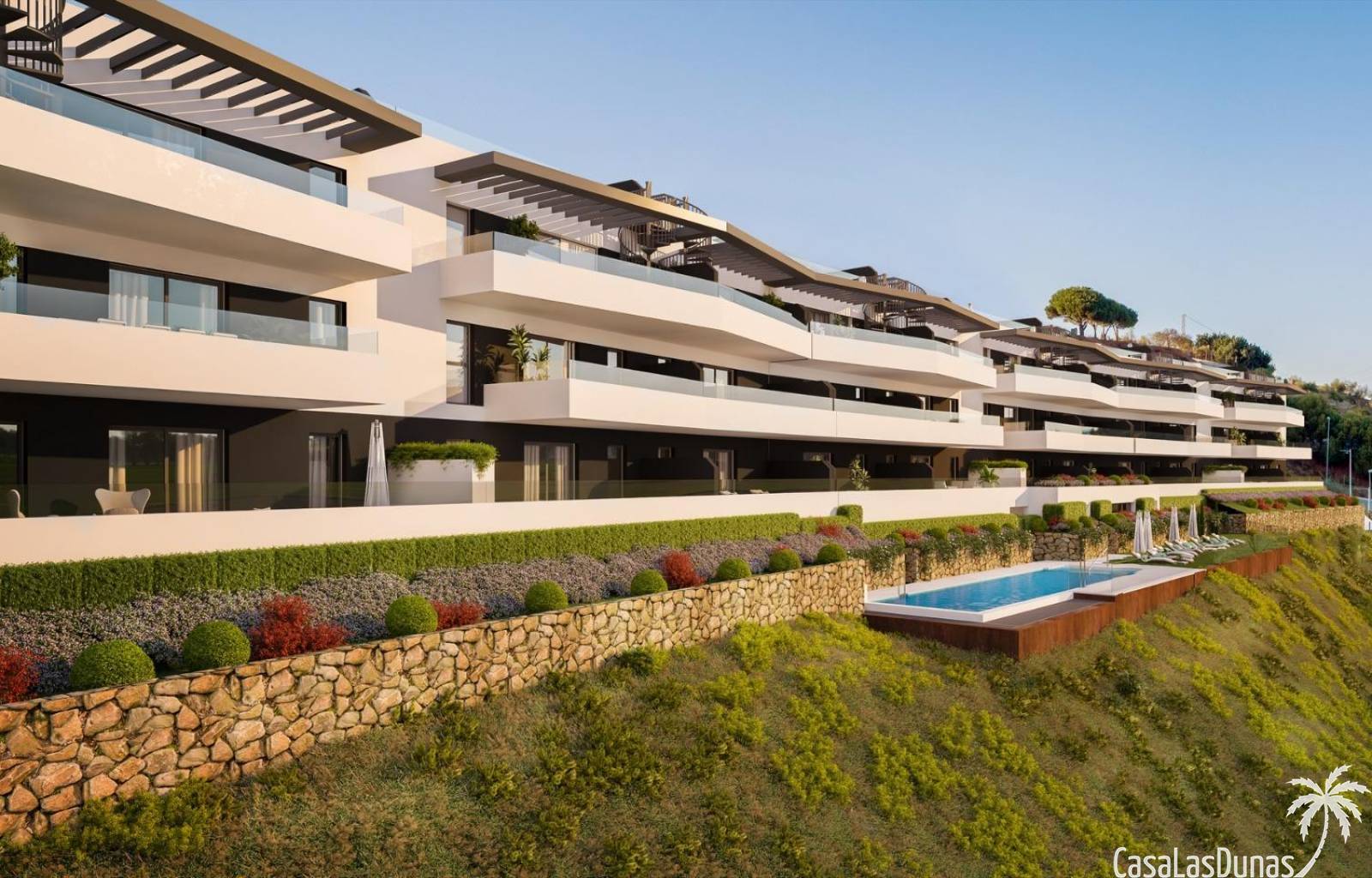 Zwemmen in het gemeenschappelijke zwembad is alsof je over de horizon zweeft. Gelegen op de heuvel die het project bekroont, biedt het een onbelemmerd uitzicht, zowel landinwaarts als richting de kust.