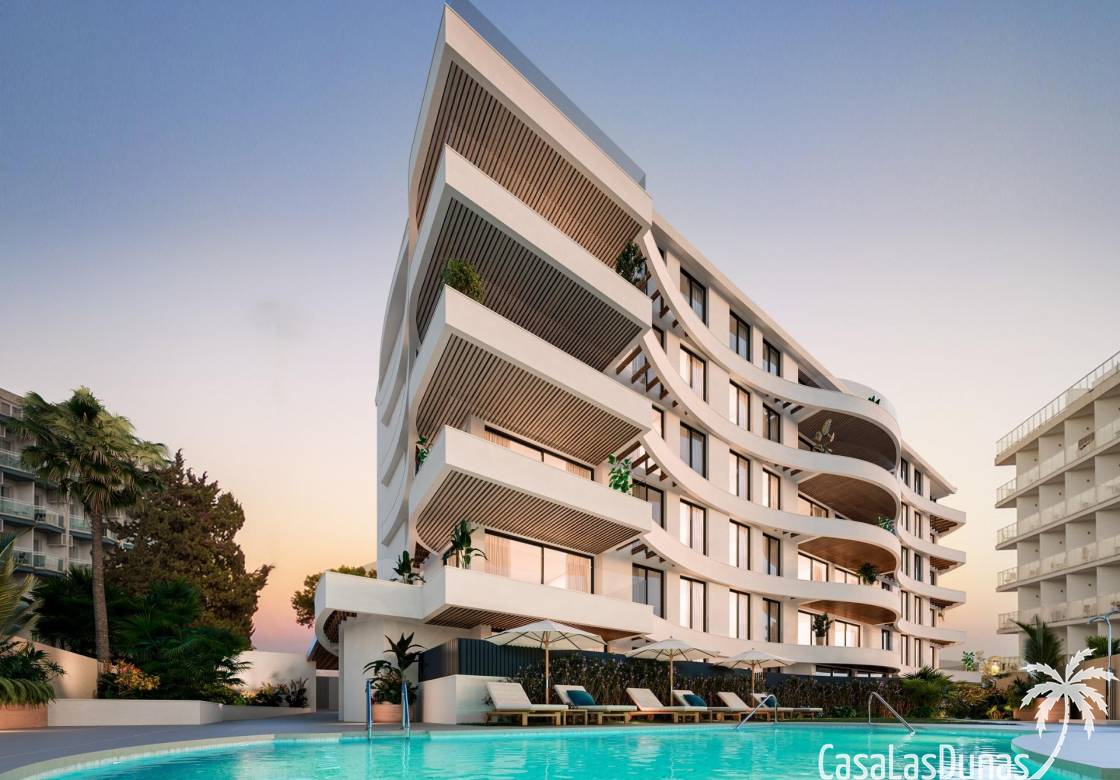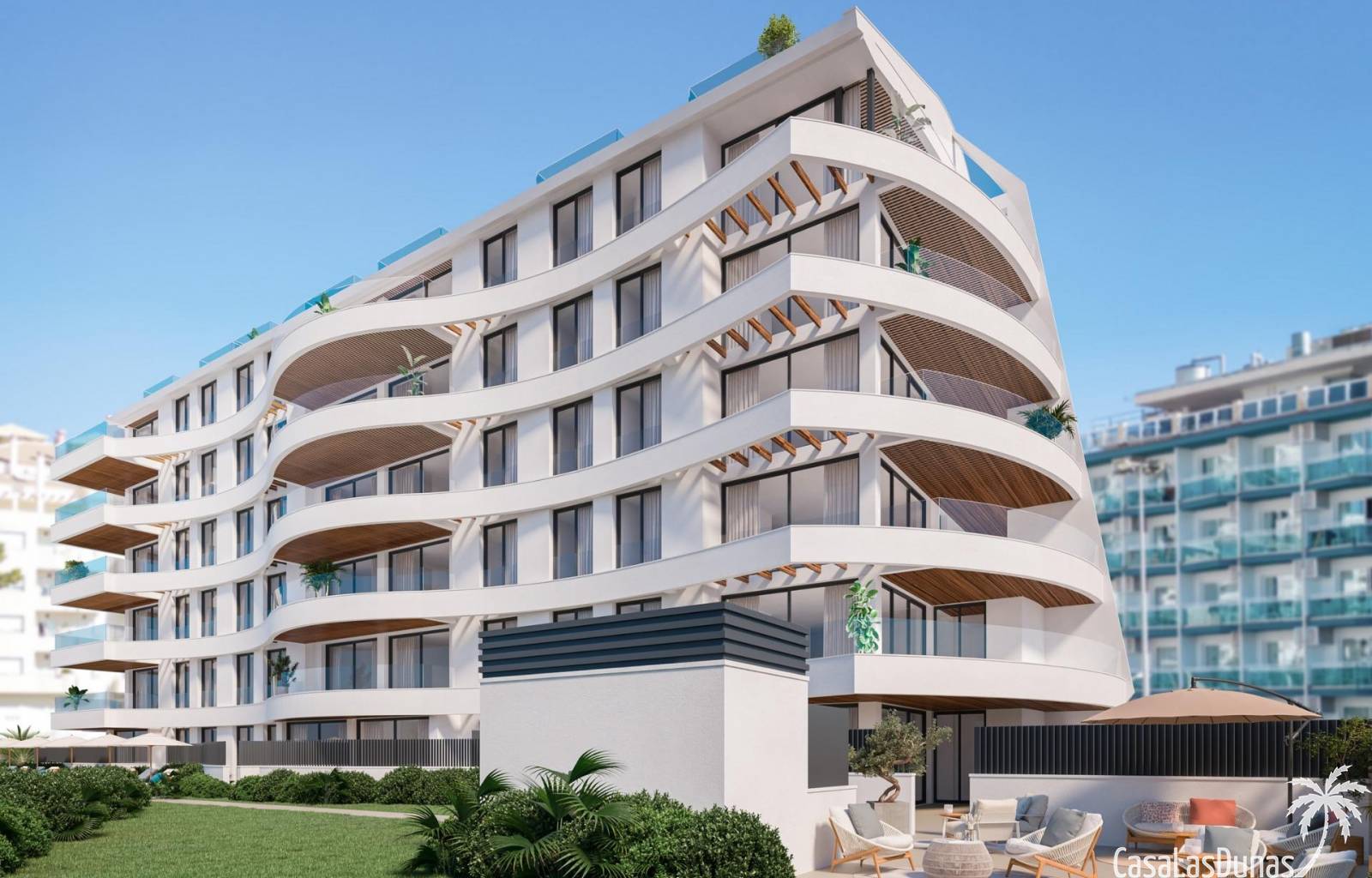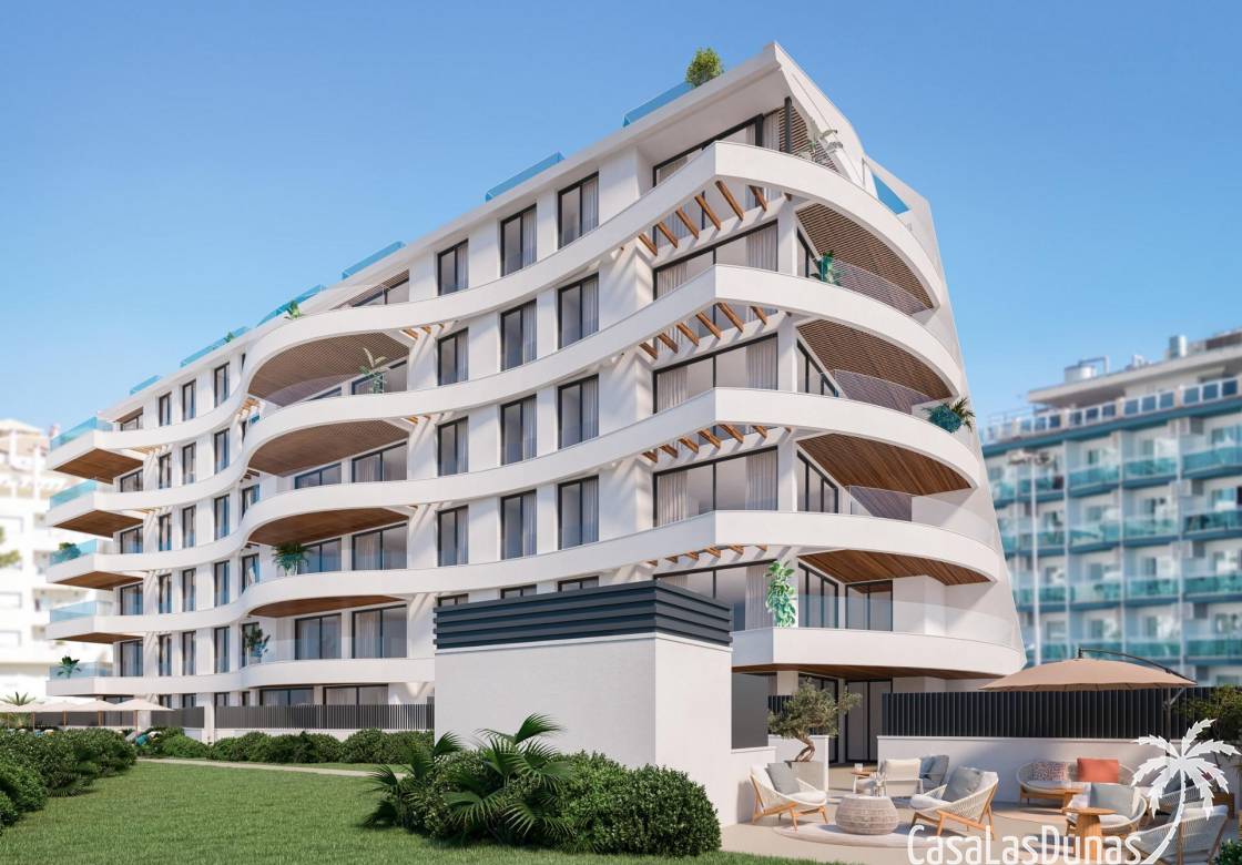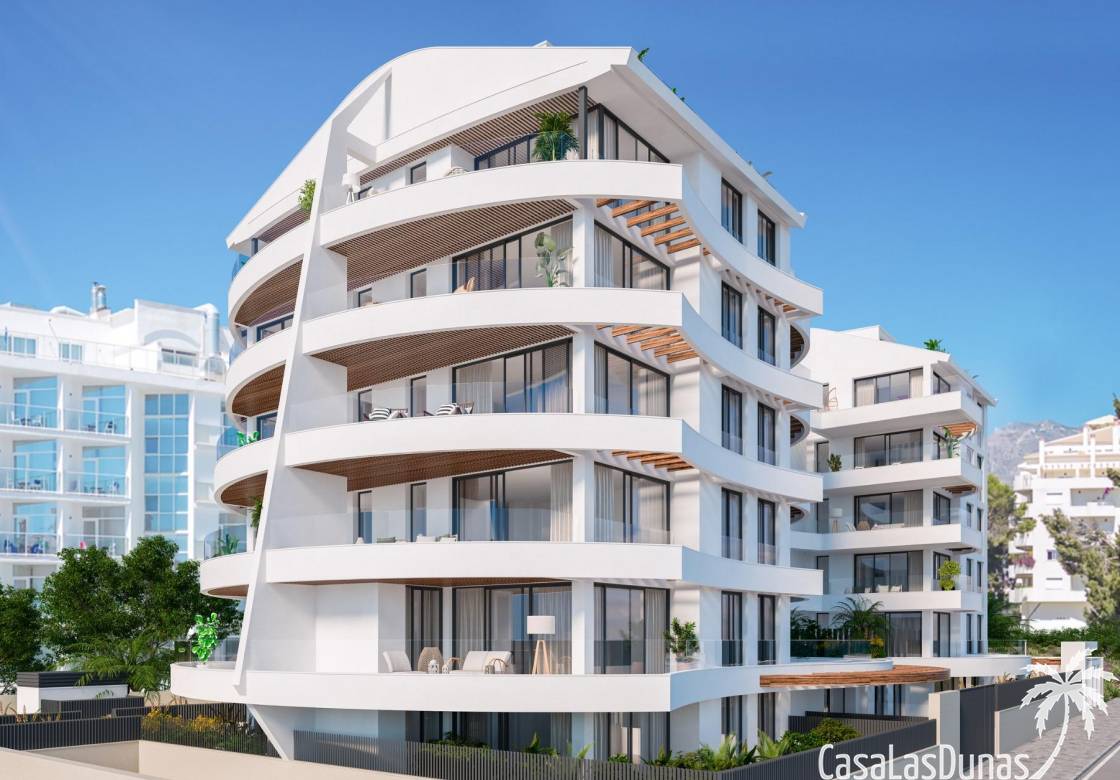Modern wooncomplex met 33 luxe appartementen met 1, 2 en 3 slaapkamers, geïnspireerd op de vorm van een schip. De golvende gevel doet denken aan golven en maakt de configuratie van terrassen mogelijk die open zijn naar de zee, badend in de zeebries.