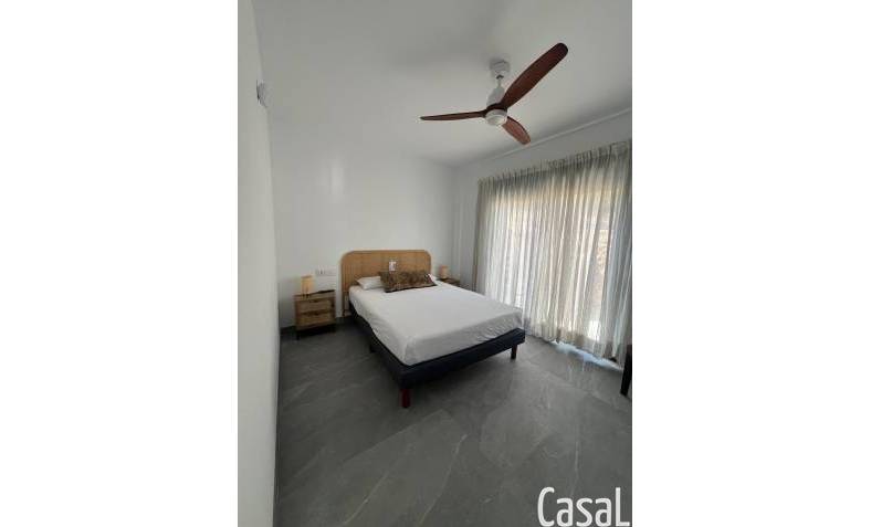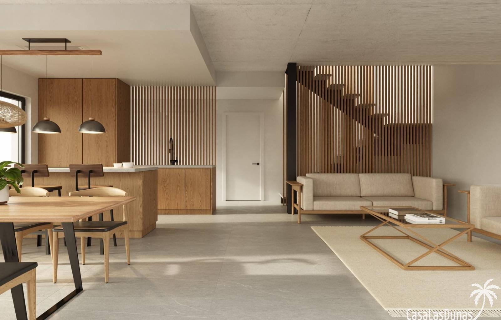 Keuken uitgerust met onderkasten en silestone werkbladen, met keramische kookplaat, oven, afzuigkap, koelkast, wasmachine, vaatwasser en aerothermische kachel.