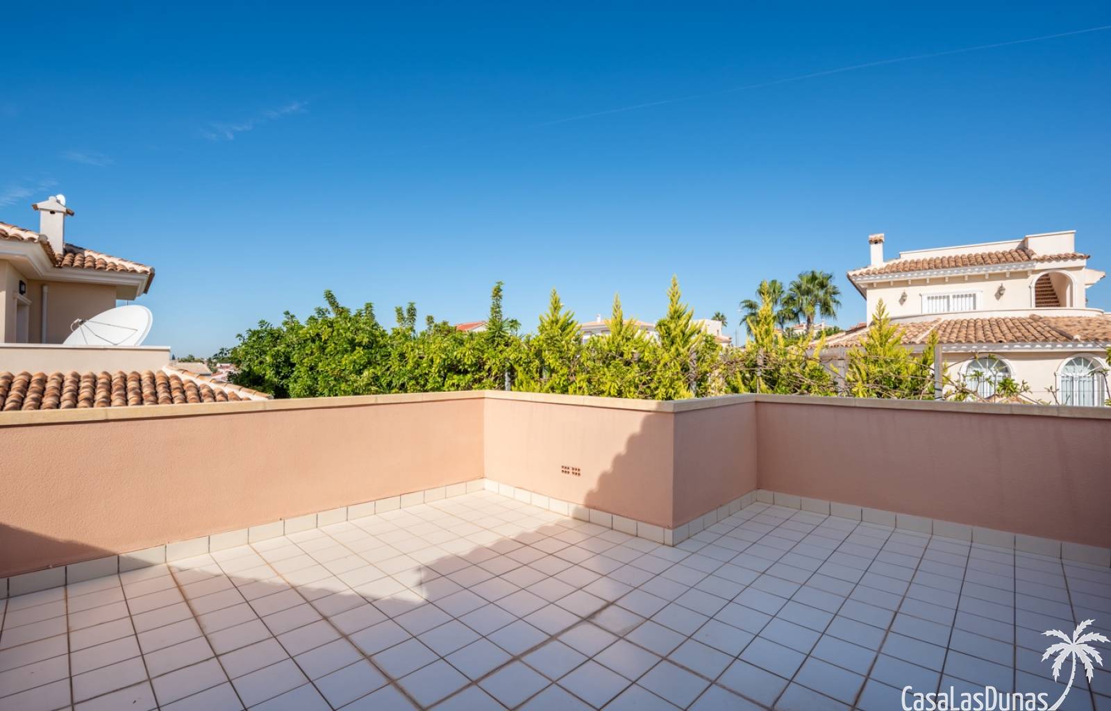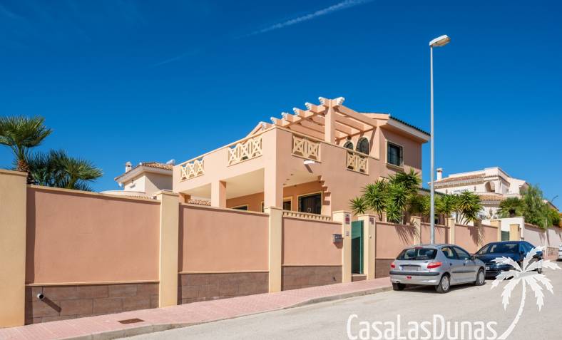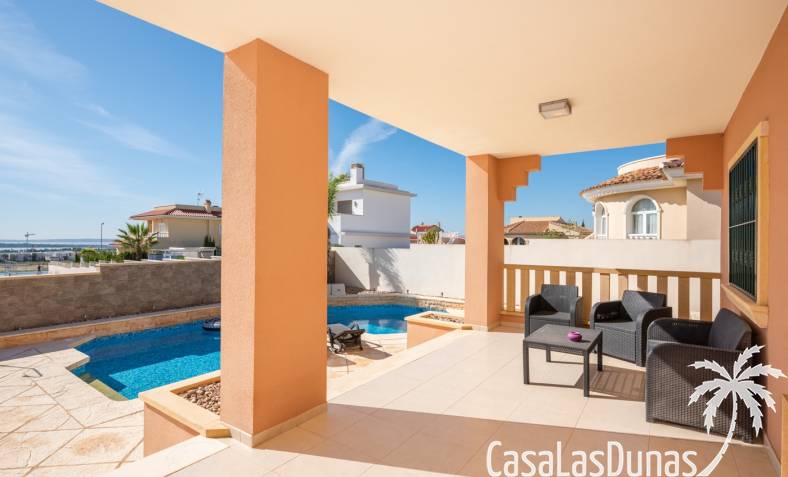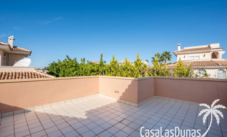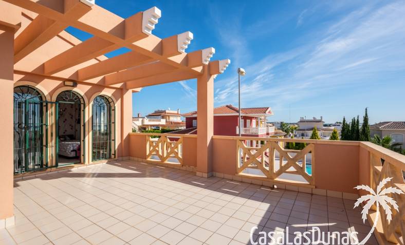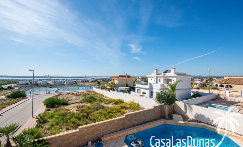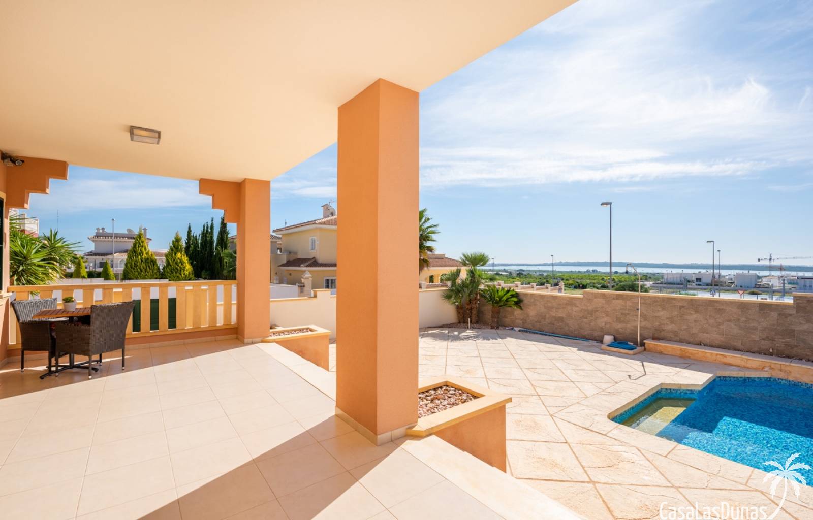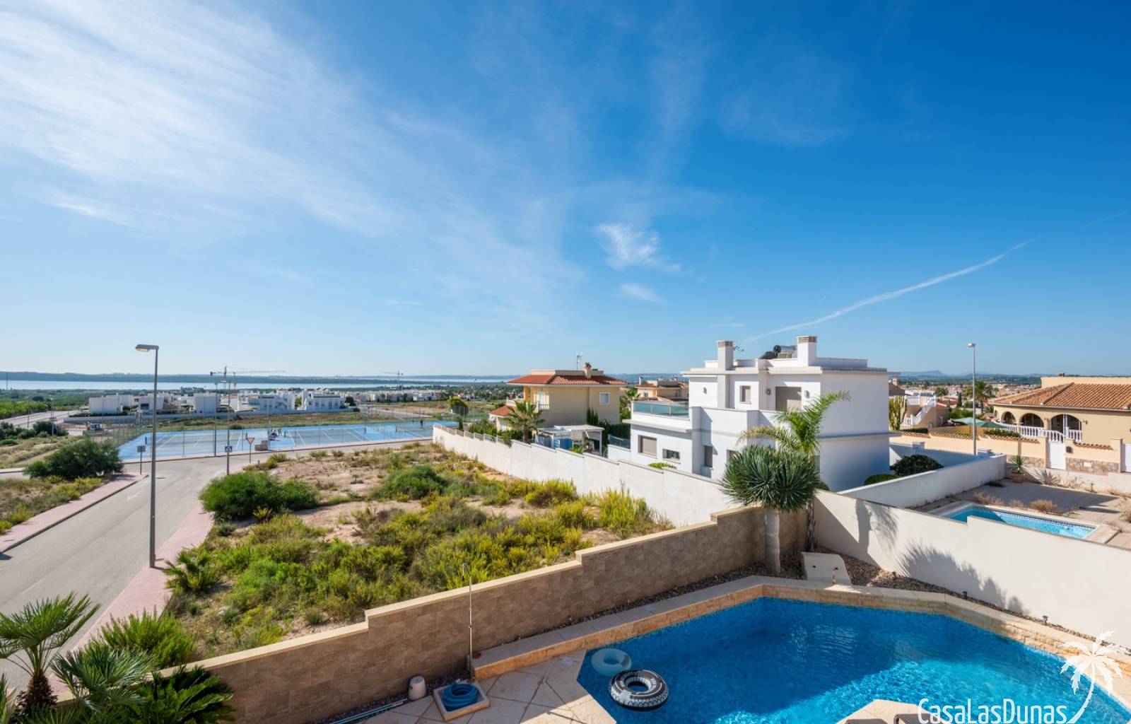 BuitenruimteDe villa ligt op een zuidgericht perceel van 546 m². Er is een mooie betegelde tuin met een zwembad en veel ruimte voor zitgedeeltes buiten en ligbedden. Bij de ingang is er ook een groot overdekt terras. Aan de achterkant van het huis bevindt zich een grote parkeerplaats met ruimte voor meerdere auto's. De villa heeft ook een groot terras op de eerste verdieping met prachtig uitzicht op de zoutmeren en Torrevieja.