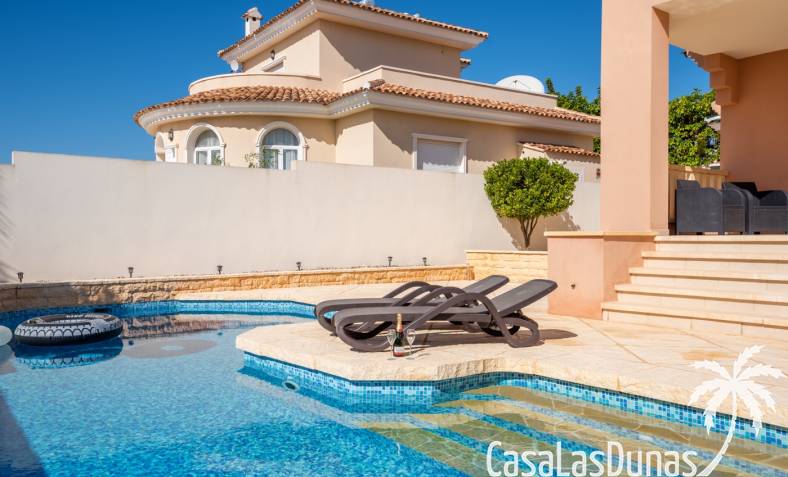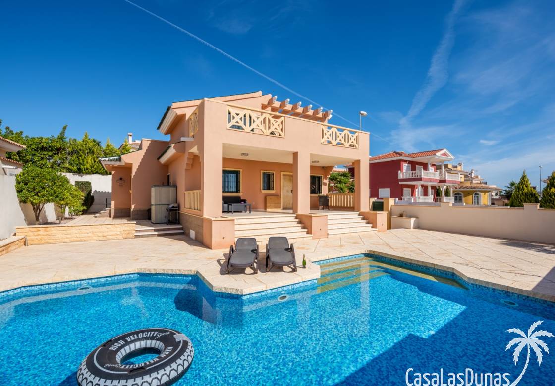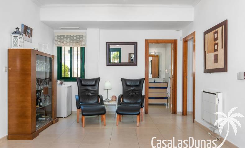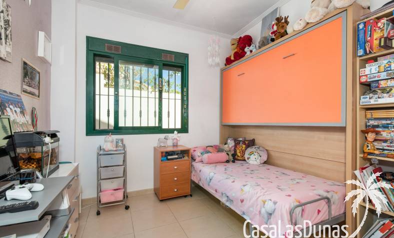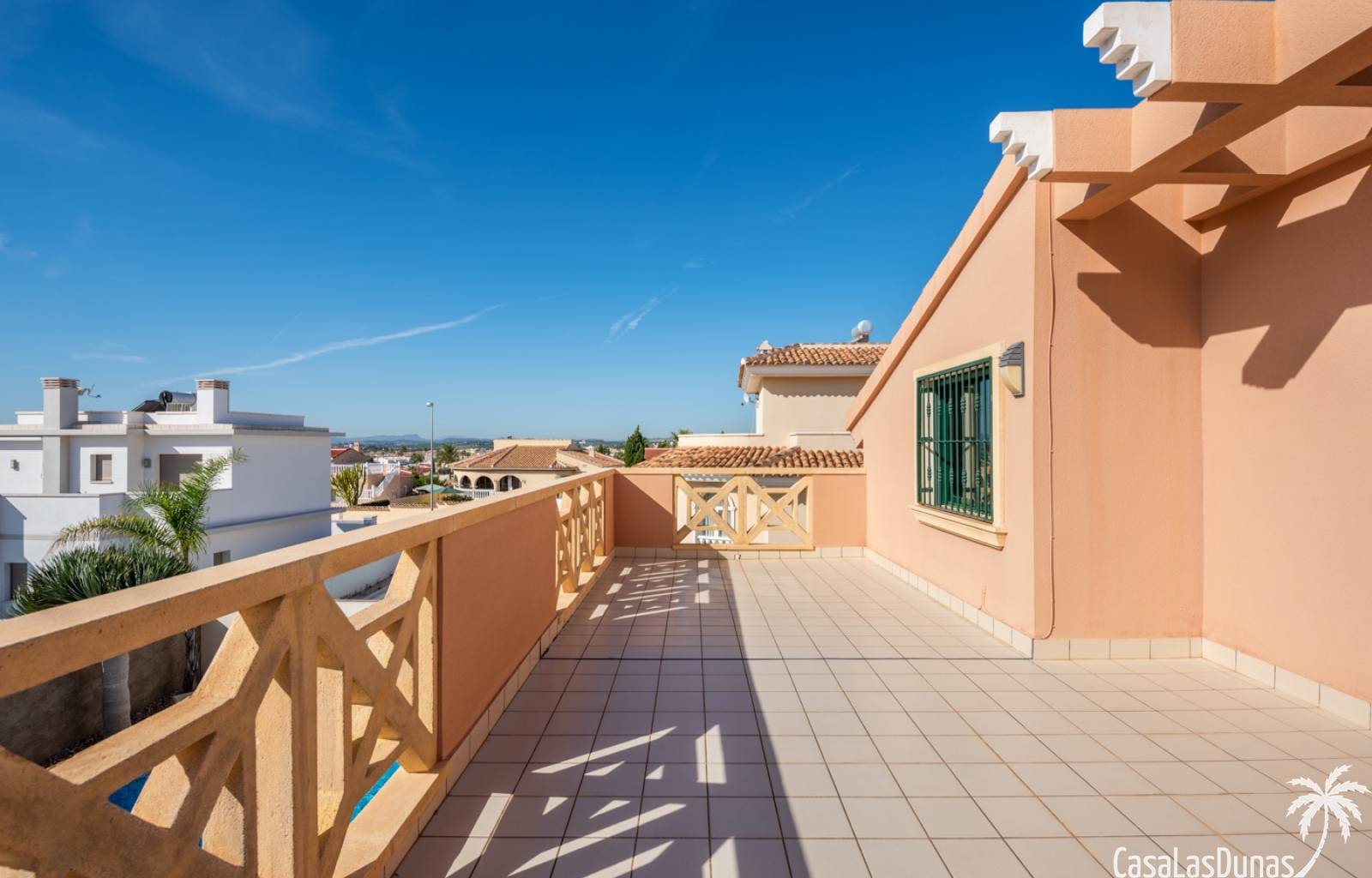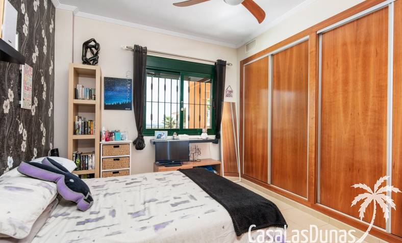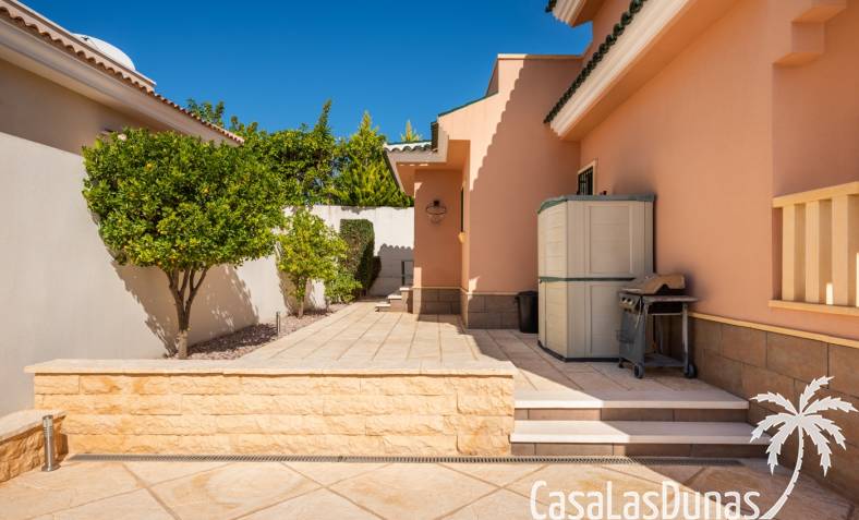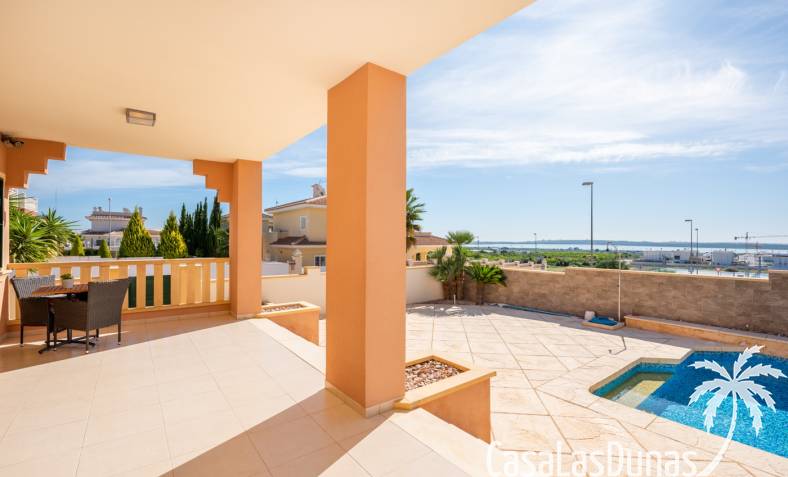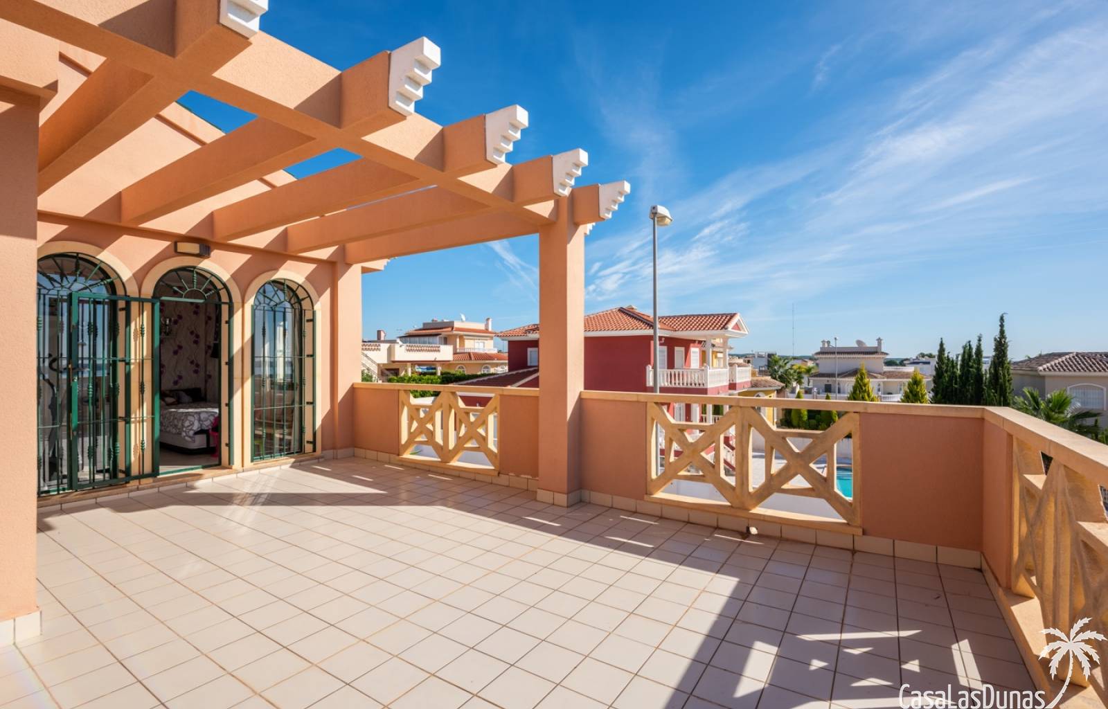 BuitenruimteDe villa ligt op een zuidgericht perceel van 546 m². Er is een mooie betegelde tuin met een zwembad en veel ruimte voor zitgedeeltes buiten en ligbedden. Bij de ingang is er ook een groot overdekt terras. Aan de achterkant van het huis bevindt zich een grote parkeerplaats met ruimte voor meerdere auto's. De villa heeft ook een groot terras op de eerste verdieping met prachtig uitzicht op de zoutmeren en Torrevieja.