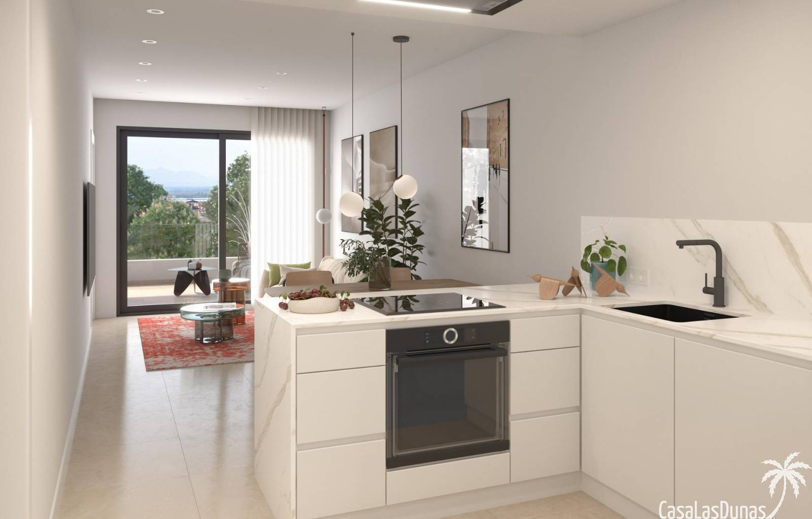 Dit eigentijdse nieuwbouwproject bestaat uit 64 moderne woningen en is gelegen in El Pinet, een geliefd kustgebied tussen La Marina en Elche. Op slechts 800 meter van het brede zandstrand van El Pinet combineert deze residentie comfortabel wonen met rust, natuur en een authentieke mediterrane levensstijl. De omgeving wordt gekenmerkt door beschermde duinen, pijnboombossen en de bekende Salinas de Santa Pola, wat zorgt voor een groene en ontspannen leefomgeving, ideaal voor permanent verblijf of vakantiegebruik.