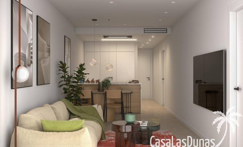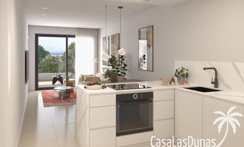 Ontdek dit moderne nieuwbouwproject met 64 woningen in El Pinet, een geliefd kustgebied tussen La Marina en Elche. Op slechts 800 meter van het brede zandstrand van El Pinet combineert dit project comfortabel wonen met natuur en rust. De omgeving wordt gekenmerkt door beschermde duinen, dennenbossen en de Salinas de Santa Pola, wat zorgt voor een aangenaam microklimaat en een natuurlijke woonbeleving, ideaal voor zowel permanente bewoning als vakantiegebruik.