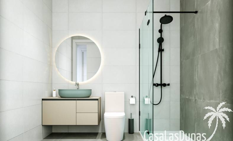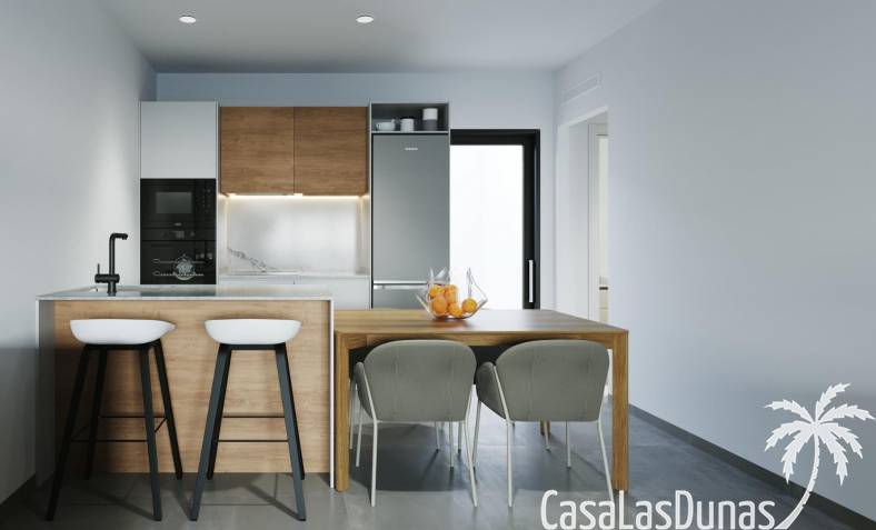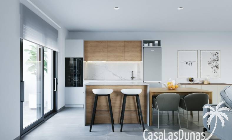 Moderne woningen met 2 slaapkamers en 2 badkamers, open keuken met woonkamer, inbouwkasten, terras, privésolarium, tuin met zwembad en parkeerplaats.
