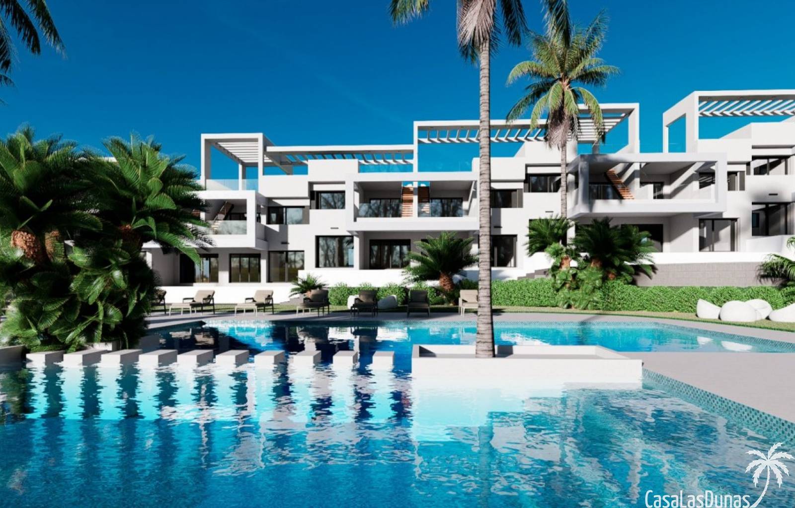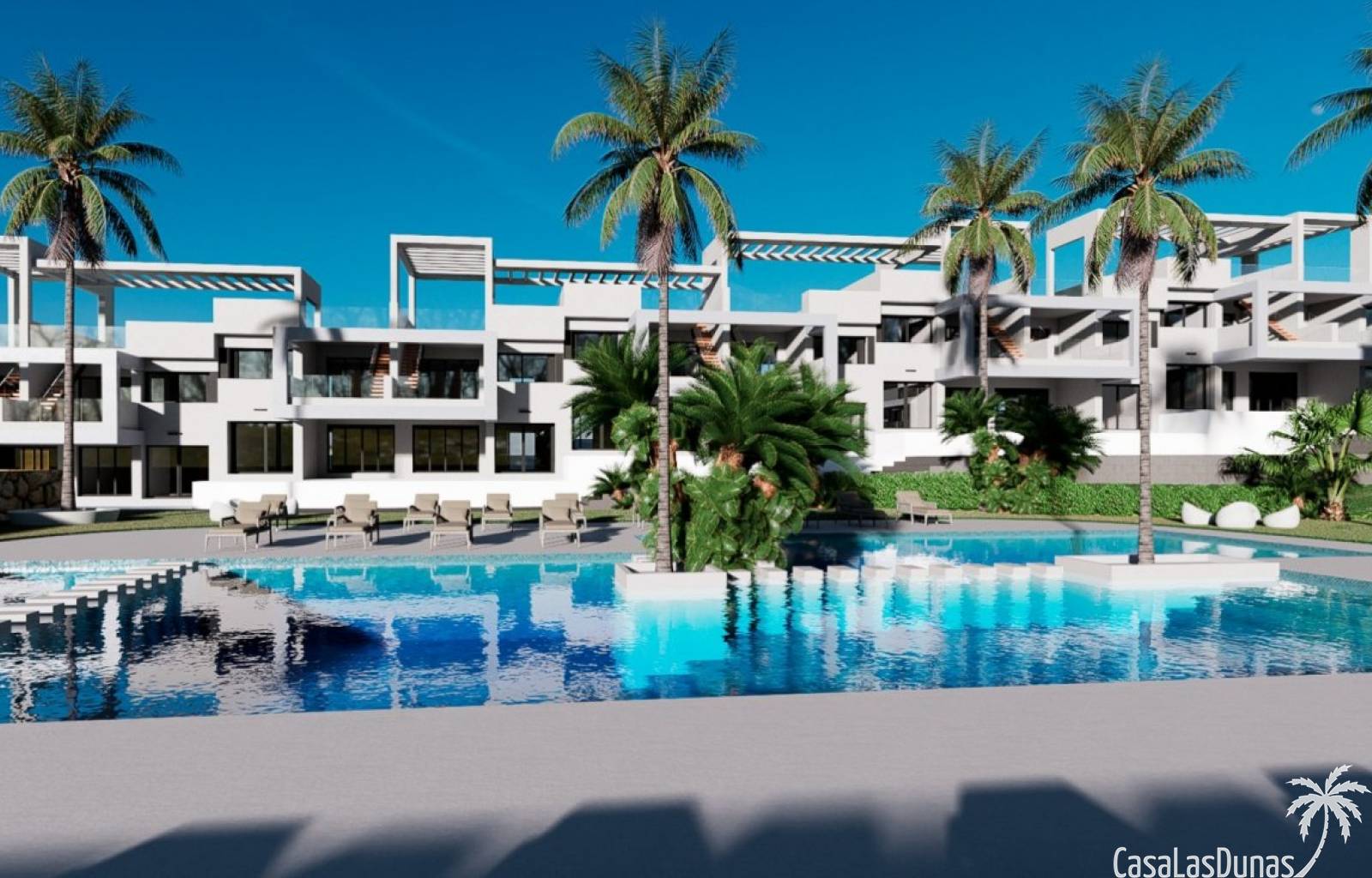 Nieuwbouw complex bestaat uit 20 bungalows met 2 slaapkamers en 2 badkamers met toegang tot de gemeenschappelijke ruimtes en het zwembad.