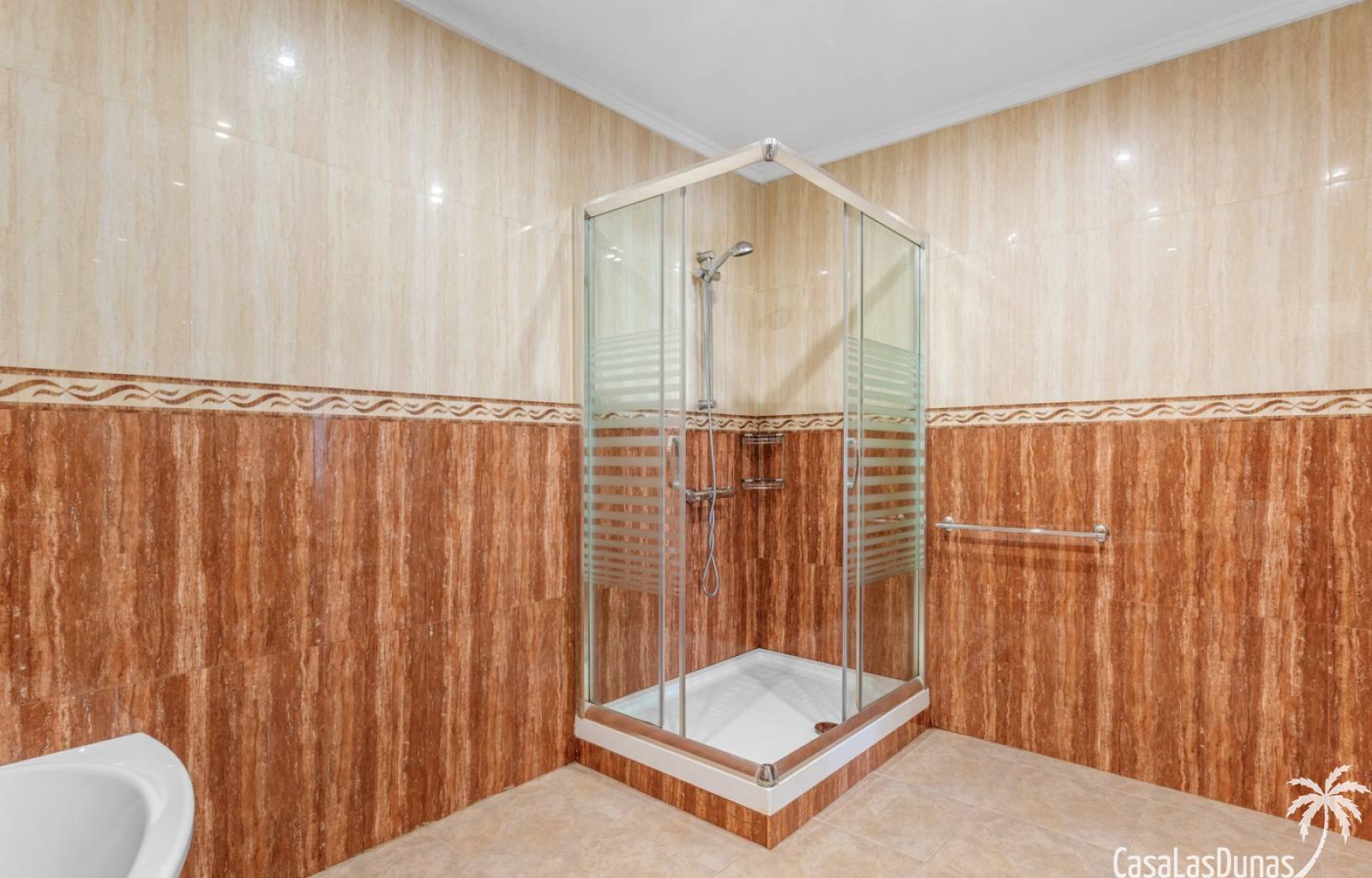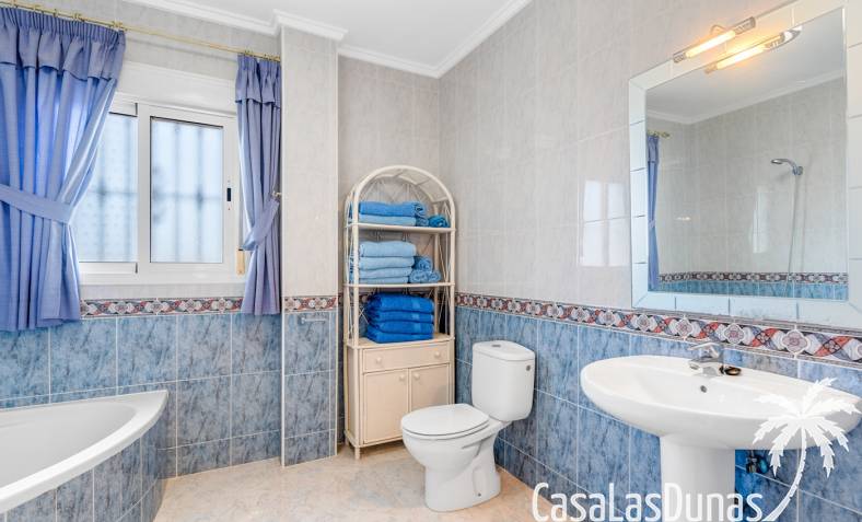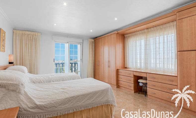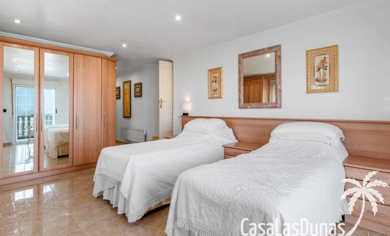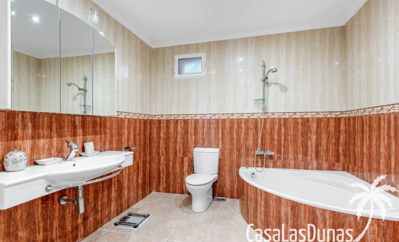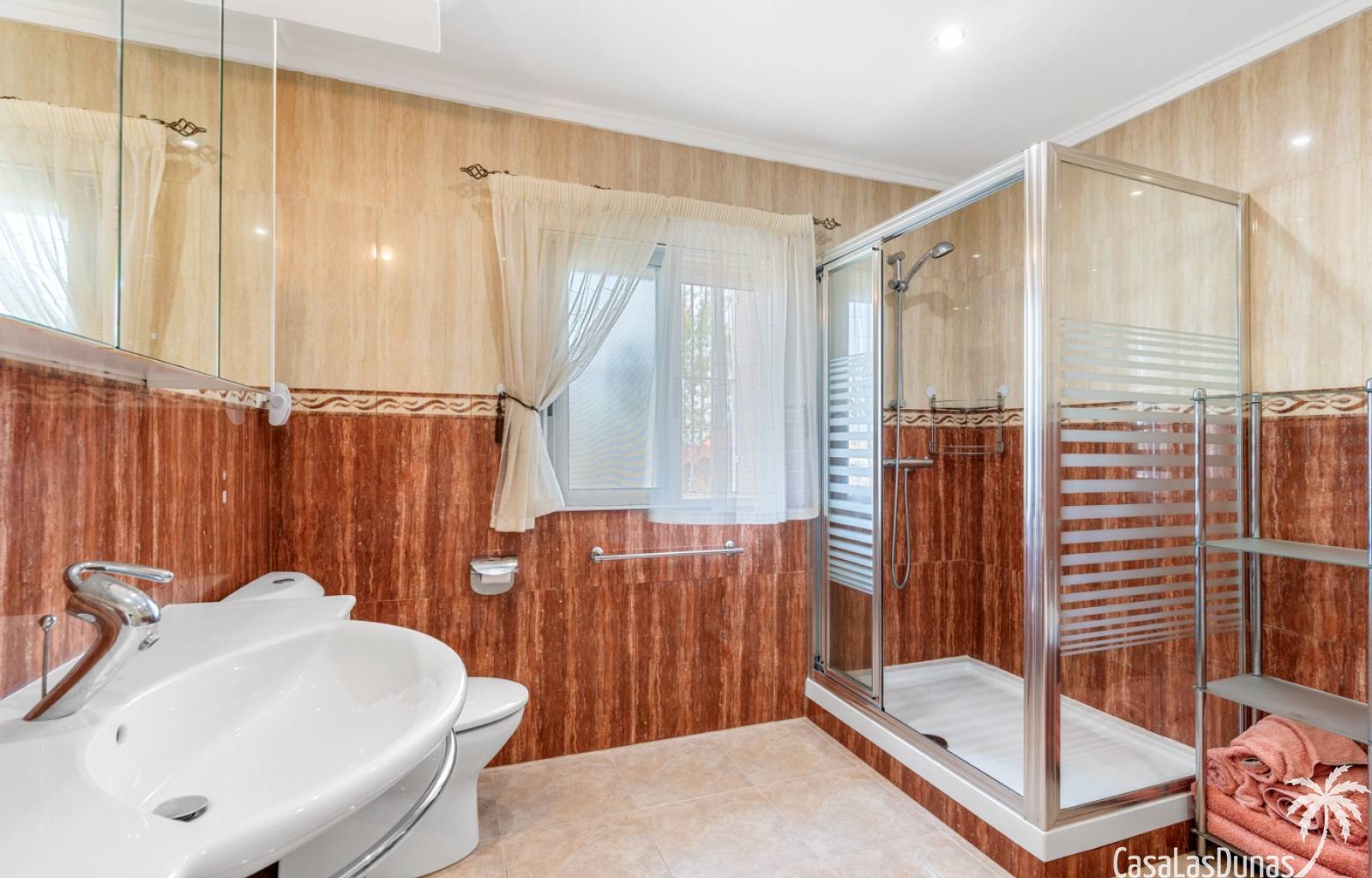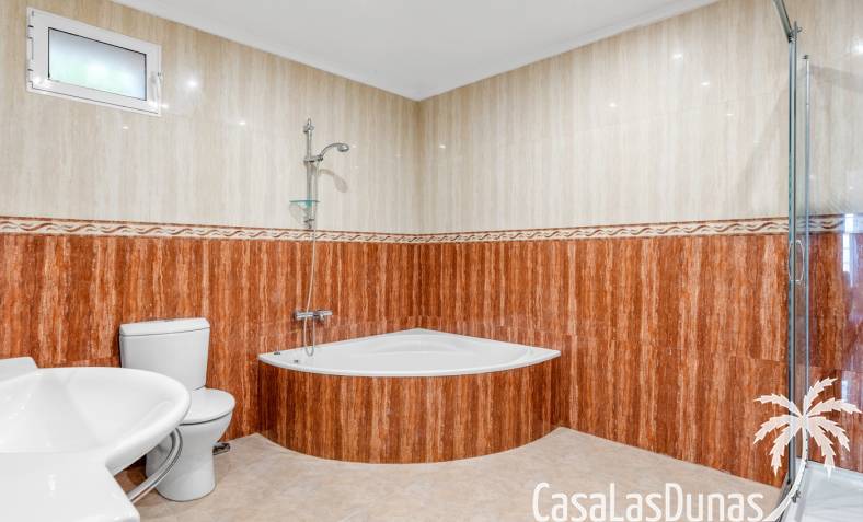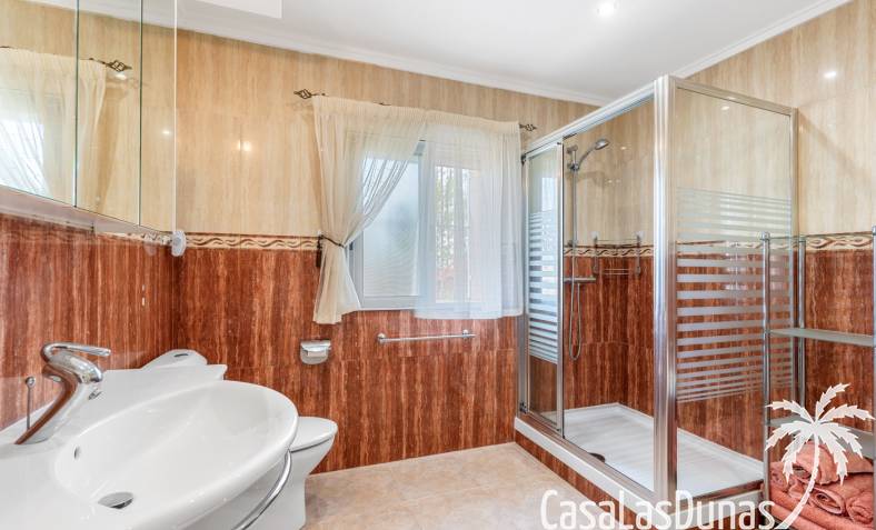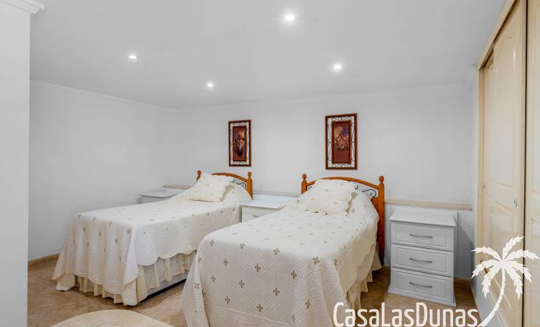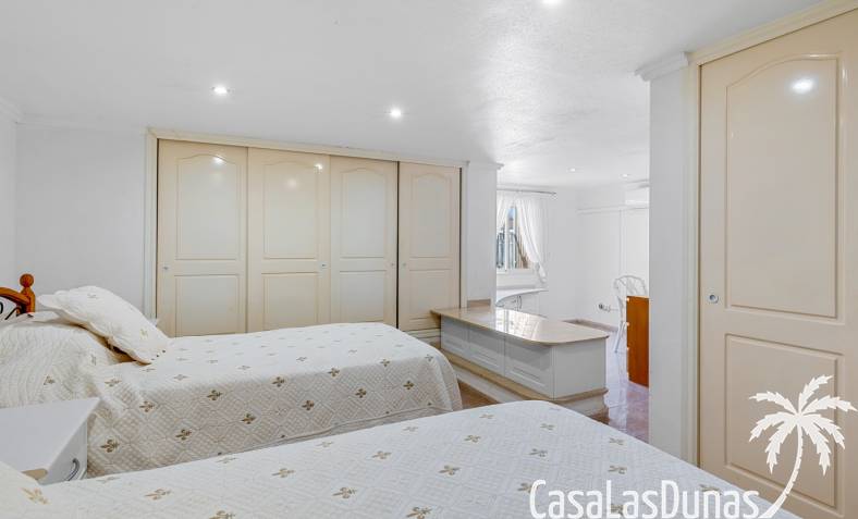 Het huis staat op een perceel van 1.000 m² en heeft 179 m² aan bebouwde oppervlakte verdeeld over drie niveaus. De hoofdwoning beslaat de eerste twee verdiepingen. Op de begane grond bevindt zich een lichte woonkamer, een volledig uitgeruste keuken, een wasruimte en een slaapkamer met en-suite badkamer. Hoewel deze slaapkamer geen directe toegang tot buiten heeft, zijn de belangrijkste leefruimtes naadloos verbonden met de terrassen en het privézwembad, wat zorgt voor een ontspannen en functionele indeling.