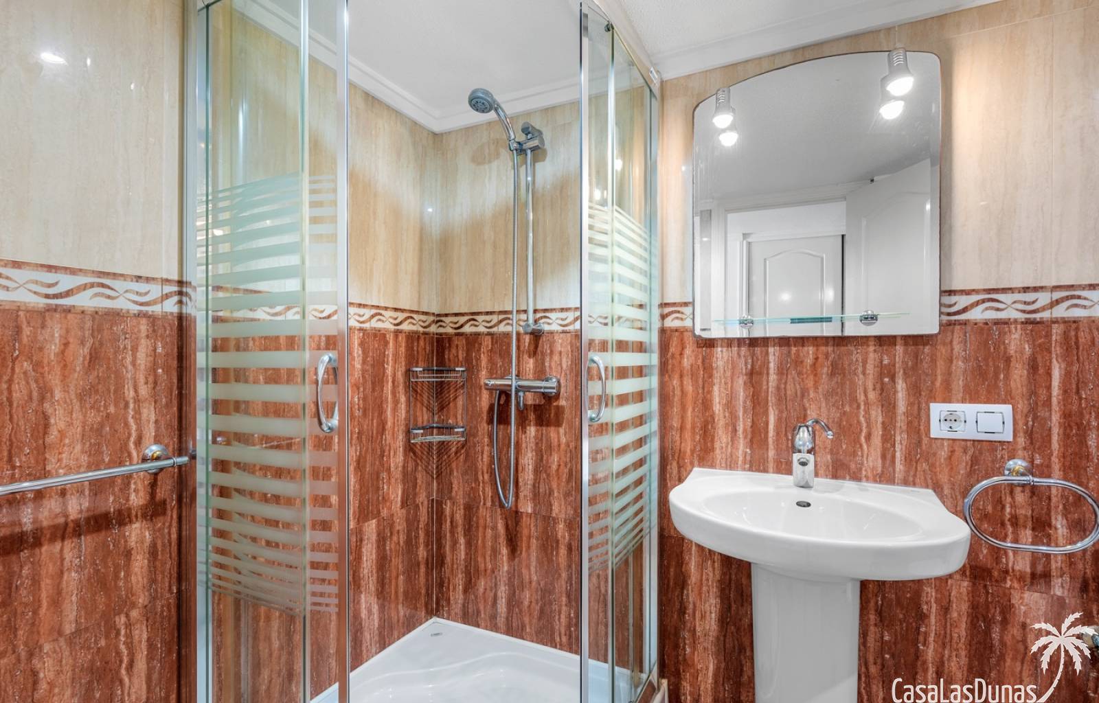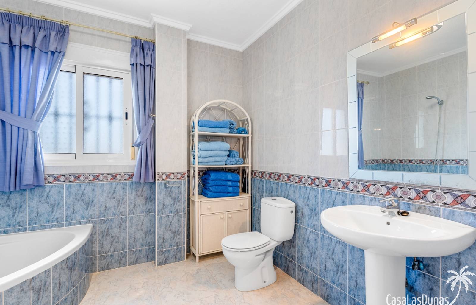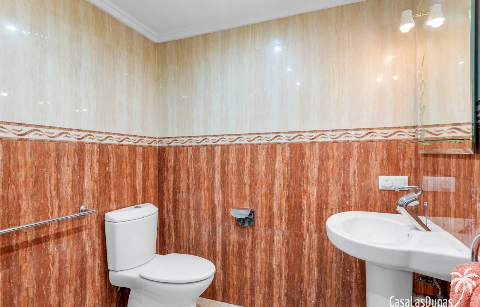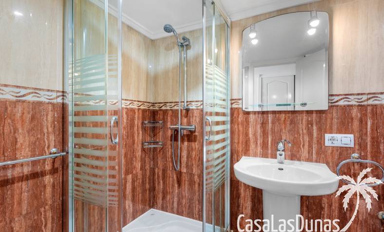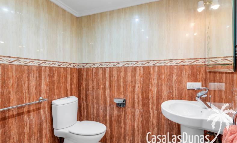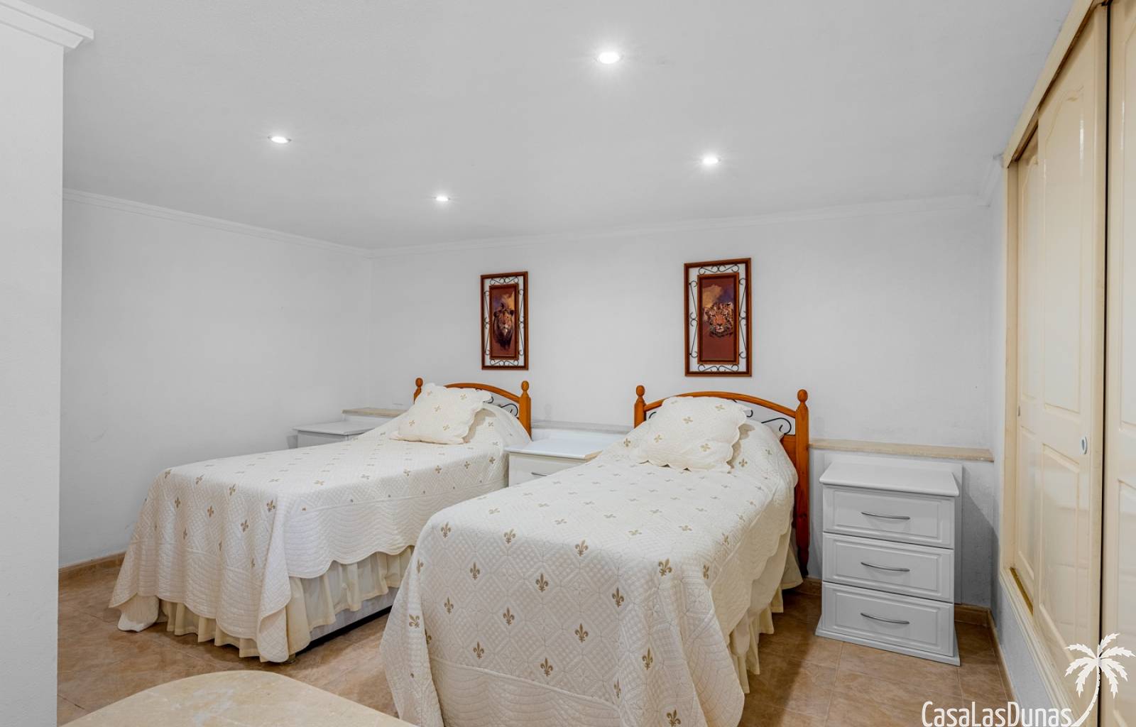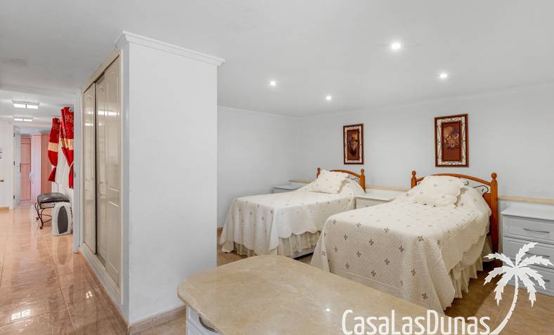 Het huis staat op een perceel van 1.000 m² en heeft 179 m² aan bebouwde oppervlakte verdeeld over drie niveaus. De hoofdwoning beslaat de eerste twee verdiepingen. Op de begane grond bevindt zich een lichte woonkamer, een volledig uitgeruste keuken, een wasruimte en een slaapkamer met en-suite badkamer. Hoewel deze slaapkamer geen directe toegang tot buiten heeft, zijn de belangrijkste leefruimtes naadloos verbonden met de terrassen en het privézwembad, wat zorgt voor een ontspannen en functionele indeling.