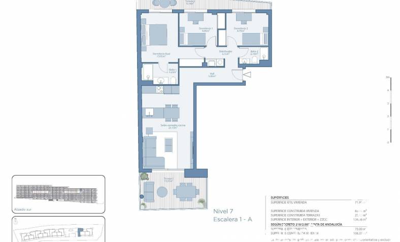 Het project bestaat uit een elegant gebouw van 7 verdiepingen met 126 appartementen met 1, 2 en 3 slaapkamers. Alle woningen zijn ontworpen met een open woonkamer, eetkamer en keuken die de ruimte en het natuurlijke licht maximaliseren. Grote terrassen op het zuiden breiden de woonruimtes uit naar buiten en creëren de perfecte omgeving om te genieten van het panoramische uitzicht en het milde kustklimaat. Elk appartement is voorzien van airconditioning, een volledig uitgeruste moderne keuken, twee privé parkeerplaatsen en een berging.