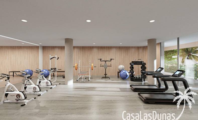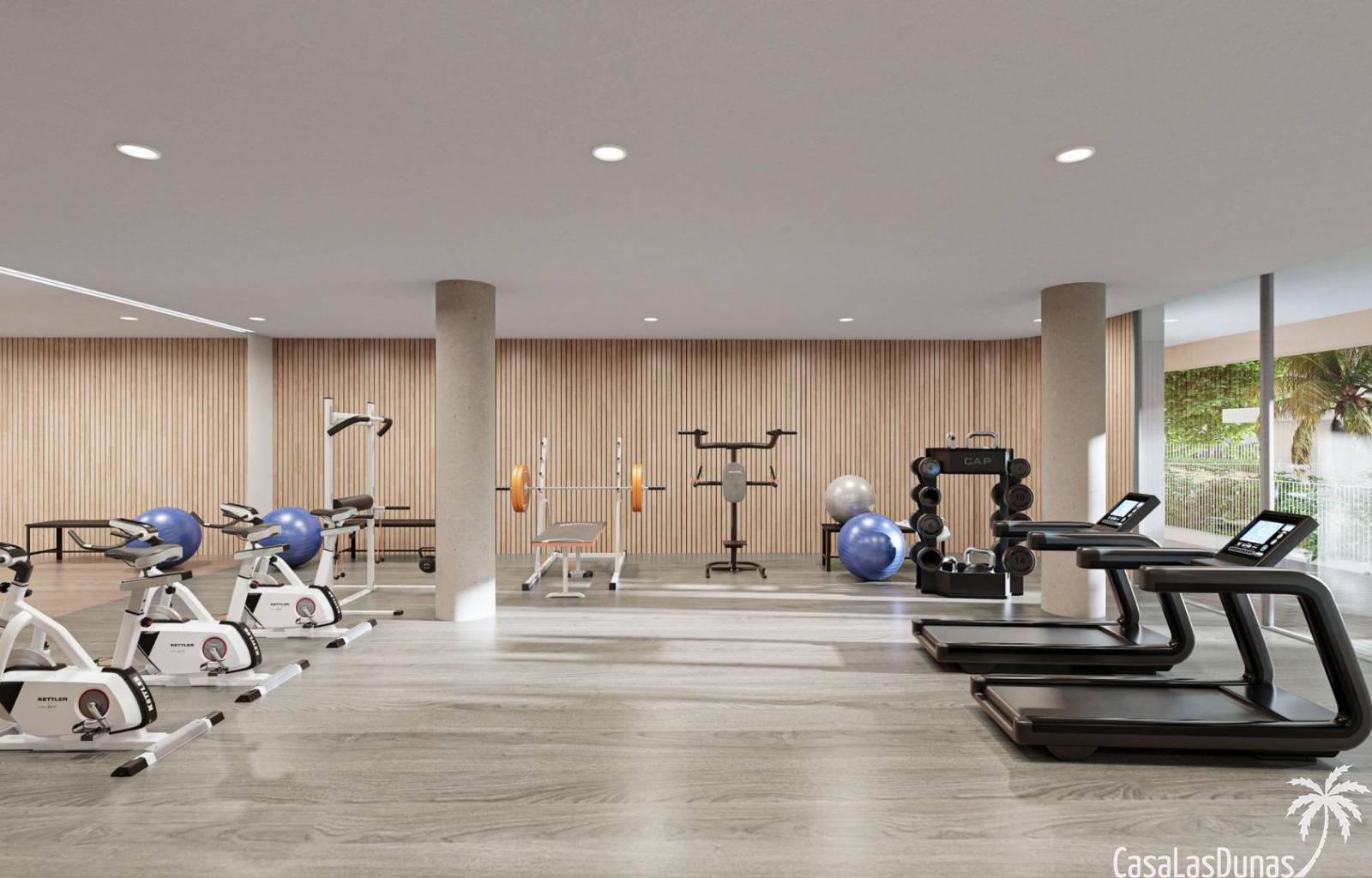 Fitnessruimte en coworkingruimte voor fitness en productiviteit.