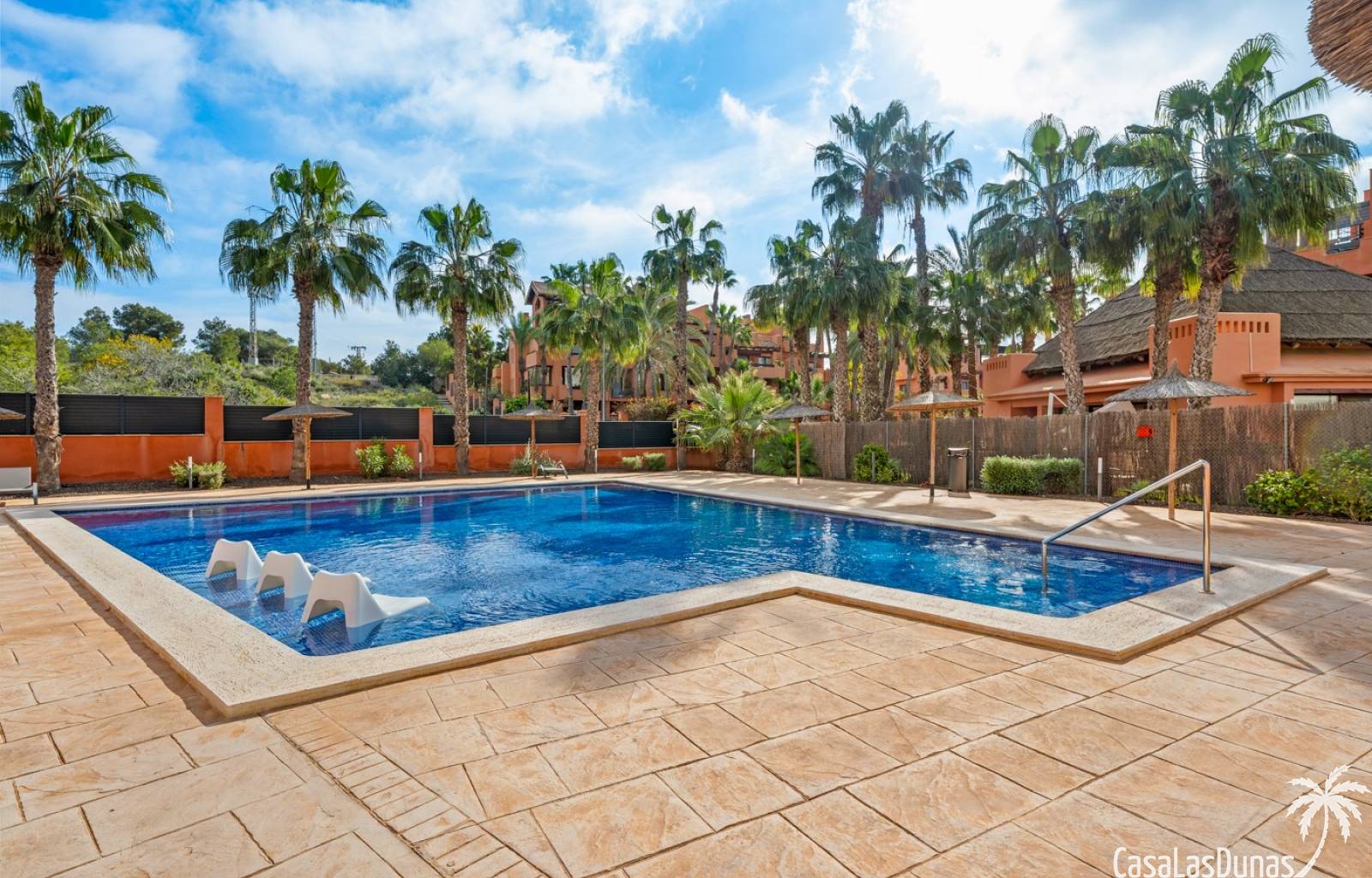 Binnen de urbanisatie is er een verzorgd gemeenschappelijk zwembad met ligzetels en parasols, ideaal om te ontspannen tijdens warme dagen, terwijl de residentie zelf gekenmerkt wordt door een rustige en aangename sfeer.