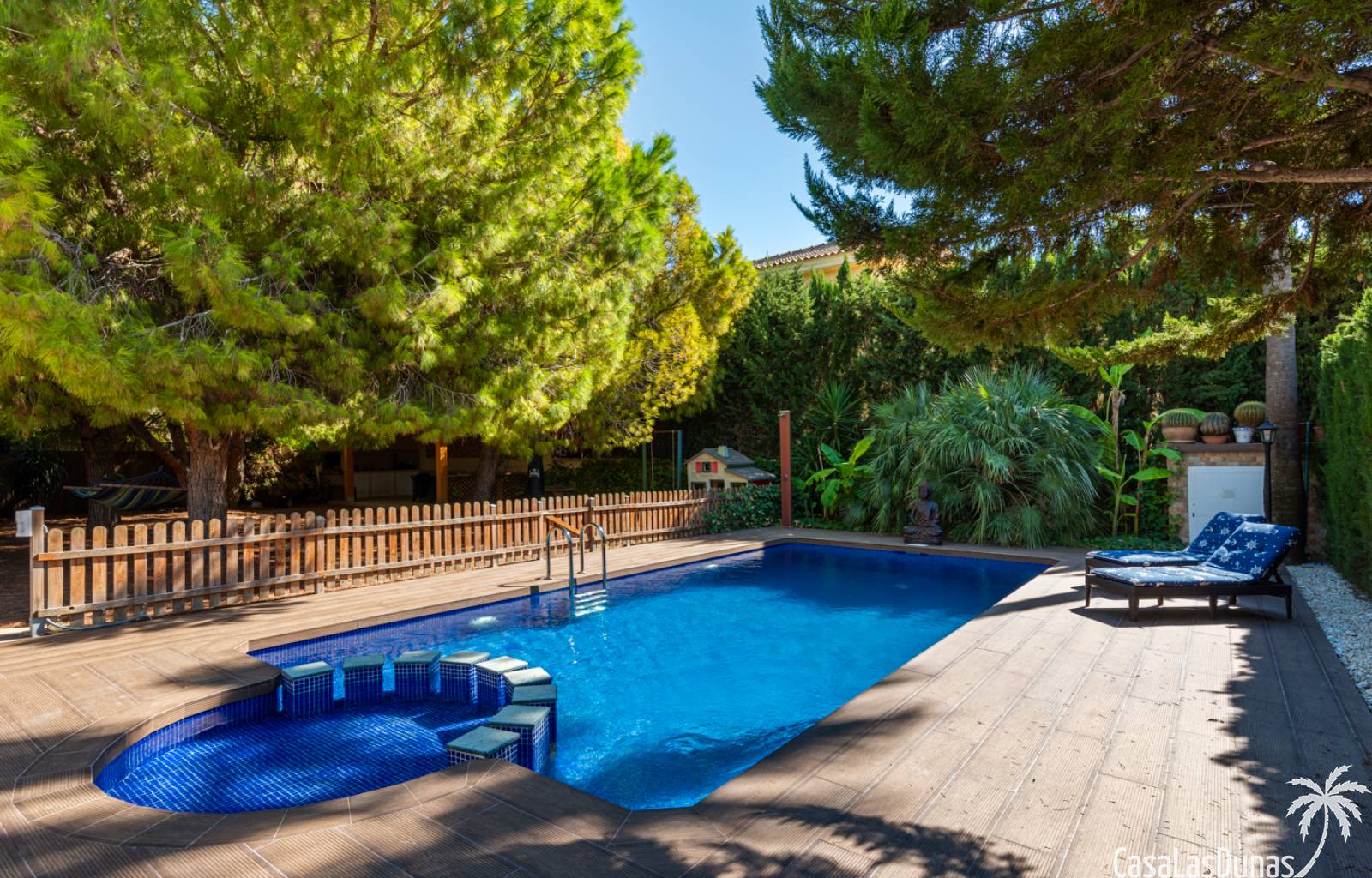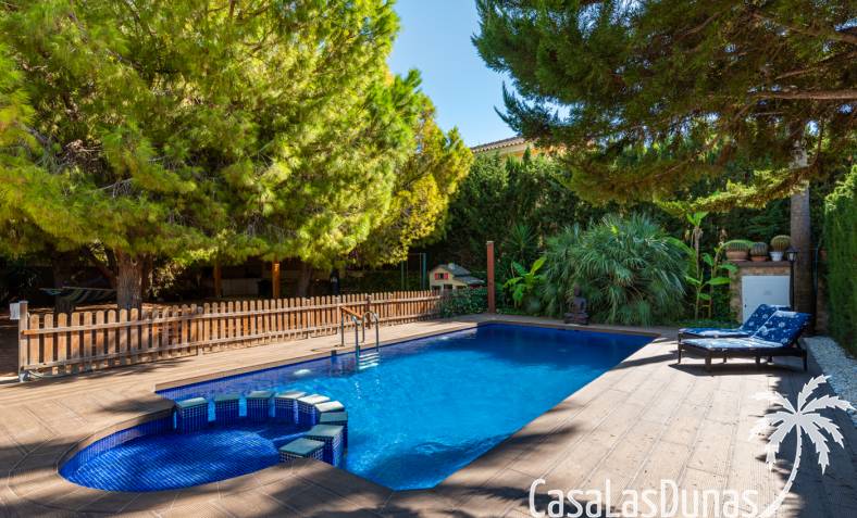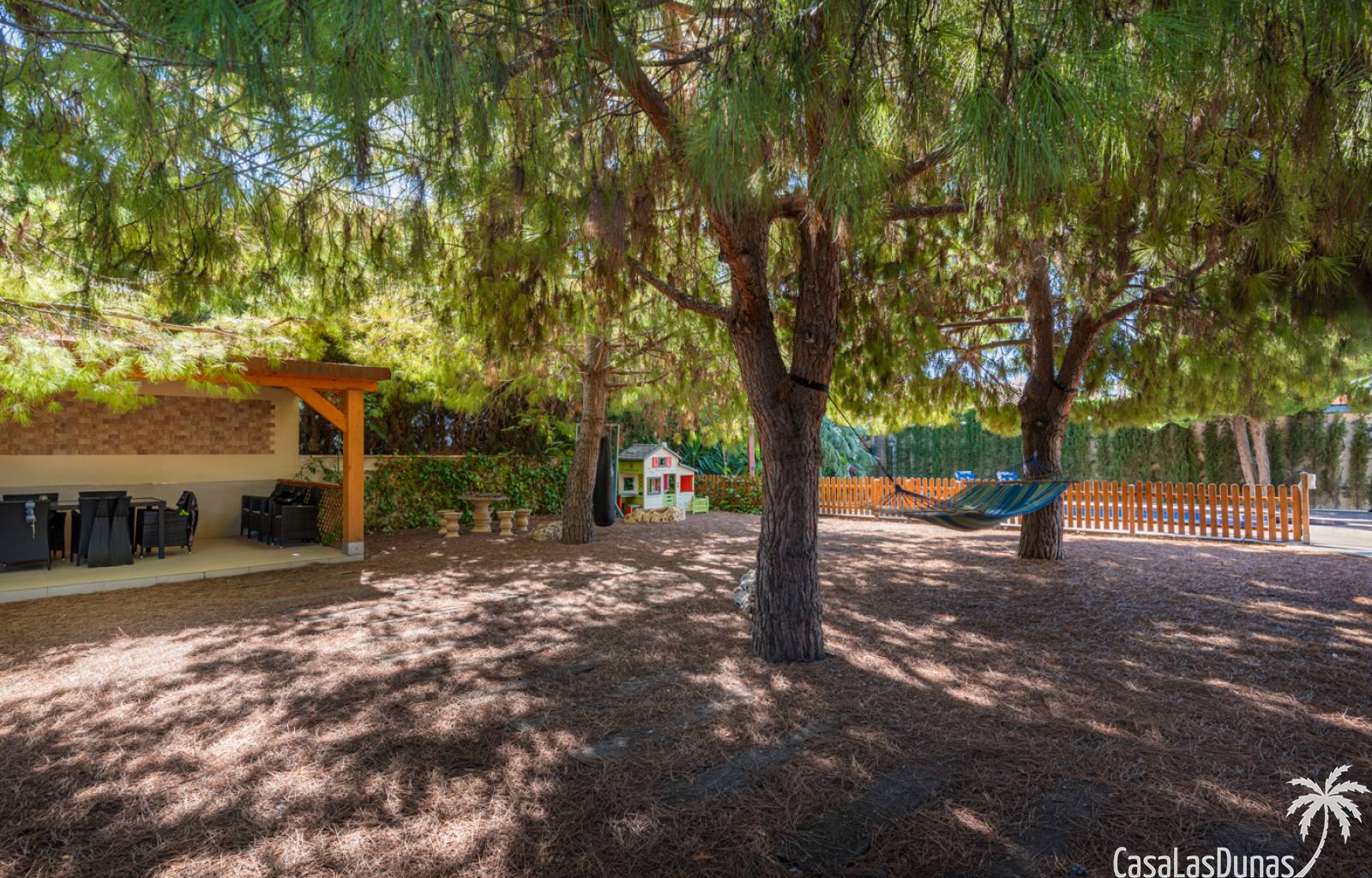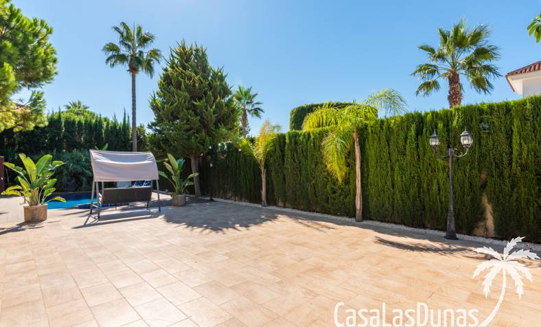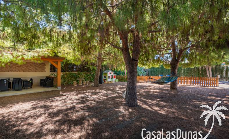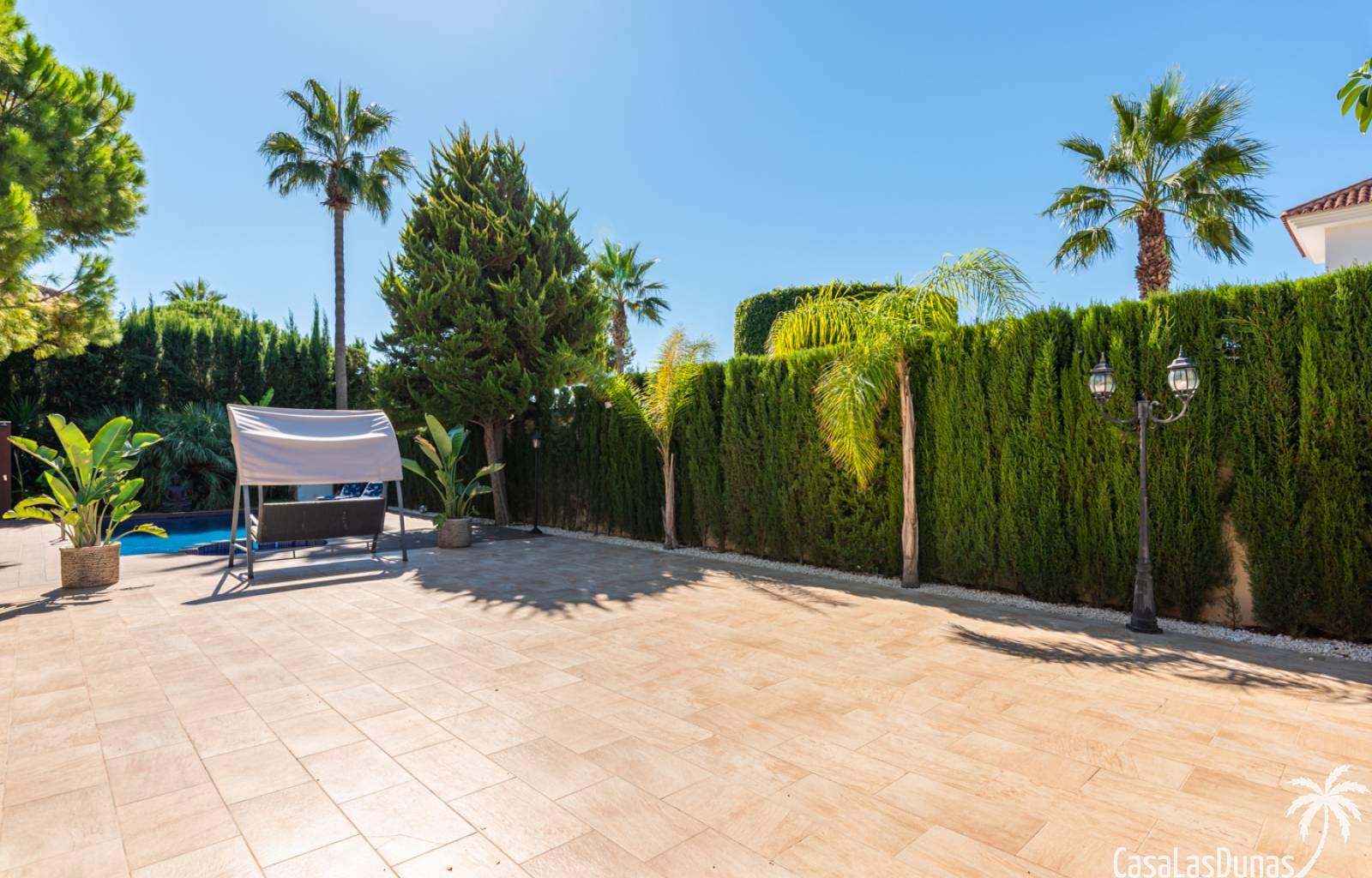 Het perceel is 882 m² groot en biedt een zoutwaterzwembad van 8 x 4 m, een buitenkeuken met barbecue en een kinderspeelplaats. Er is voldoende ruimte voor diverse zitjes en ligstoelen.