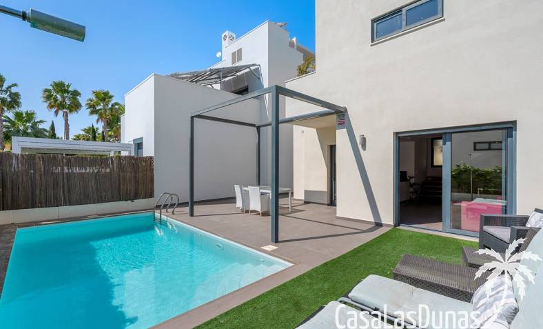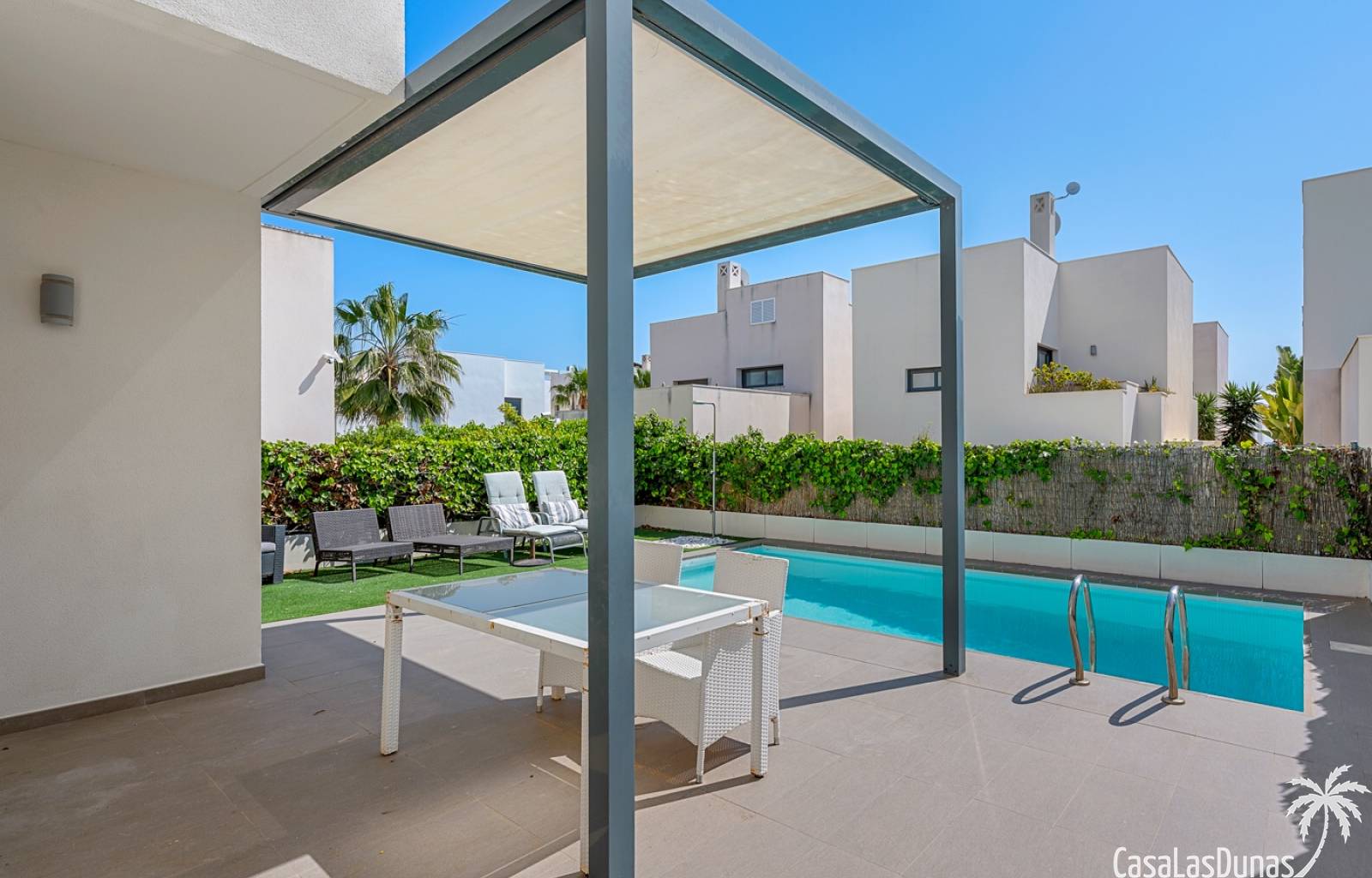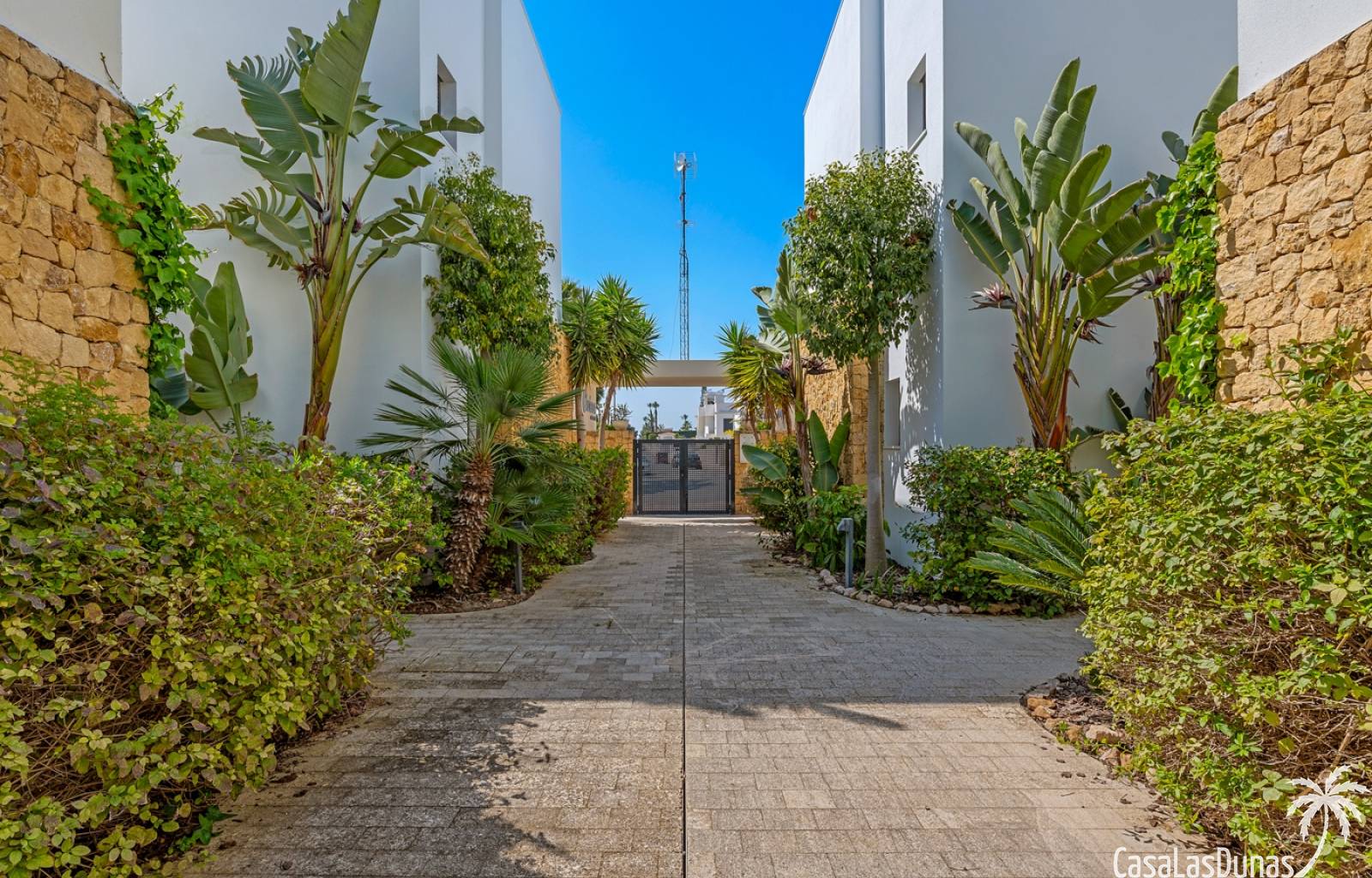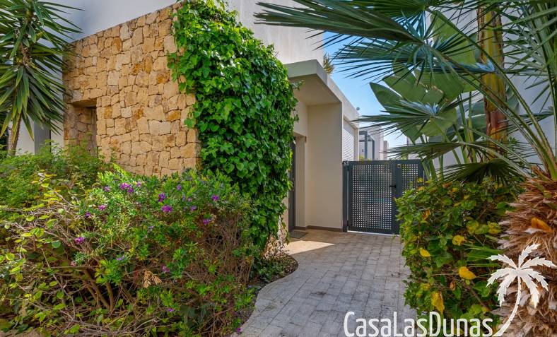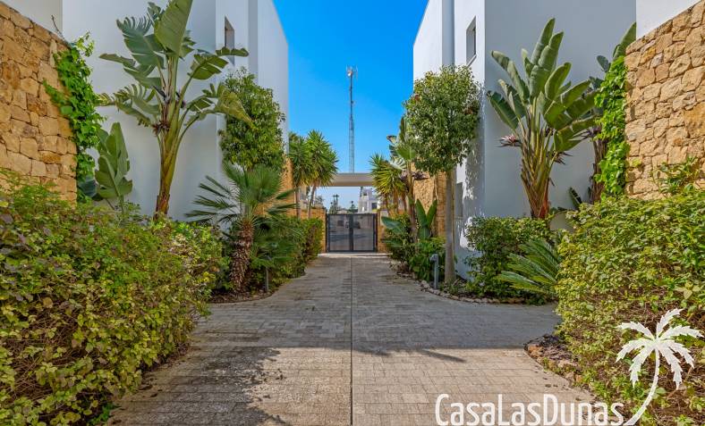 De villa ligt in een afgesloten wooncomplex met tropische tuinen, wat zorgt voor een veilige en rustige omgeving.
