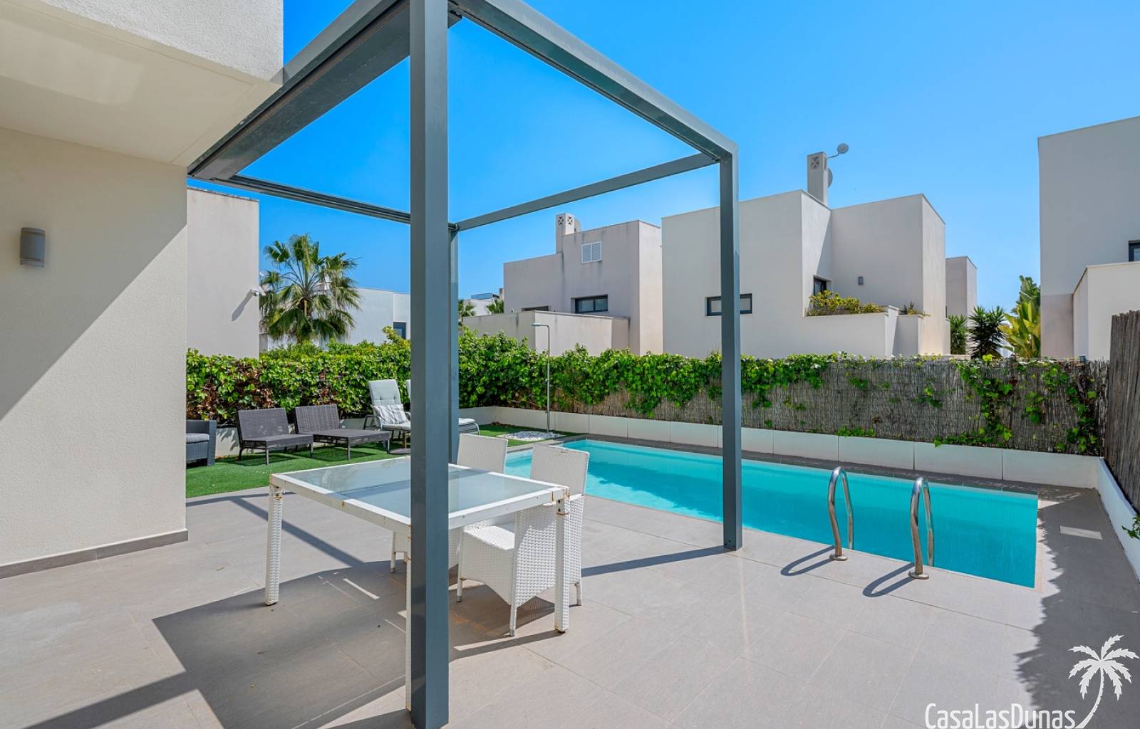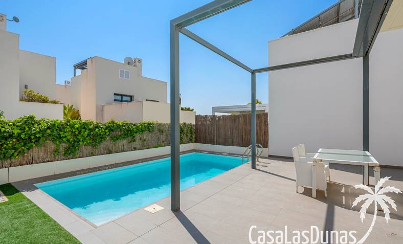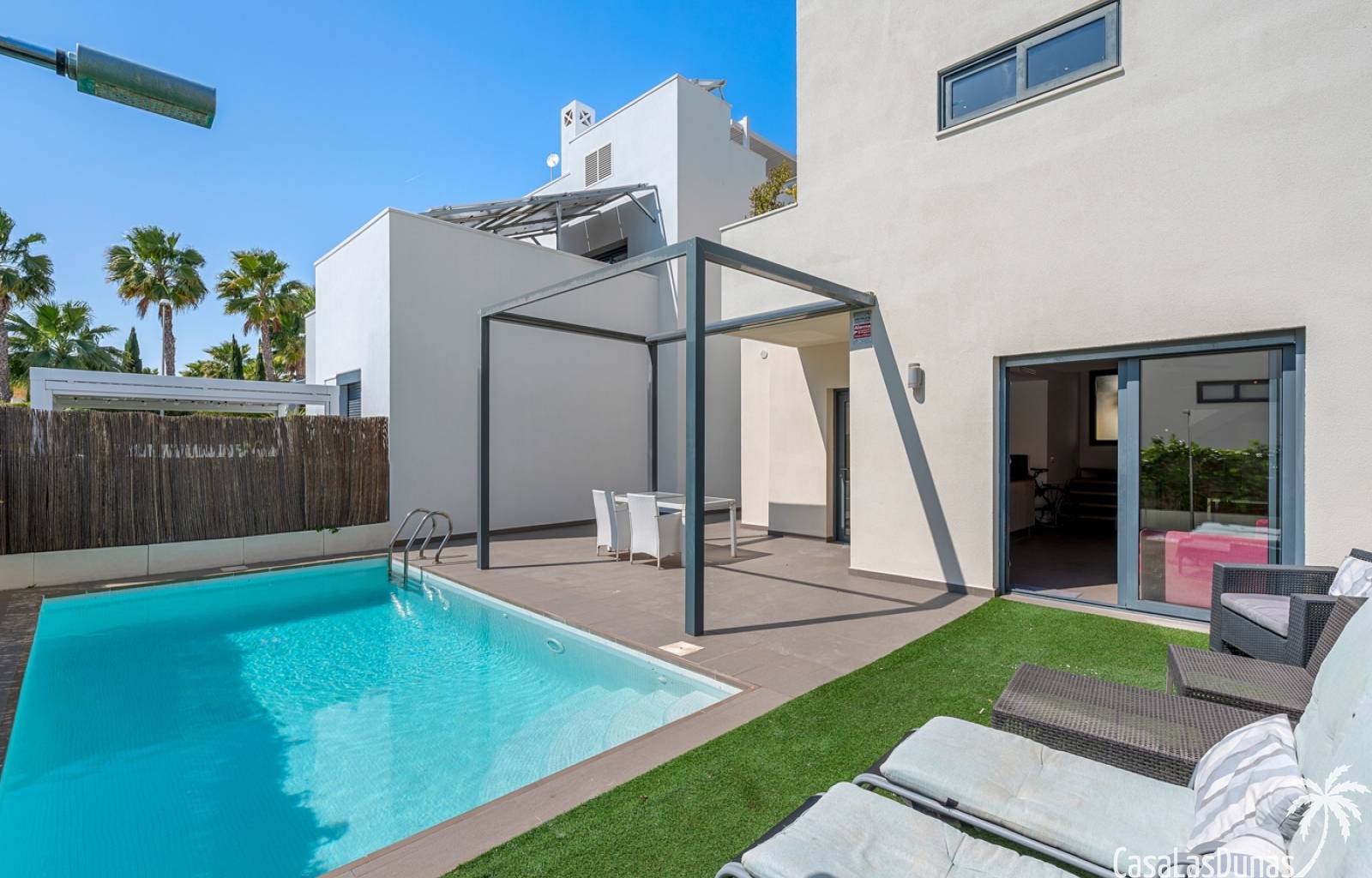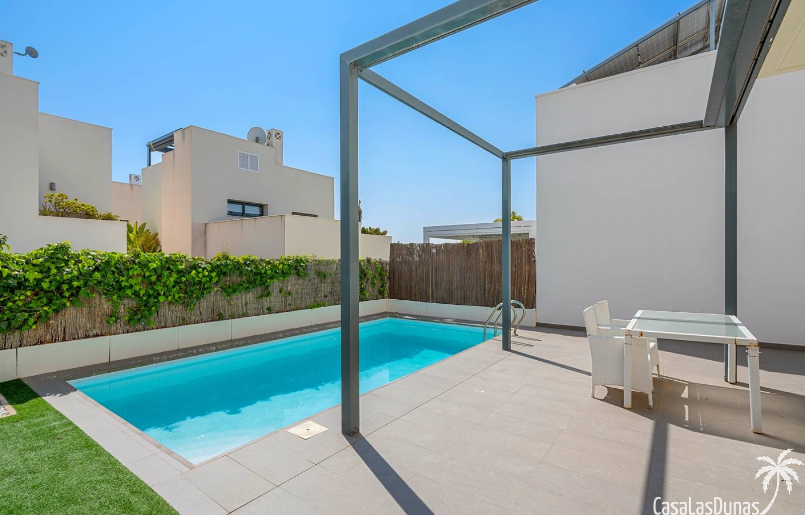 De villa ligt in een afgesloten wooncomplex met tropische tuinen, wat zorgt voor een veilige en rustige omgeving.