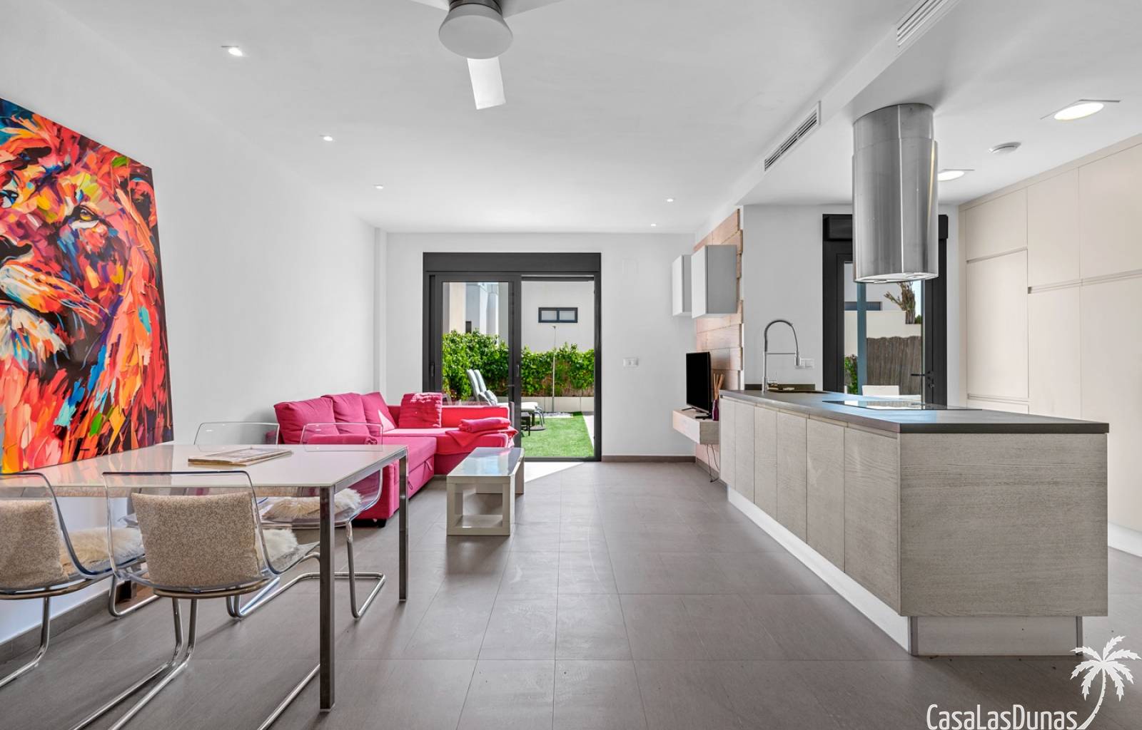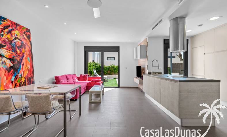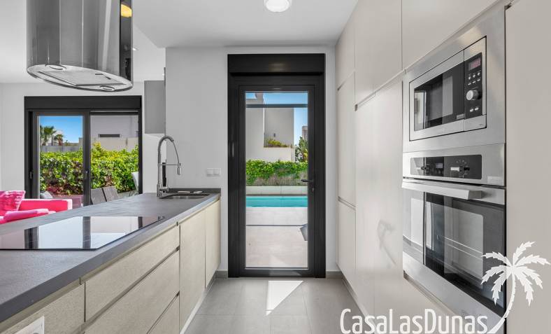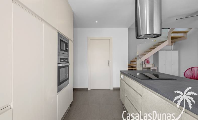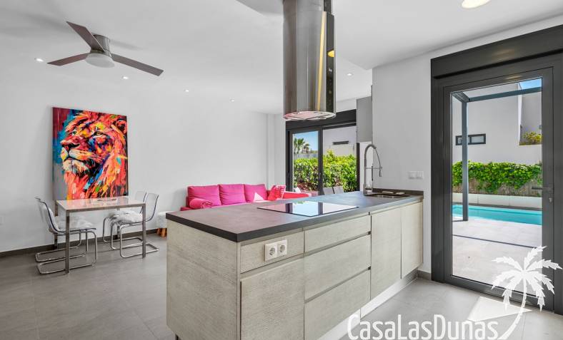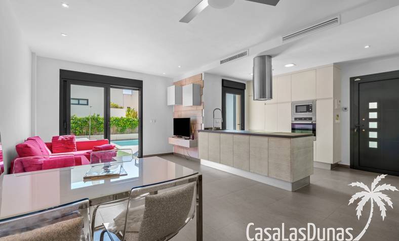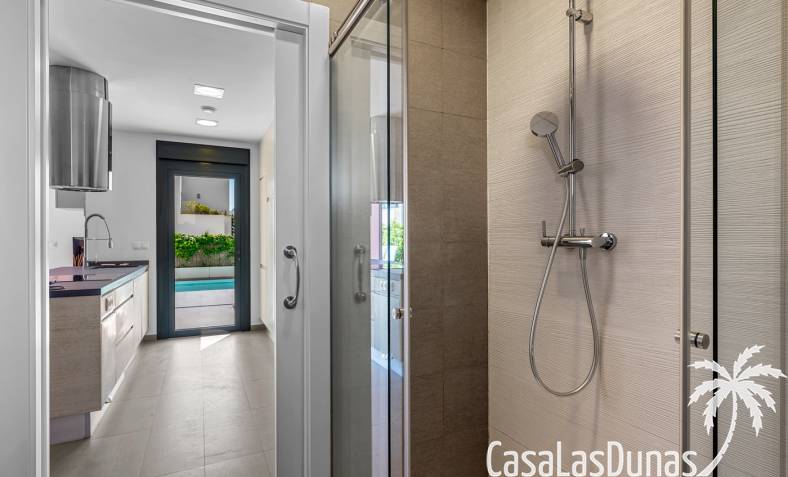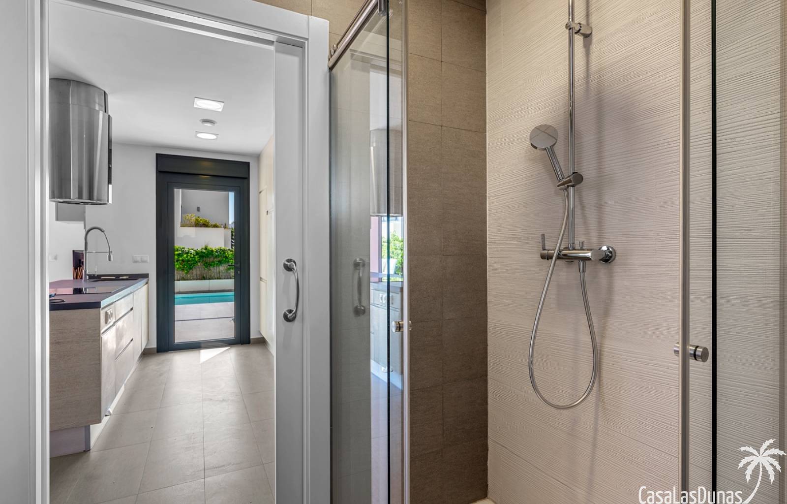 Op de begane grond biedt de villa een modern en functioneel ontwerp met een open keuken die volledig geïntegreerd is in een ruime en lichte woonkamer. Er is ook een complete badkamer op deze verdieping.