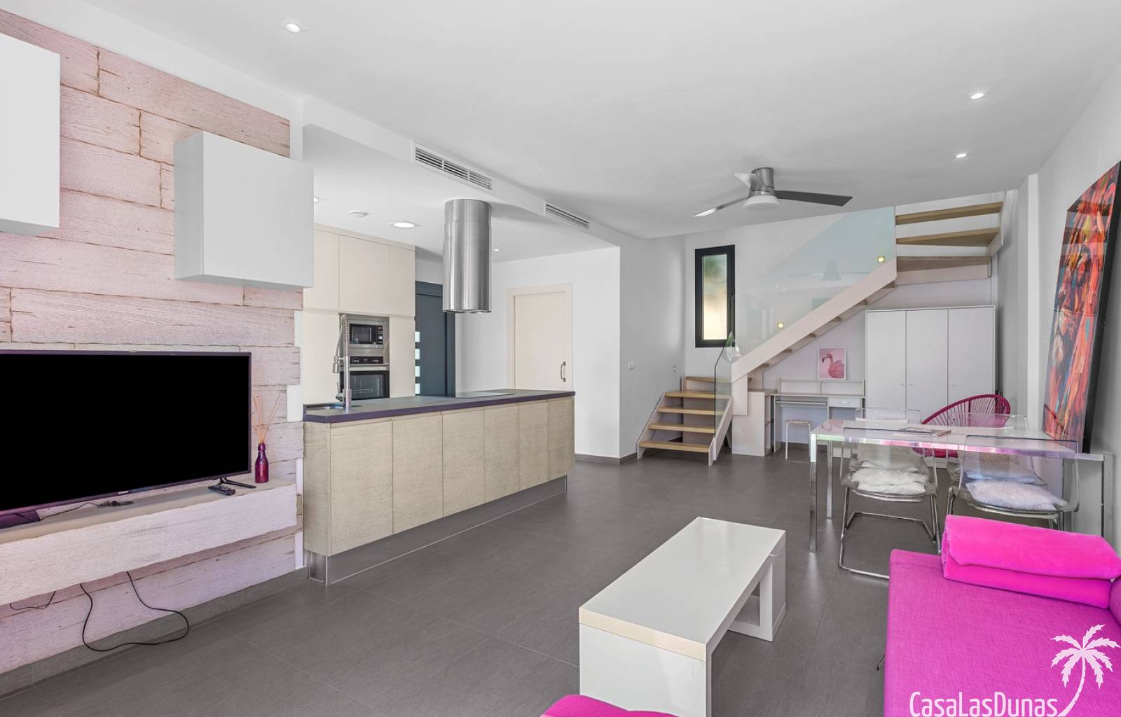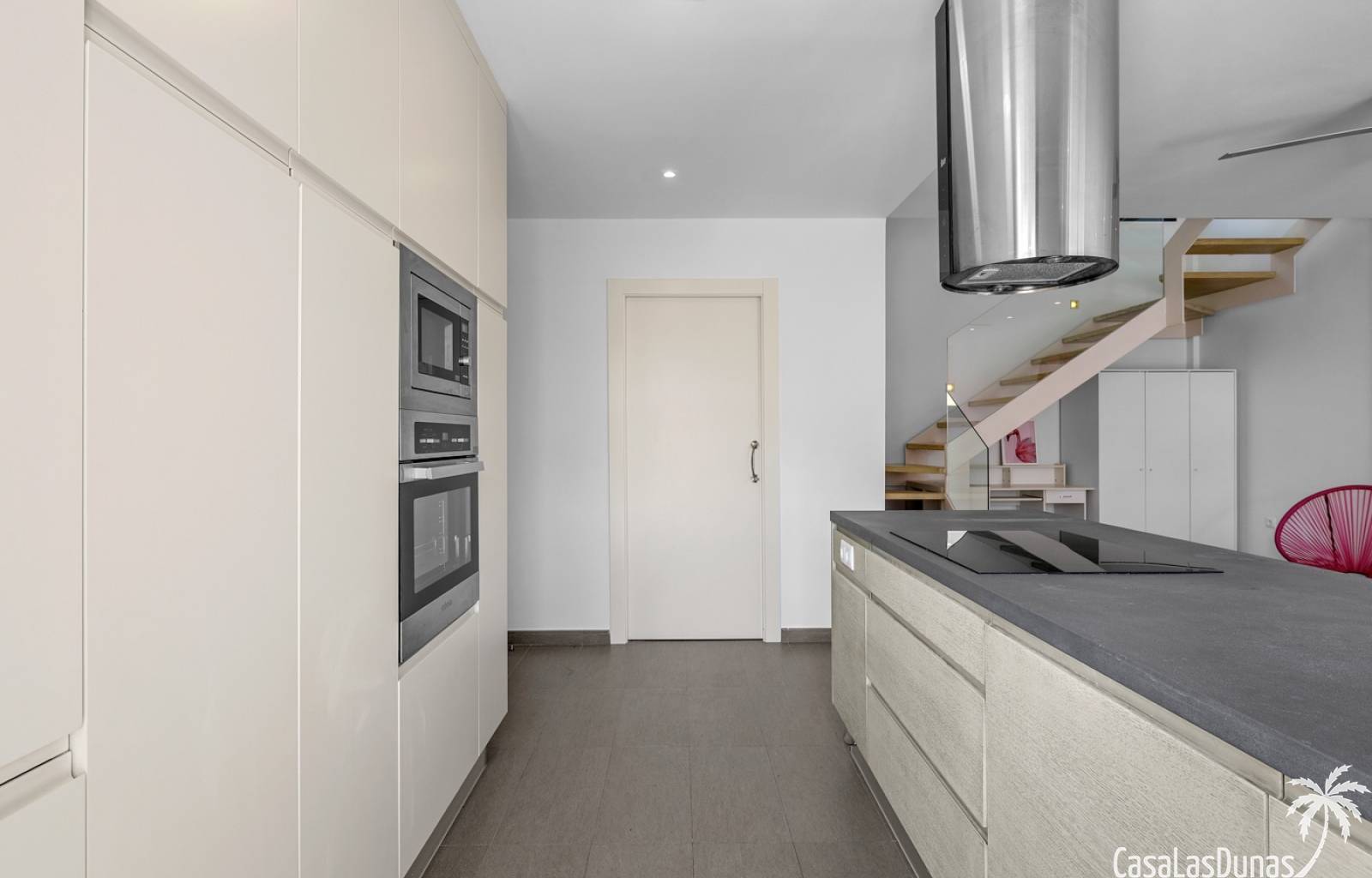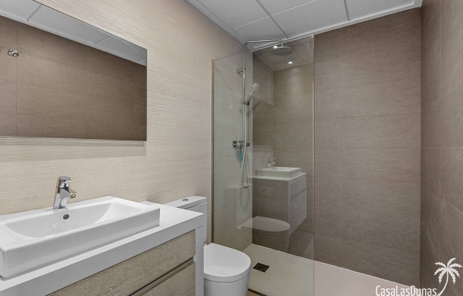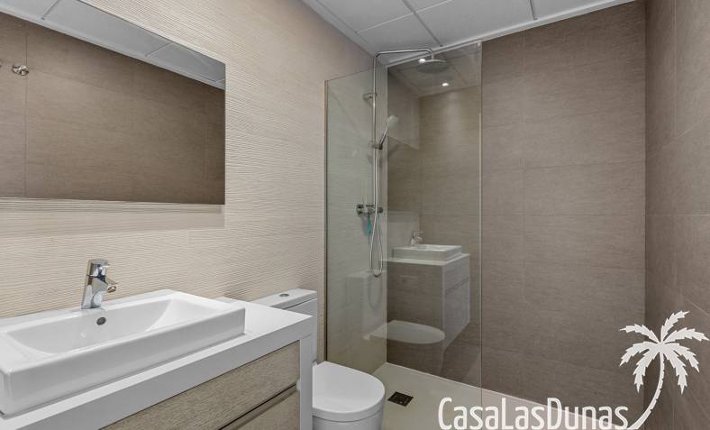 Op de begane grond biedt de villa een modern en functioneel ontwerp met een open keuken die volledig geïntegreerd is in een ruime en lichte woonkamer. Er is ook een complete badkamer op deze verdieping.