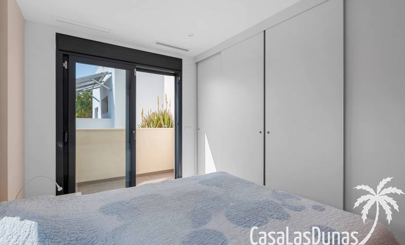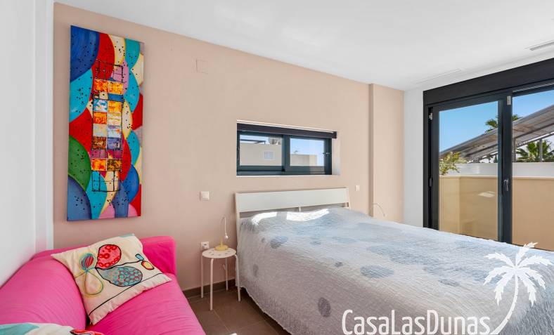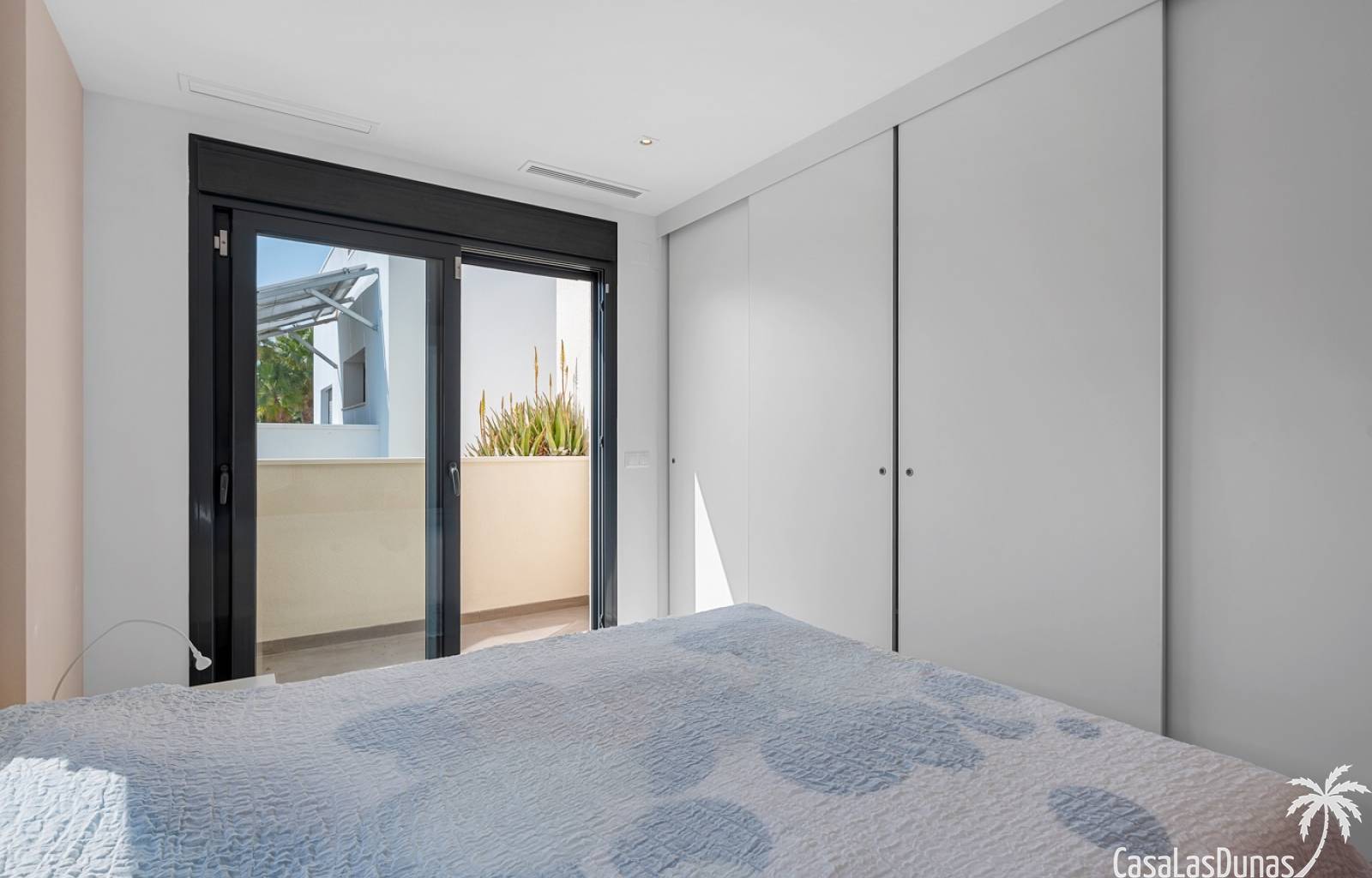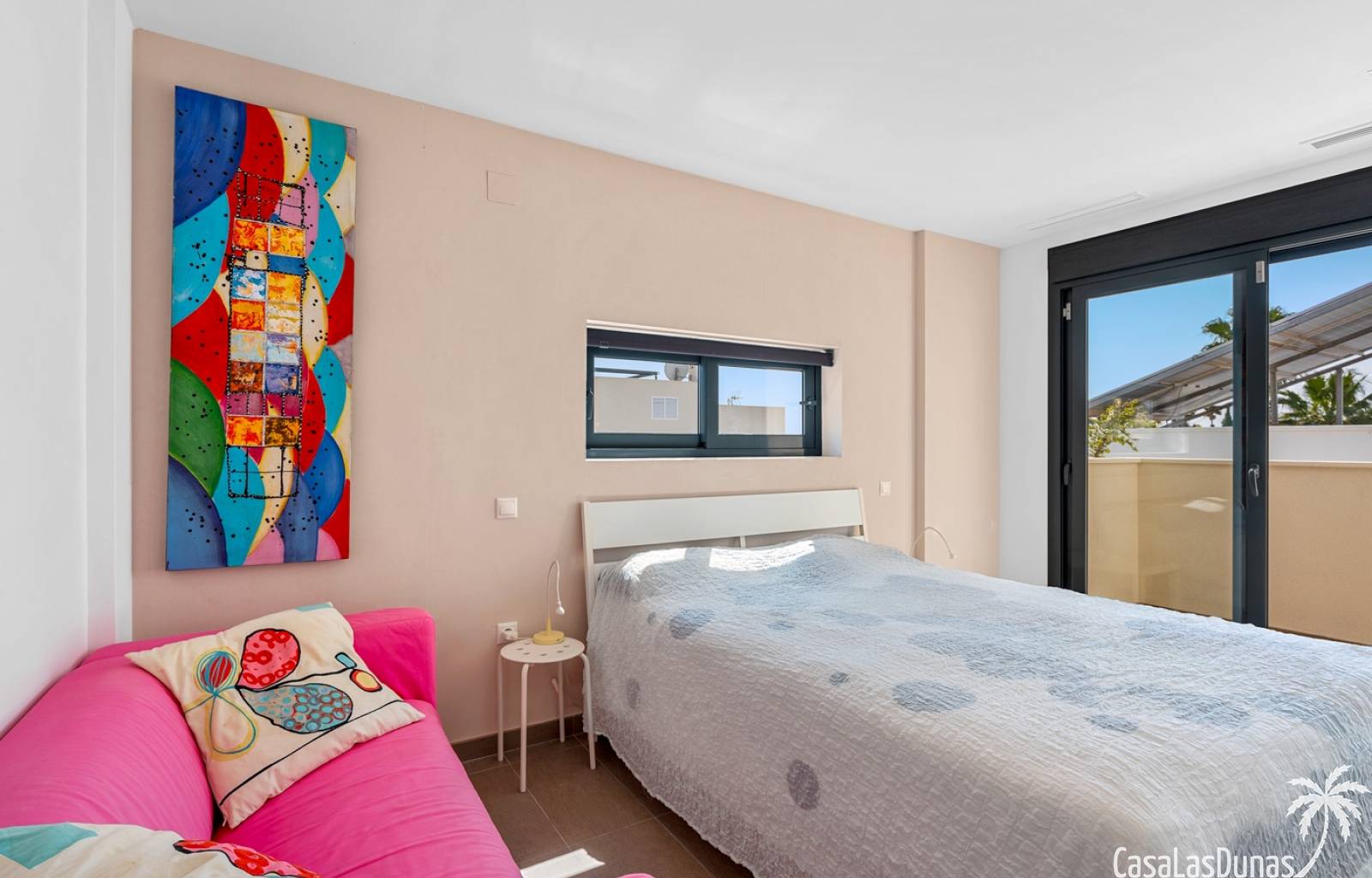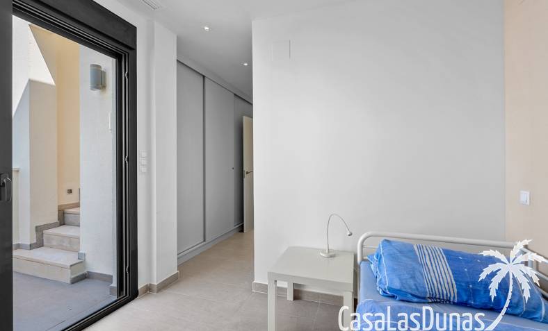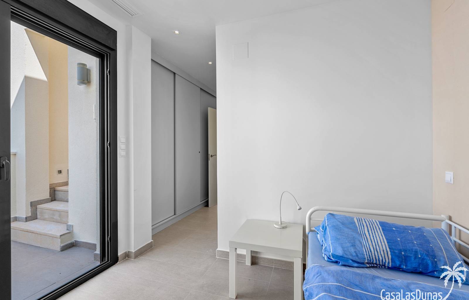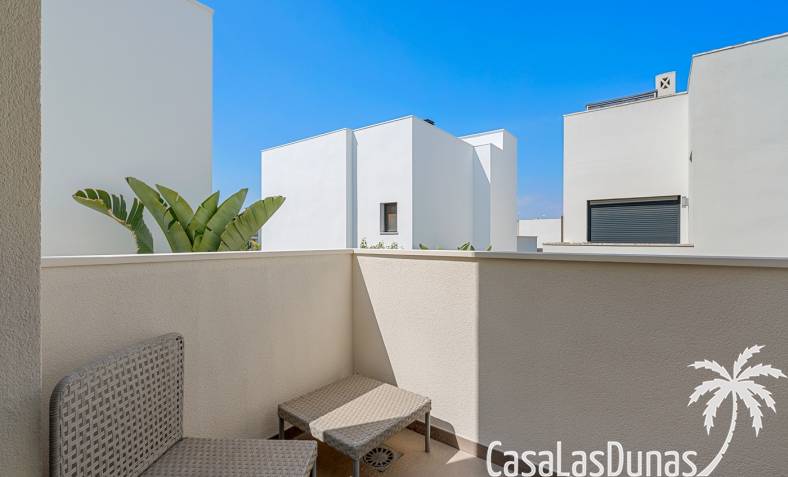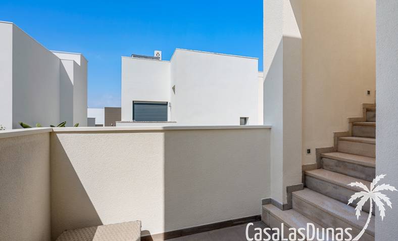 Op de eerste verdieping zijn er twee tweepersoonsslaapkamers en een tweede badkamer. De hoofdslaapkamer heeft een eigen balkon, terwijl de gastenslaapkamer ook een balkon heeft met directe toegang via een trap naar een groot solarium met prachtig uitzicht.