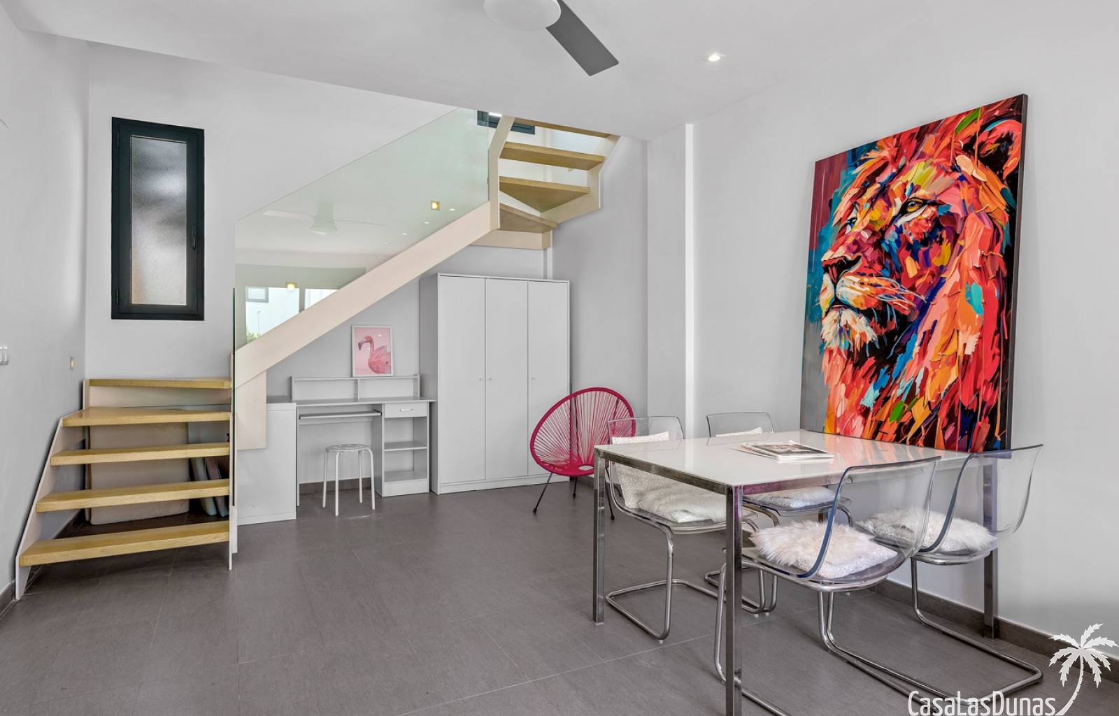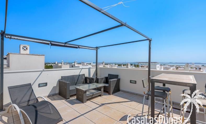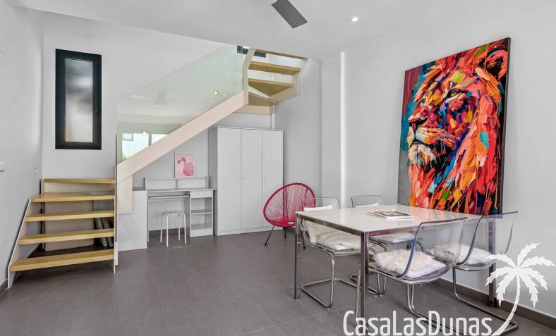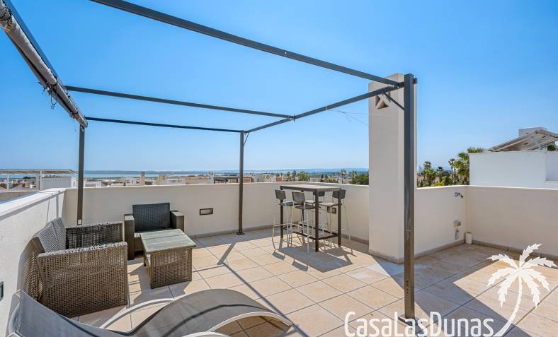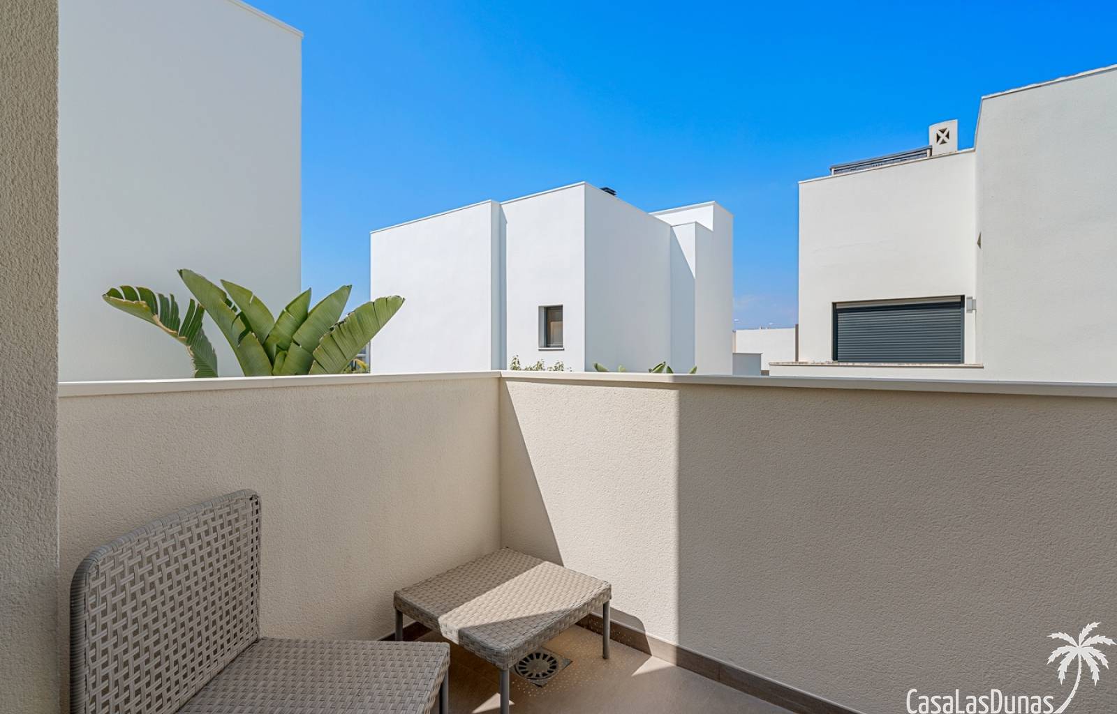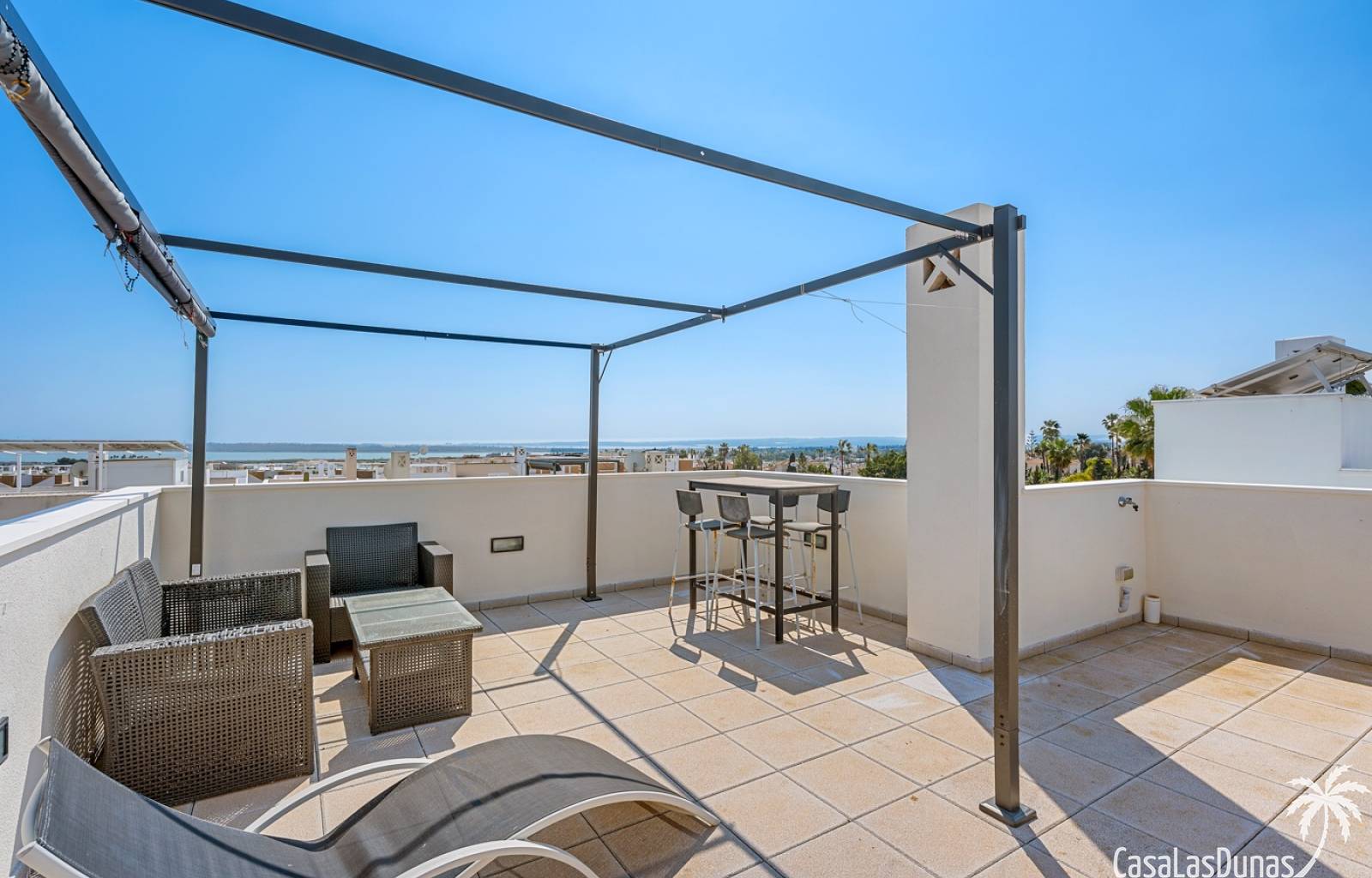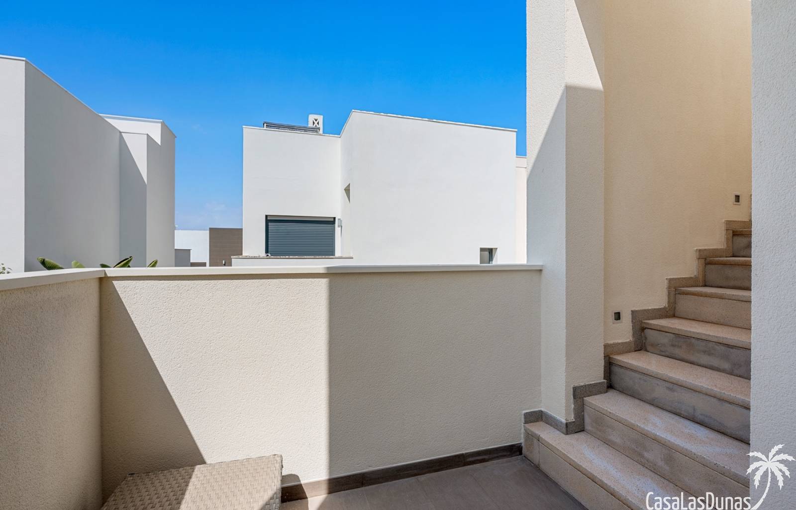 Op de eerste verdieping zijn er twee tweepersoonsslaapkamers en een tweede badkamer. De hoofdslaapkamer heeft een eigen balkon, terwijl de gastenslaapkamer ook een balkon heeft met directe toegang via een trap naar een groot solarium met prachtig uitzicht.