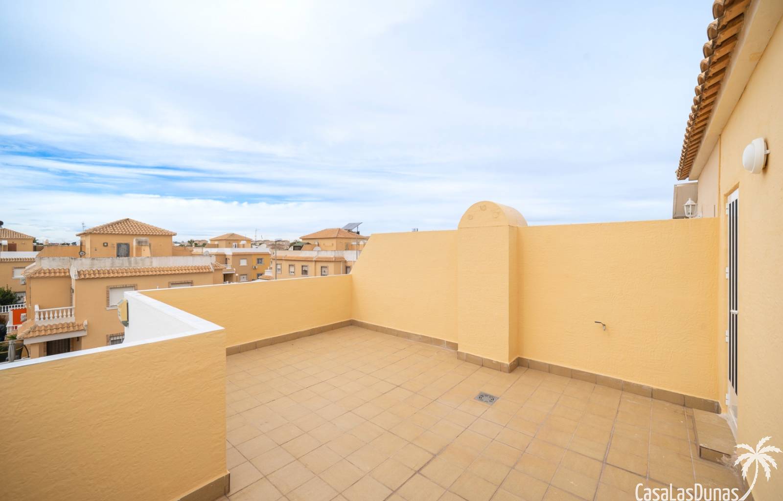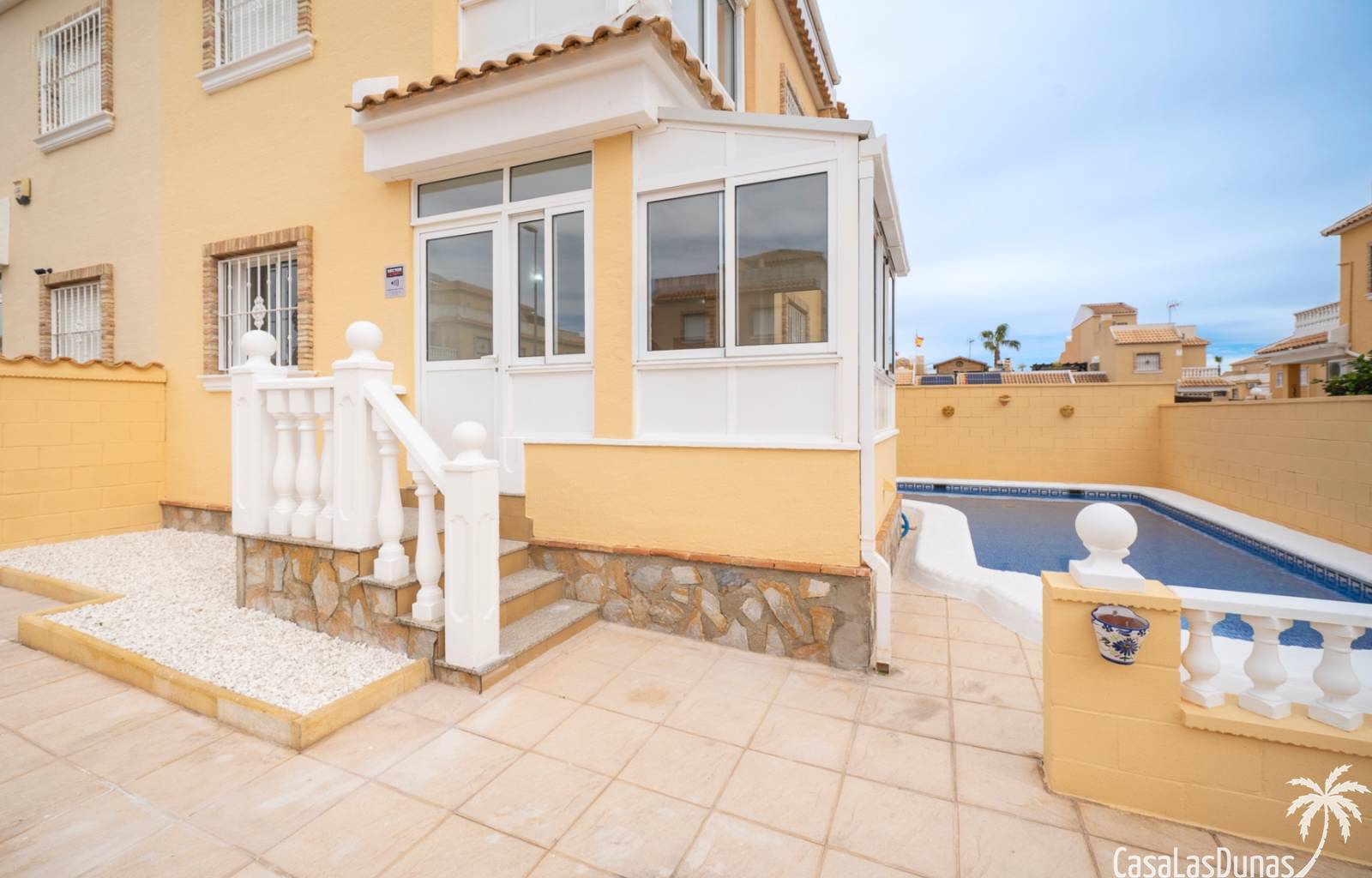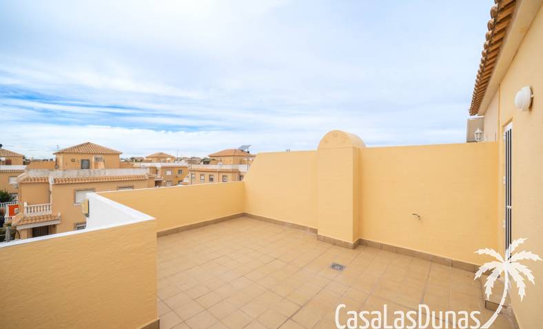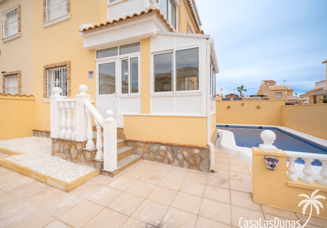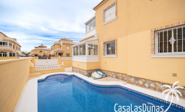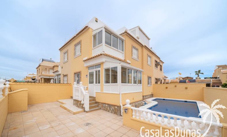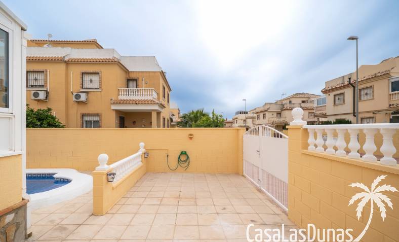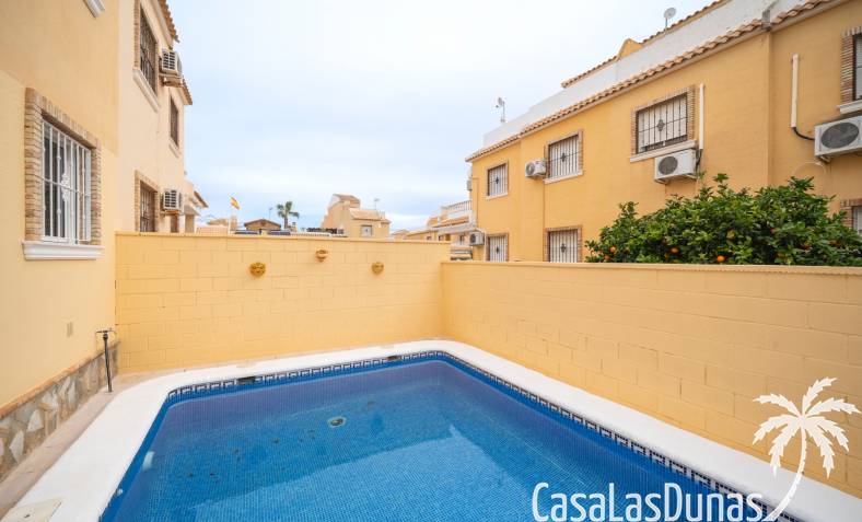 De woning is verdeeld over twee verdiepingen plus een solarium en ligt op een privéperceel met tuin en eigen zwembad, binnen een residentie met twee gemeenschappelijke zwembaden in Ciudad Quesada (Rojales).
