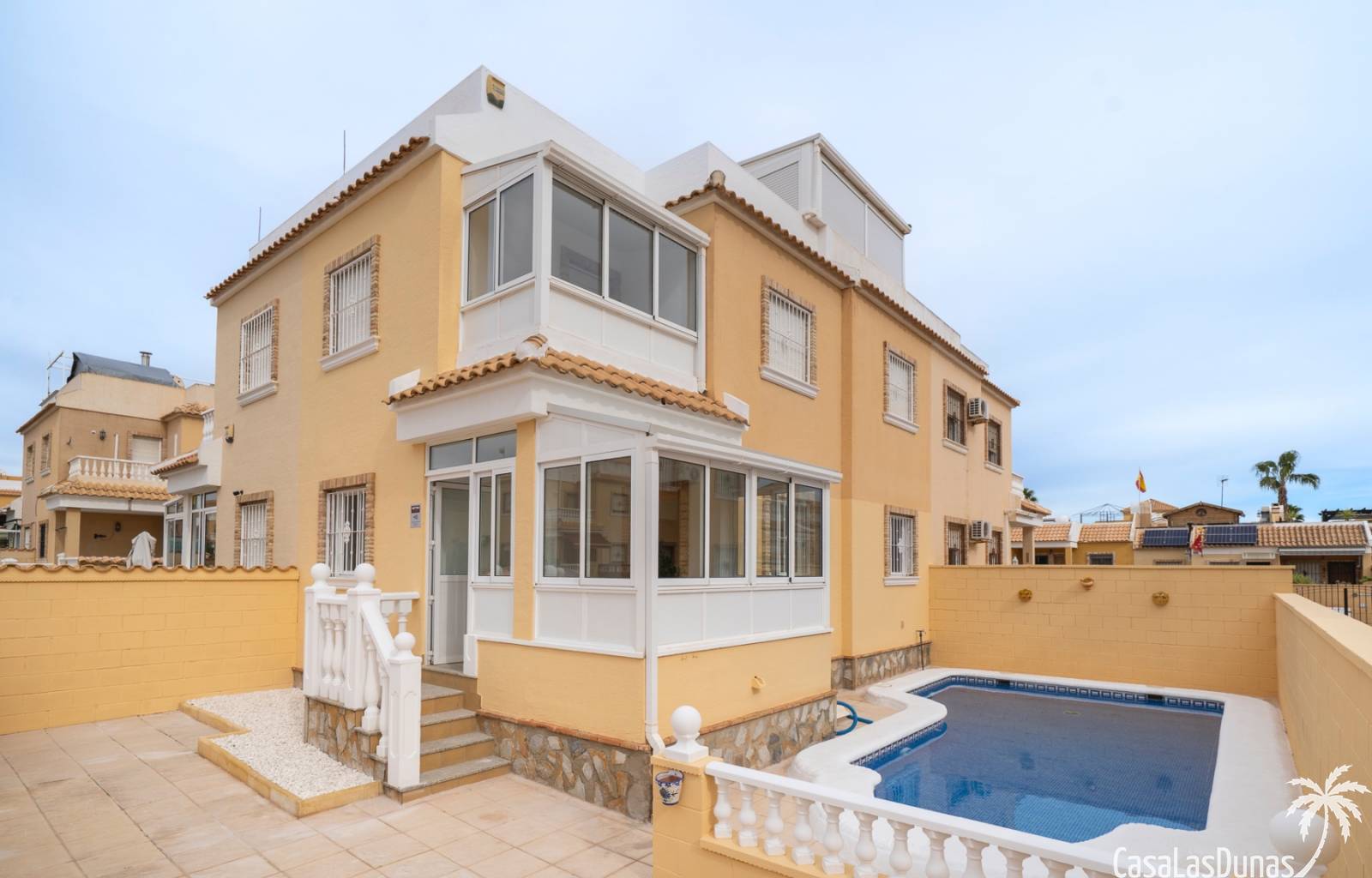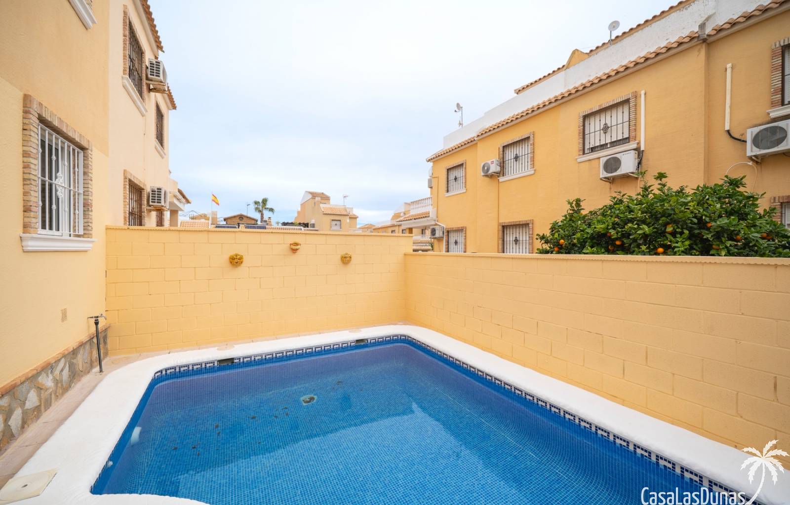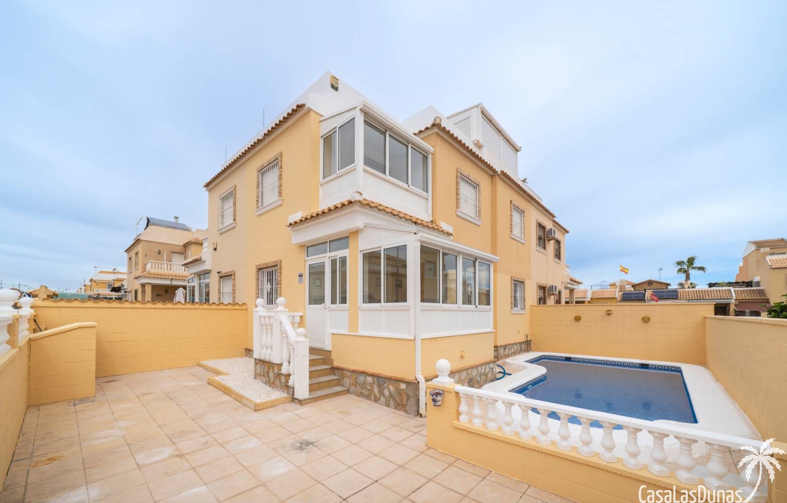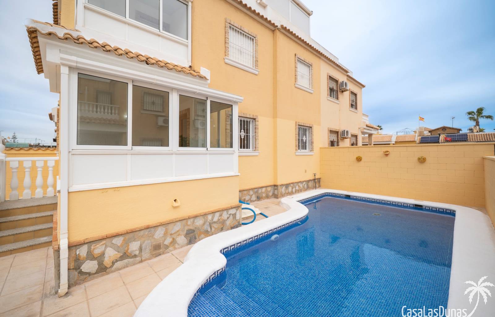 De woning is verdeeld over twee verdiepingen plus een solarium en ligt op een privéperceel met tuin en eigen zwembad, binnen een residentie met twee gemeenschappelijke zwembaden in Ciudad Quesada (Rojales).