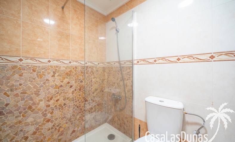 De eerste verdieping beschikt over drie slaapkamers, waarvan de hoofdslaapkamer met ingebouwde kast en toegang tot een glazen terras, evenals een tweede badkamer.