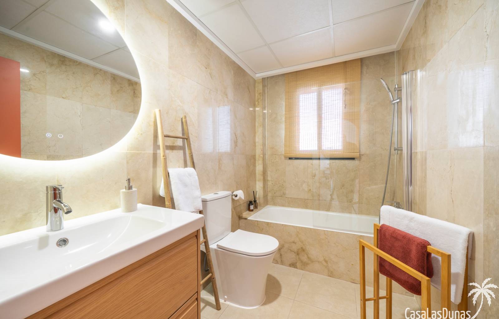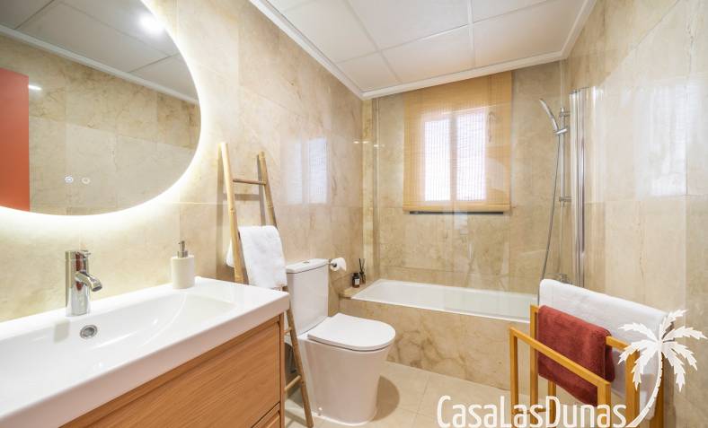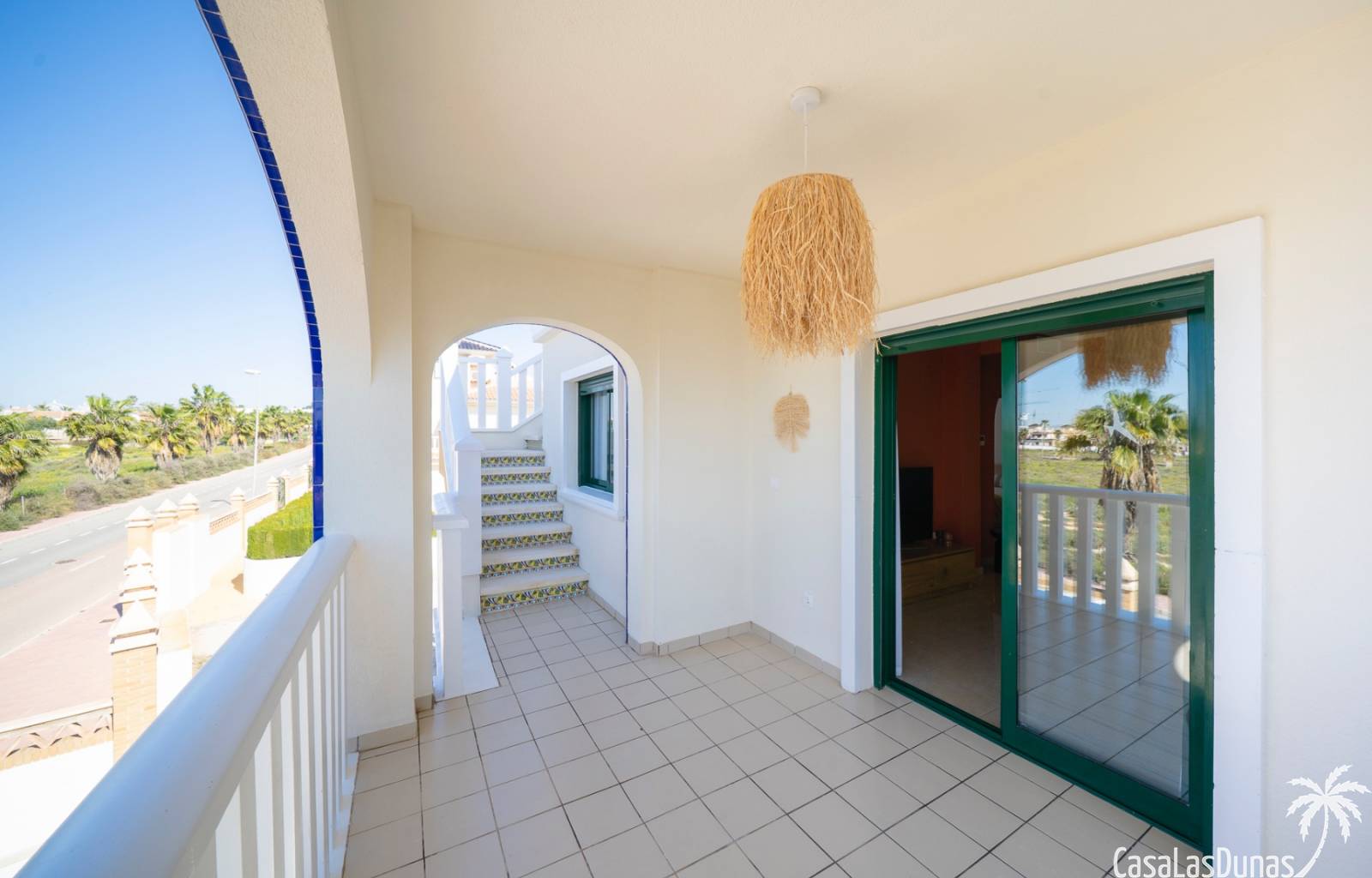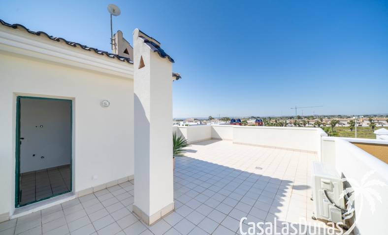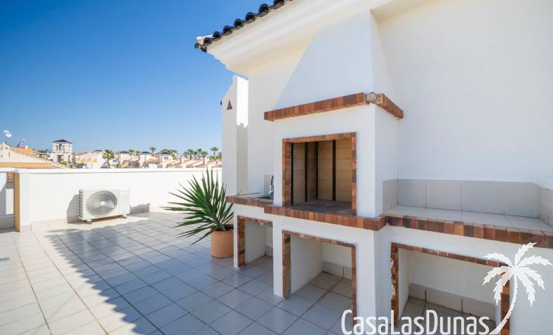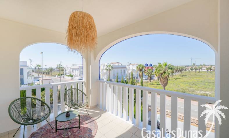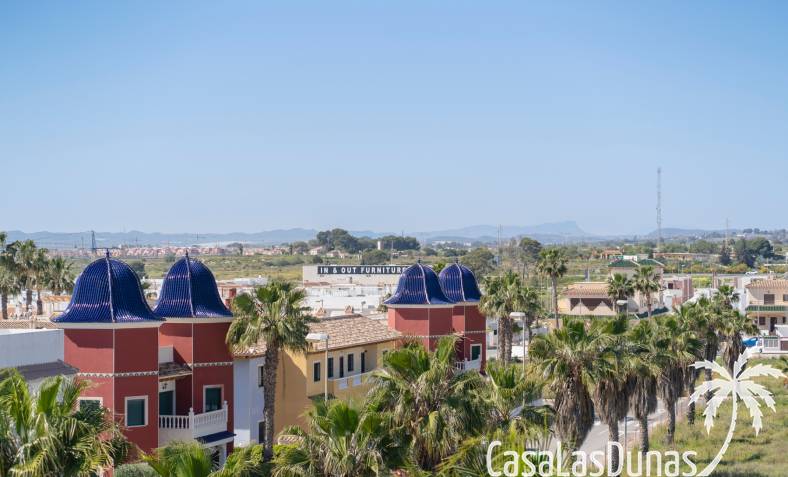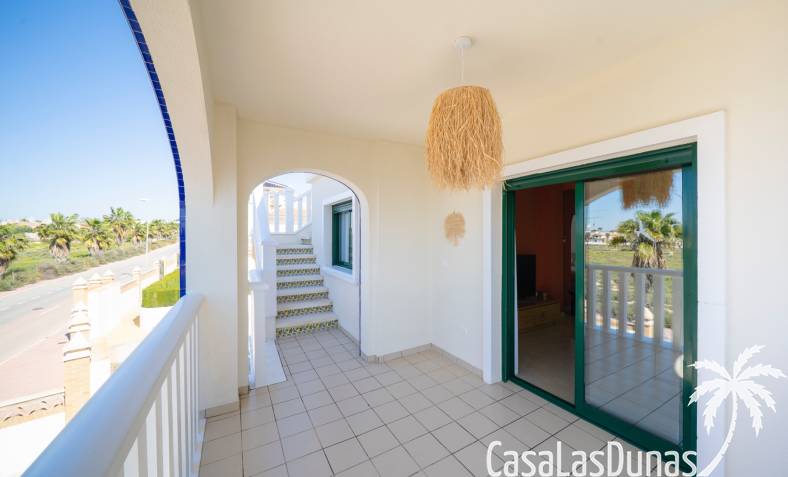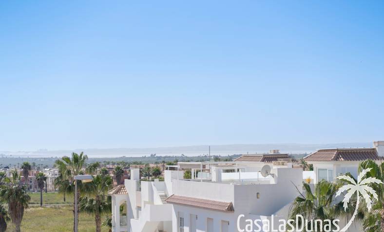 Charmant appartement op de bovenste verdieping in de populaire urbanisatie Albamar. De woning heeft een bebouwde oppervlakte van 79,27 m² en bestaat uit twee slaapkamers met inbouwkasten en één badkamer met douche. Daarnaast is er een lichte woon-eetkamer met open keuken. Vanuit de woonkamer is er directe toegang tot een ruim westgericht balkon.Gelegen op de eerste verdieping (bereikbaar via trap) en volledig gemeubileerd verkocht.Via het balkon leidt een buitentrap naar een groot privé solarium met berging en gemetselde barbecue, met uitzicht op de zoutmeren van Torrevieja en La Mata.