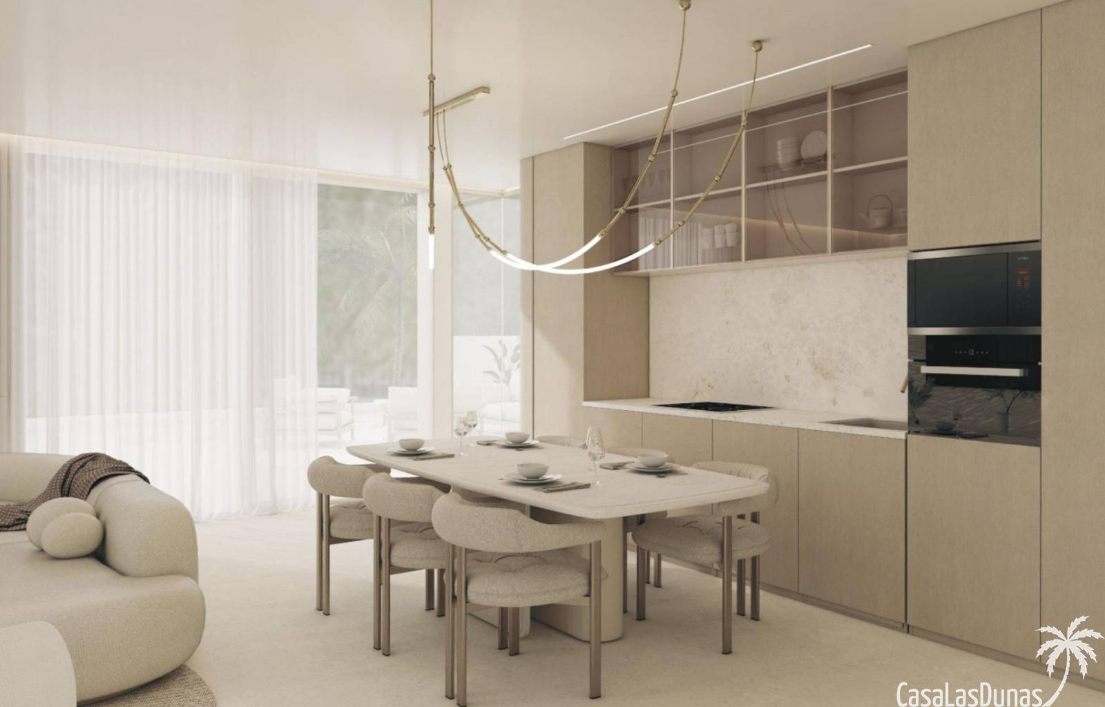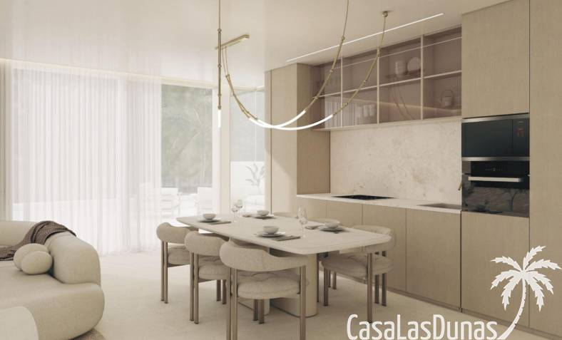 De begane grond beschikt over een open woon- en eetkamer met een volledig uitgeruste moderne keuken, één slaapkamer met en-suite badkamer en een gastentoilet. Grote ramen bieden directe toegang tot het buitenterras en het indrukwekkende infinity-zwembad.